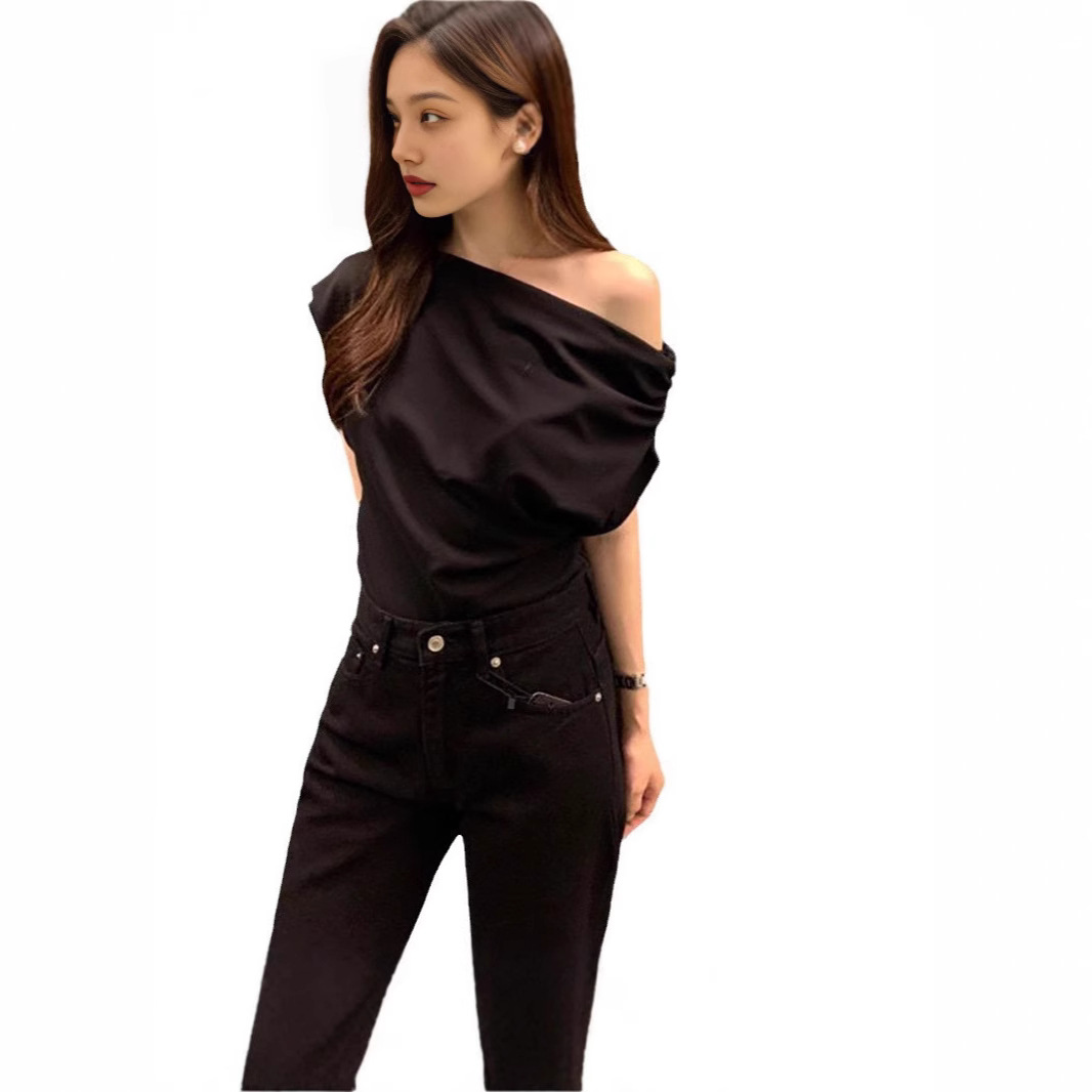 韩国chic上衣夏季新款小众不规则斜肩设计感宽松纯色套头短袖T恤
