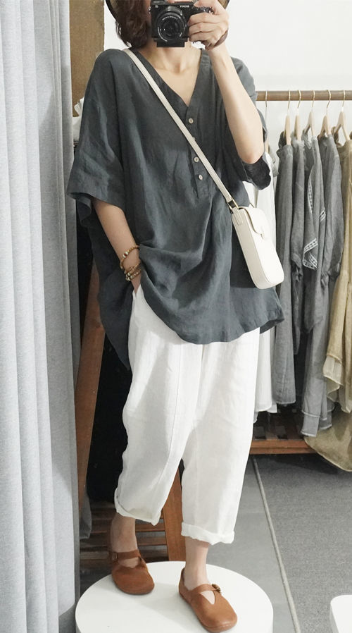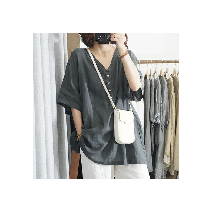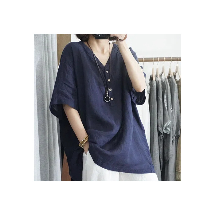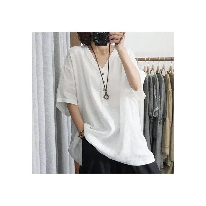 棉麻纯色t恤夏季薄款大码女装T恤时尚百搭V领休闲上衣女