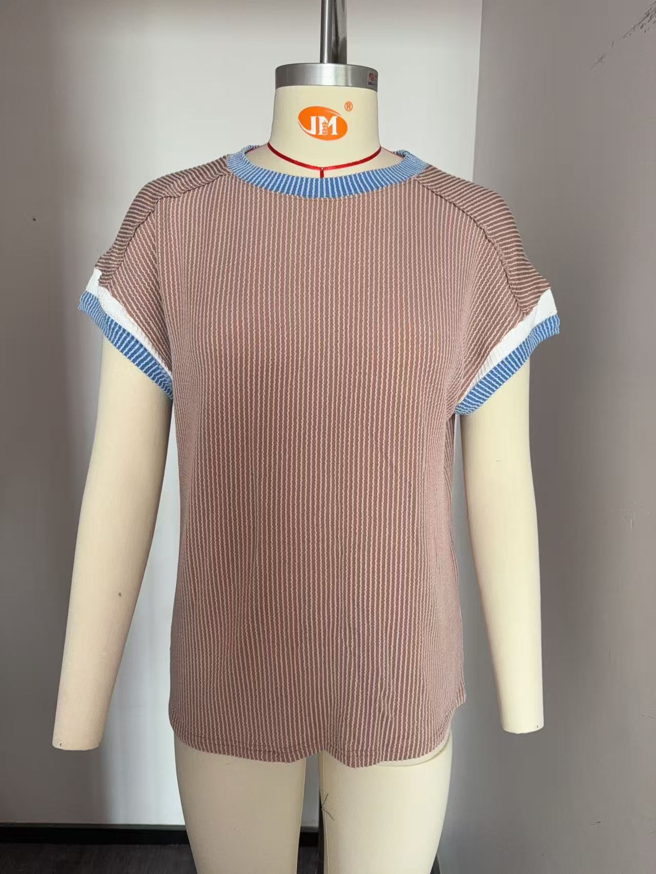 亚马逊外贸欧美跨境2025夏季新款圆领外缝扭扭条短袖宽松拼色T恤