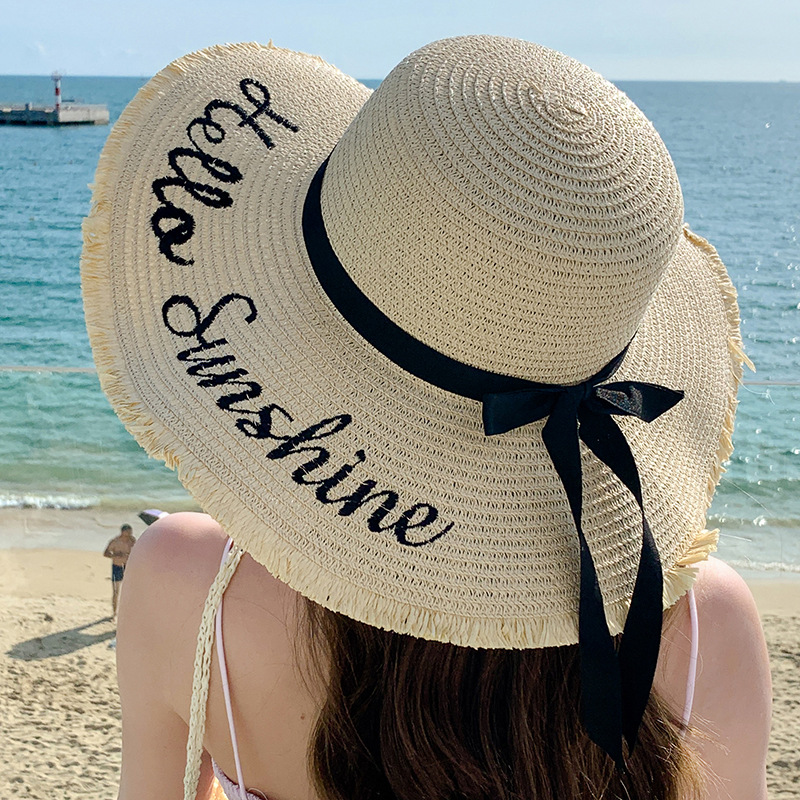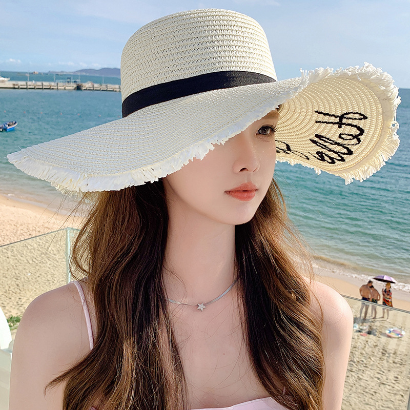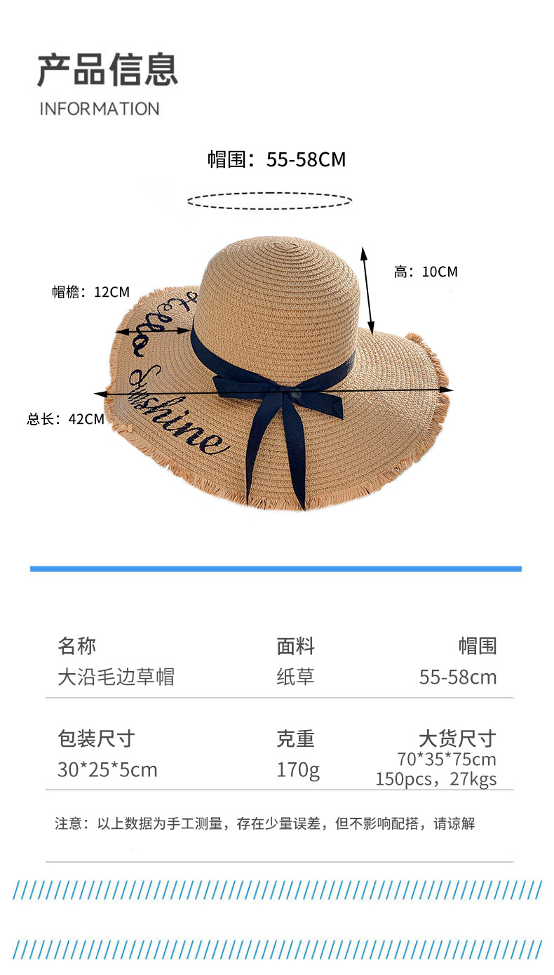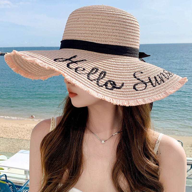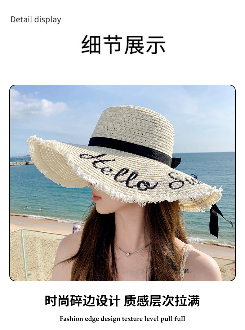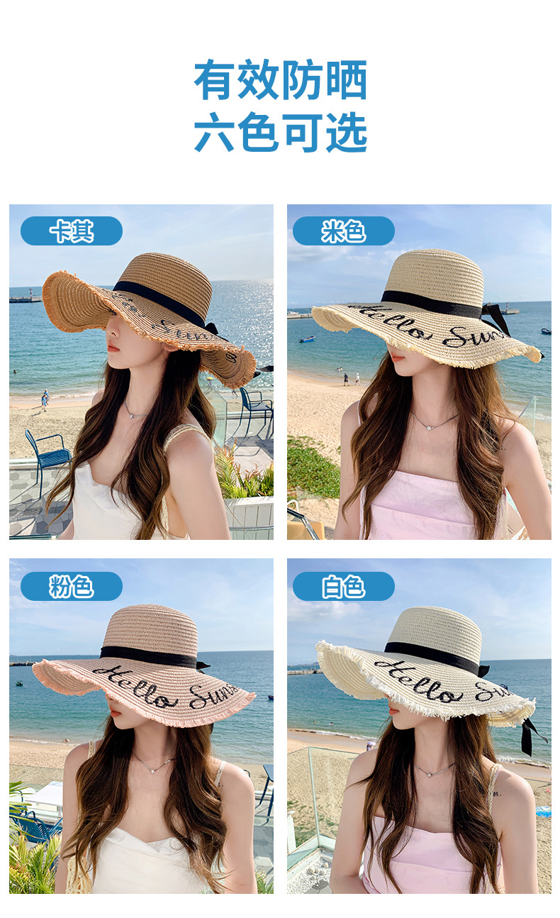 夏天遮阳帽女新款时尚气质大沿绣花字母太阳帽户外海边大帽檐草帽