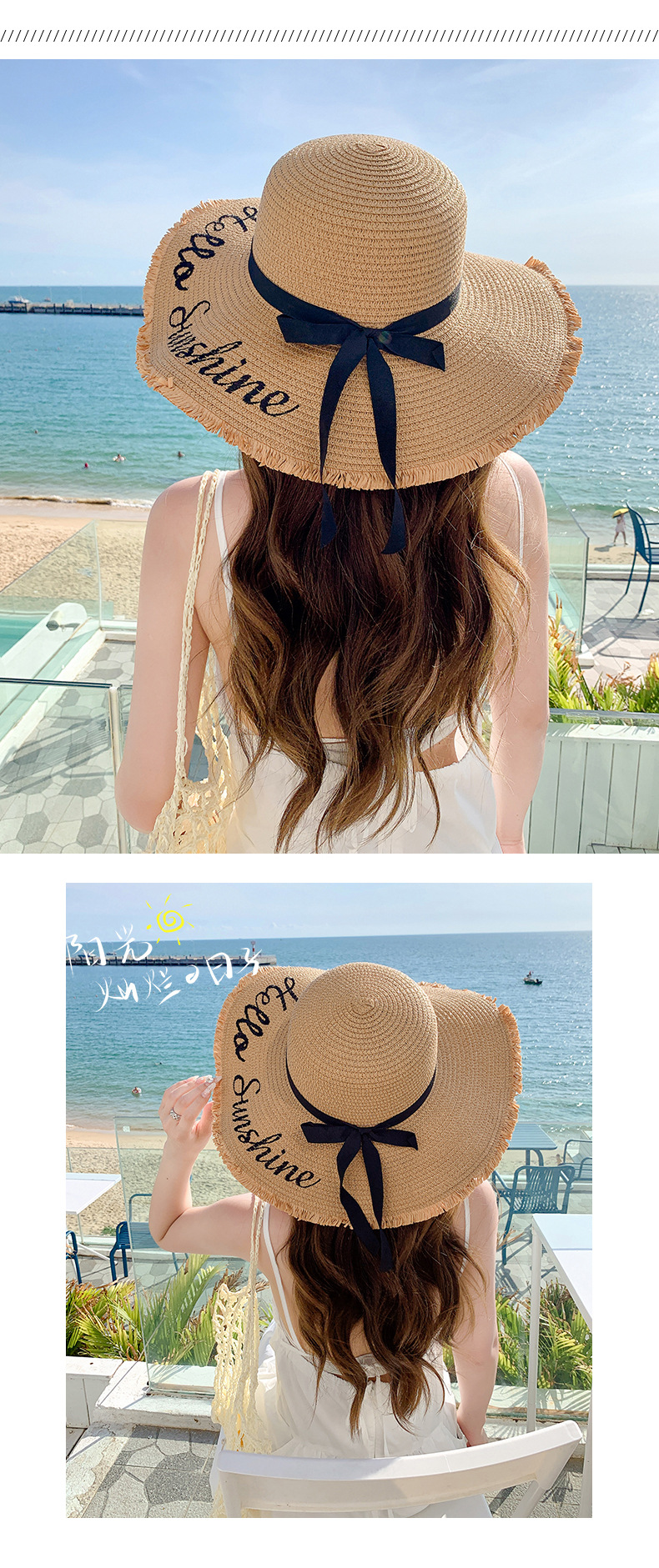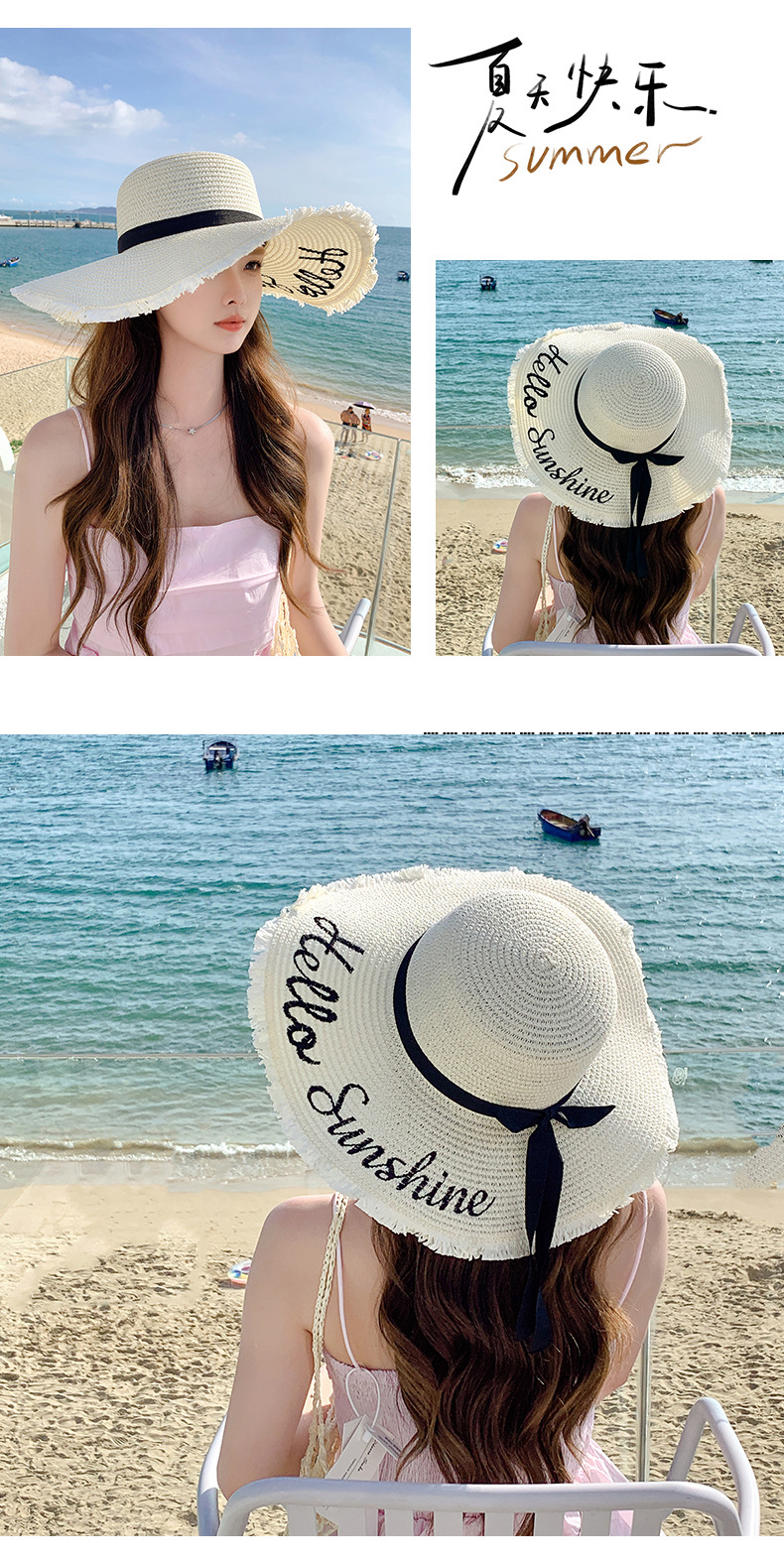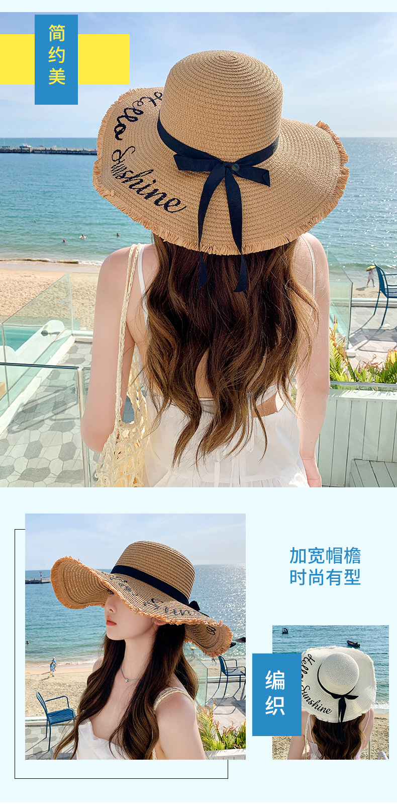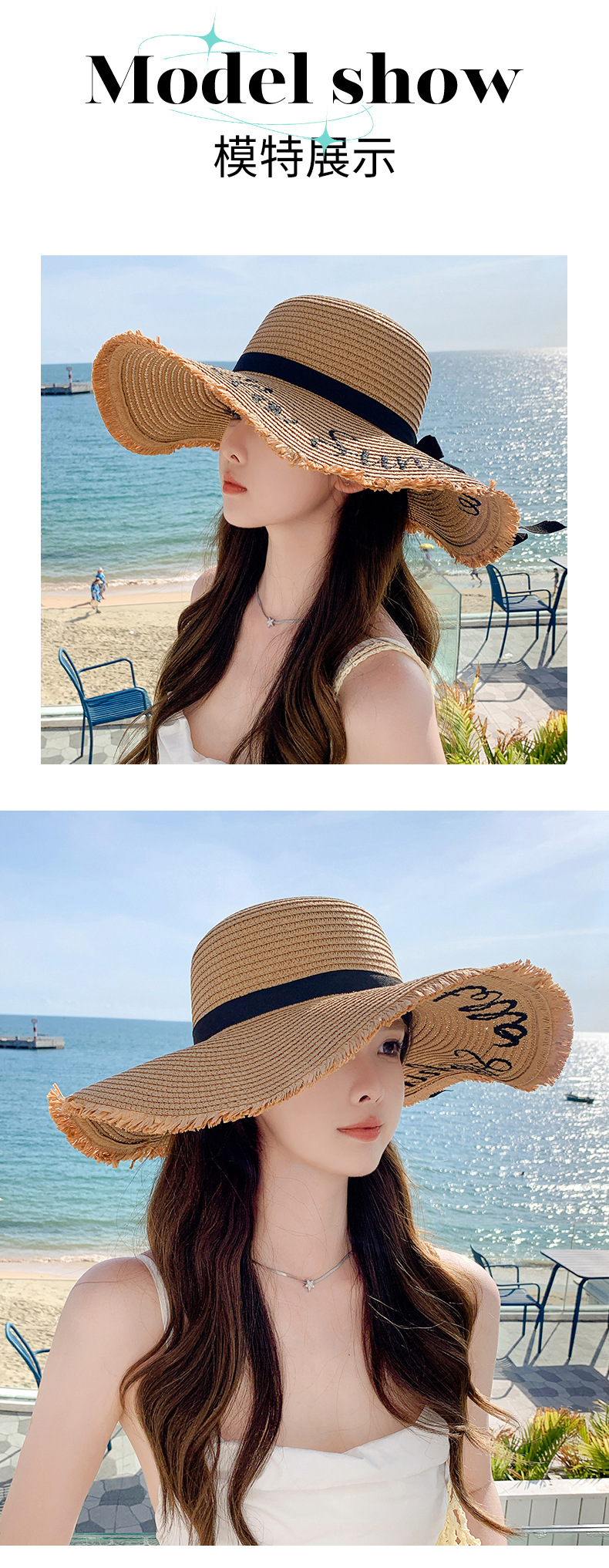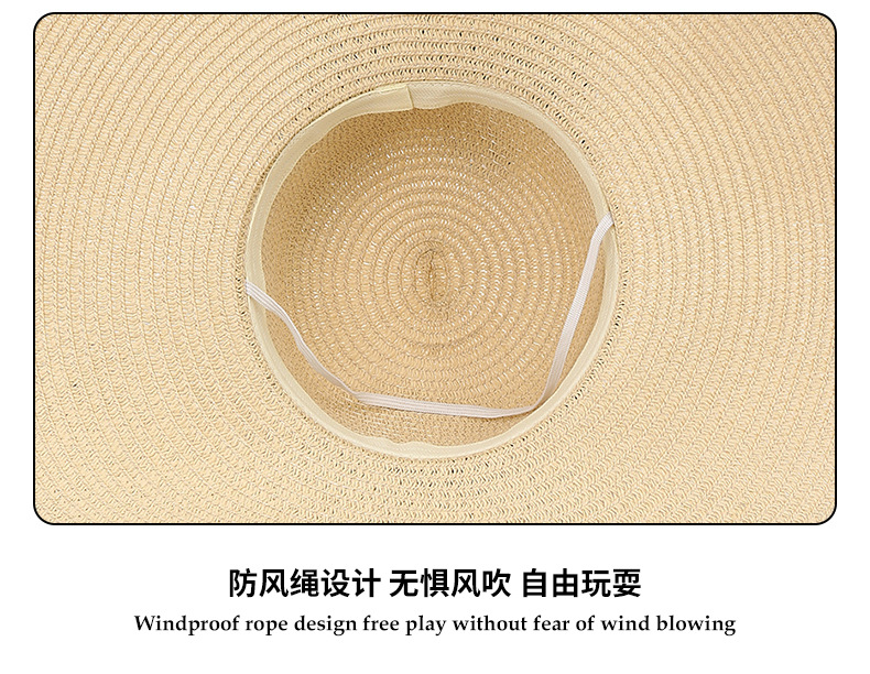 夏天遮阳帽女新款时尚气质大沿绣花字母太阳帽户外海边大帽檐草帽