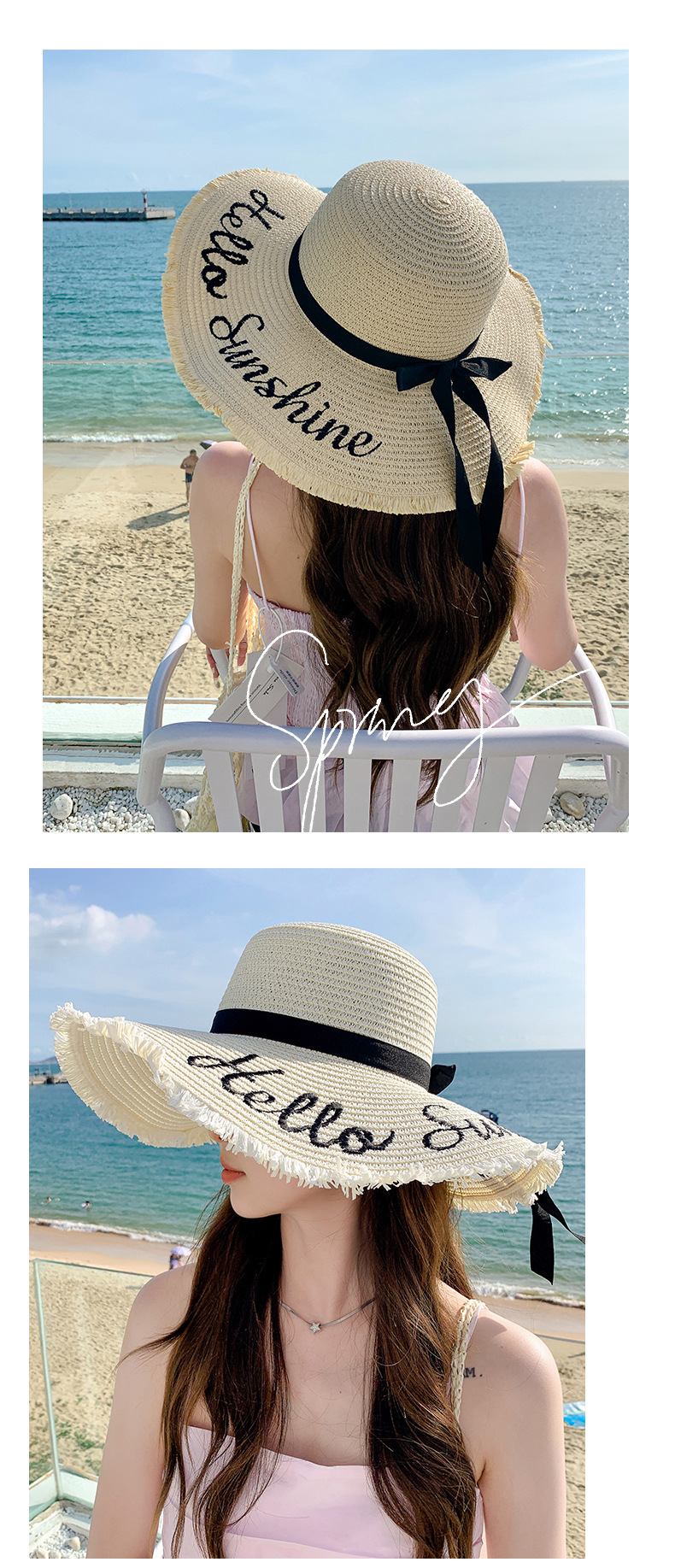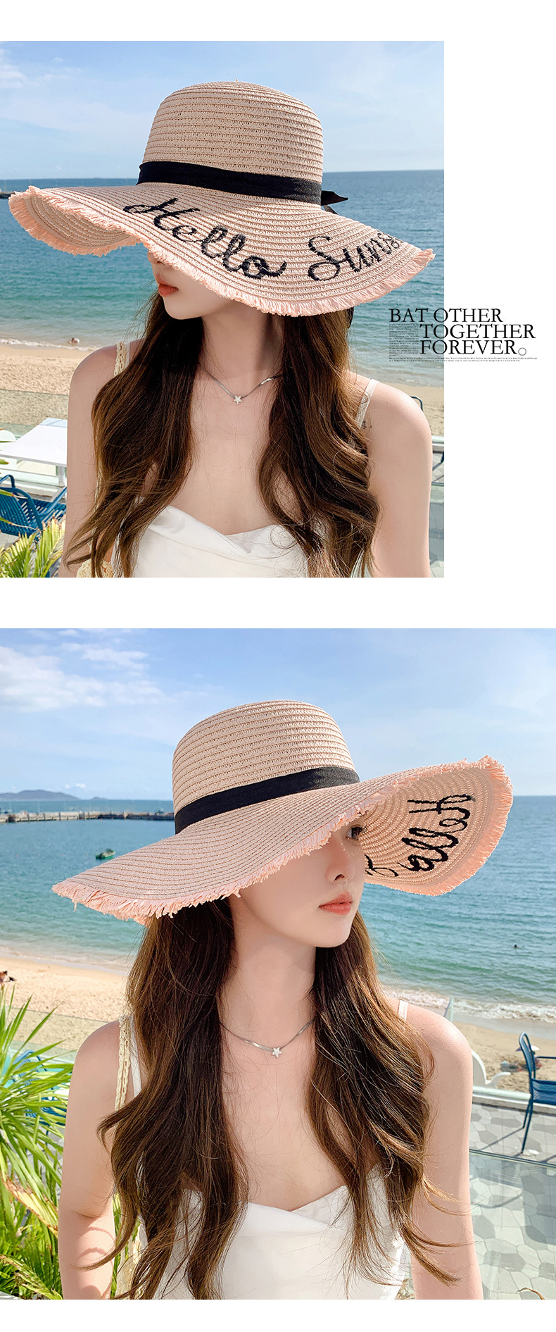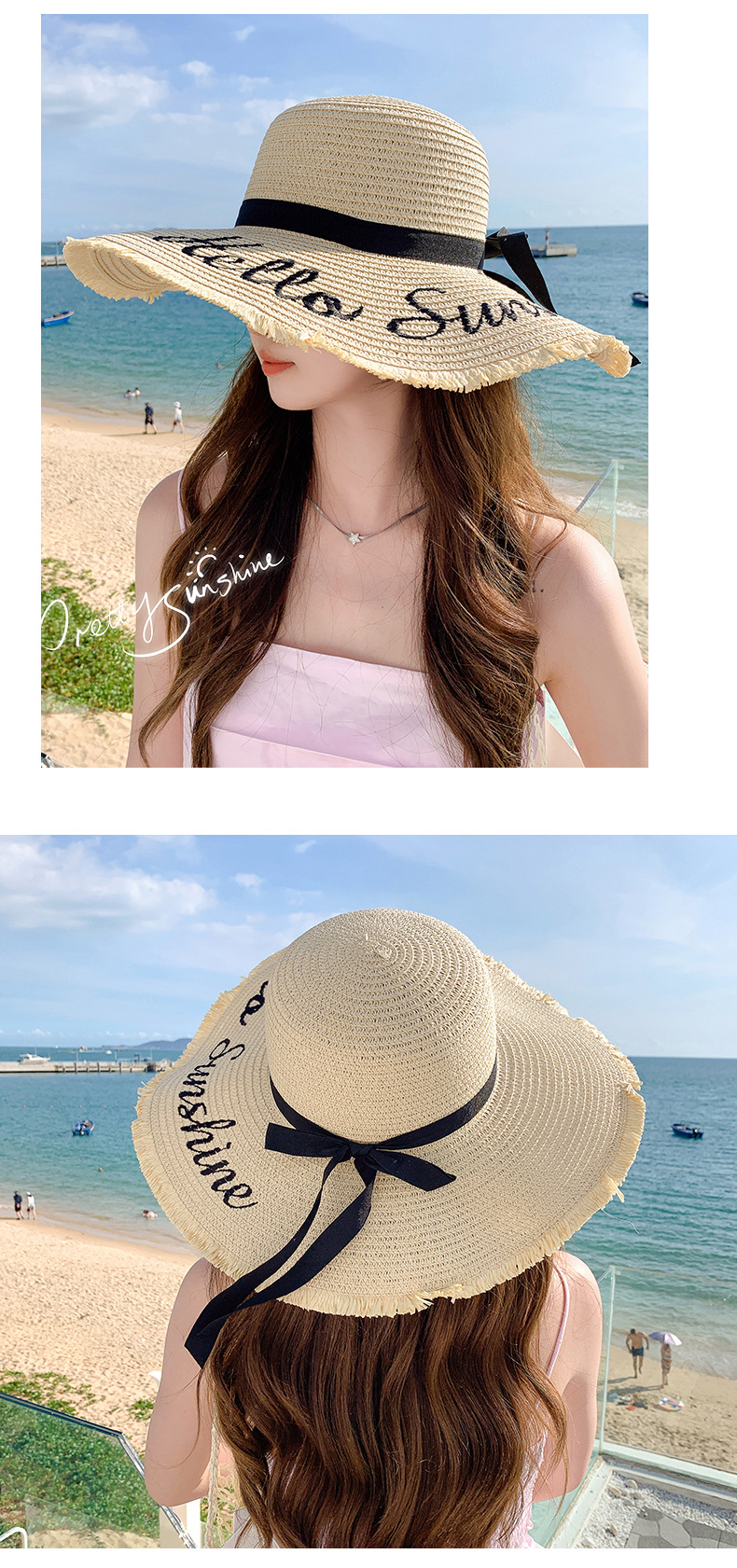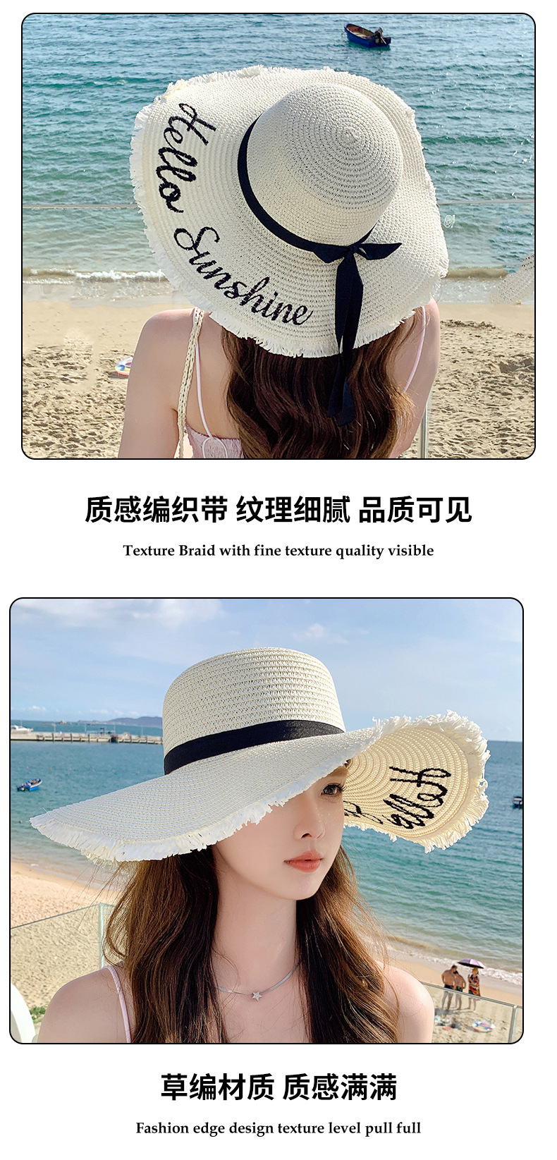 夏天遮阳帽女新款时尚气质大沿绣花字母太阳帽户外海边大帽檐草帽