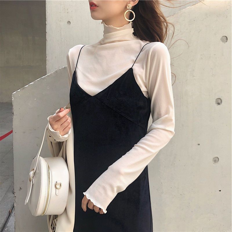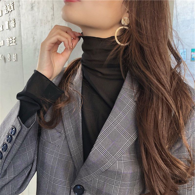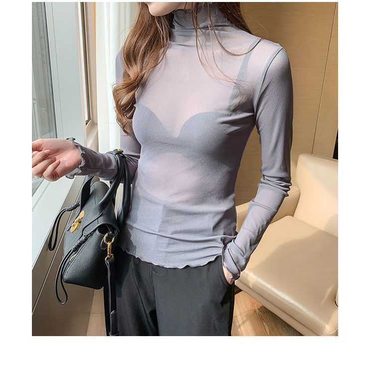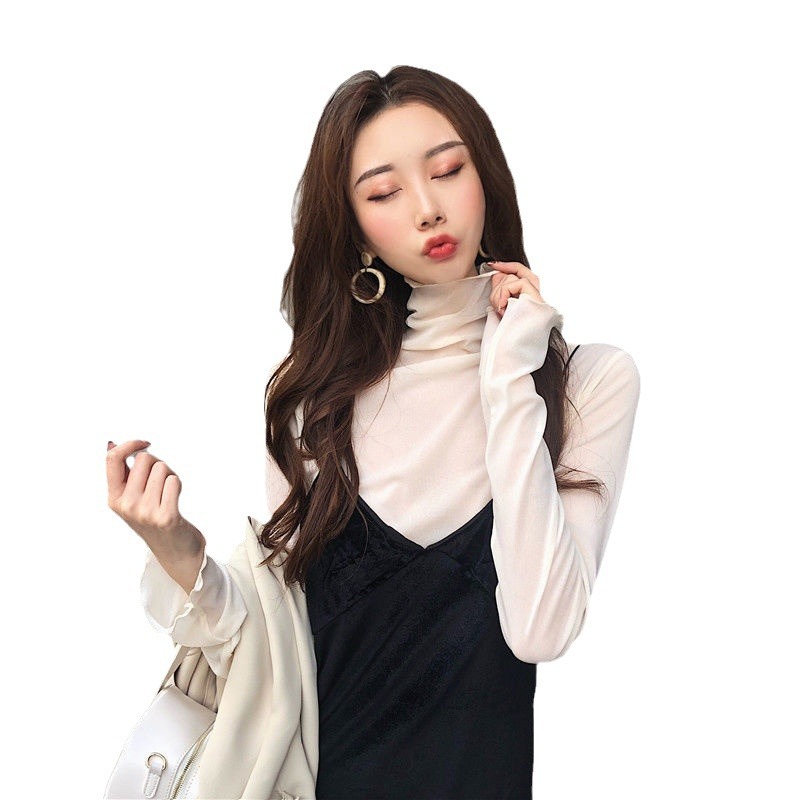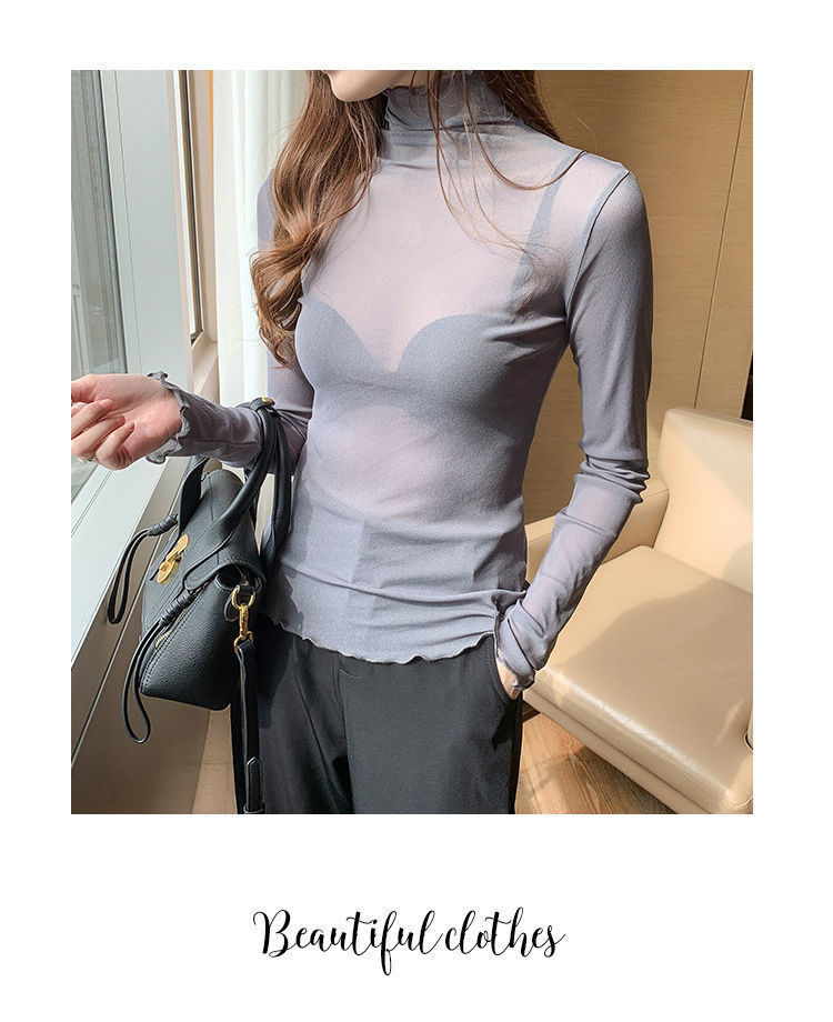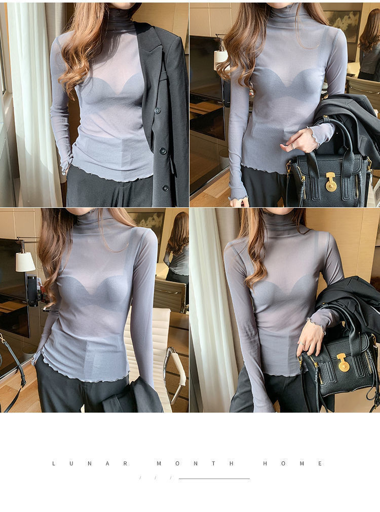 修身高领内搭长袖蕾丝打底衫女薄款网纱上衣春秋白色木耳边T恤潮