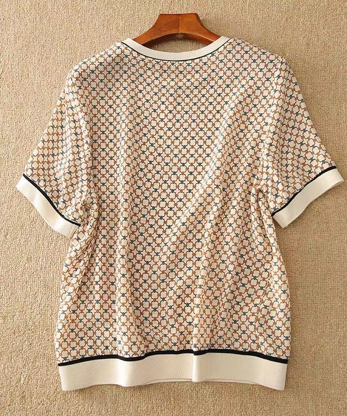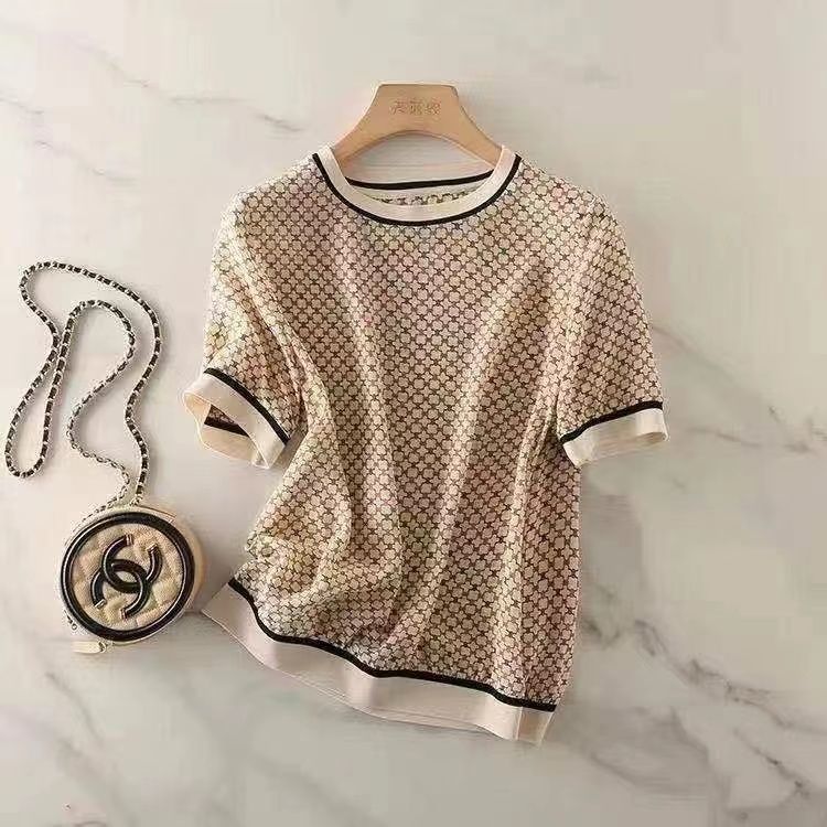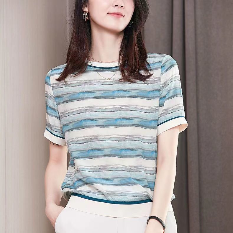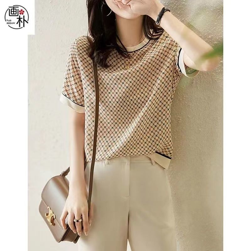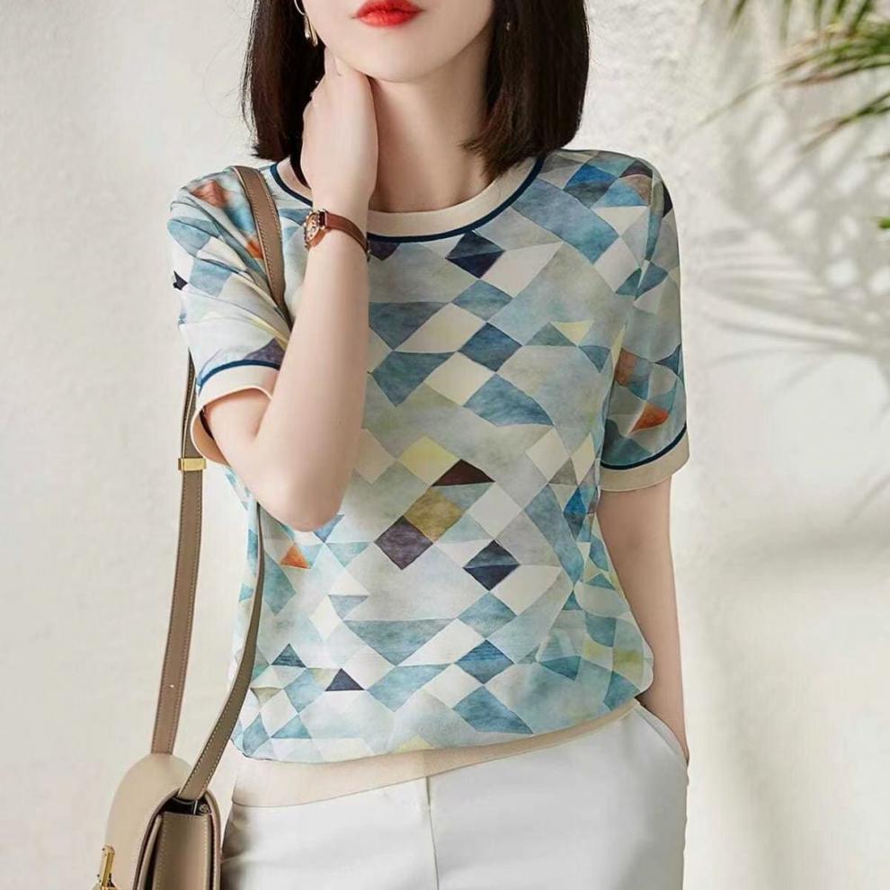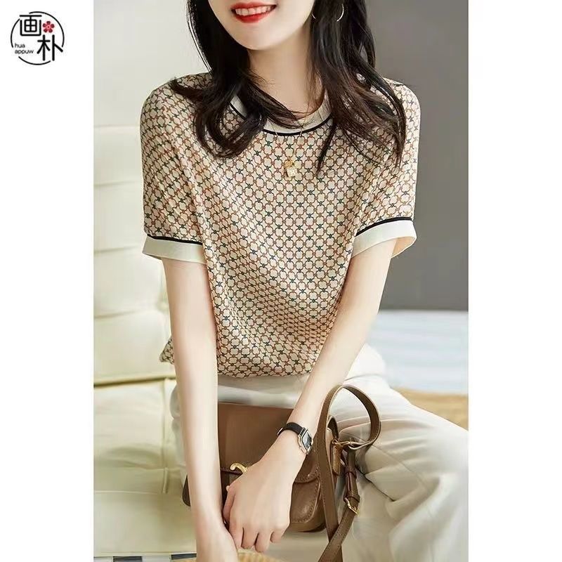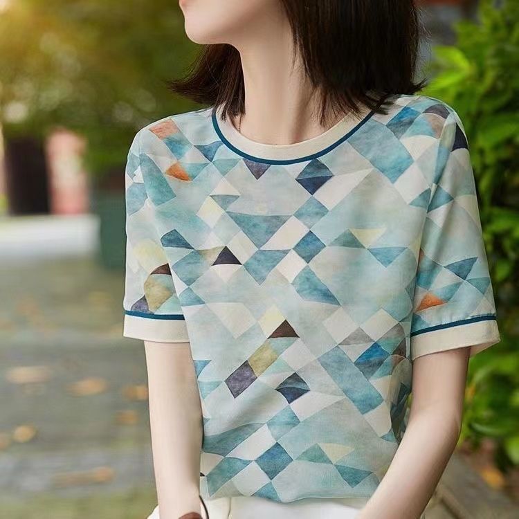 仿真丝宽松显瘦冰丝上衣女2023夏新款印花雪纺衫时尚气质短袖T恤