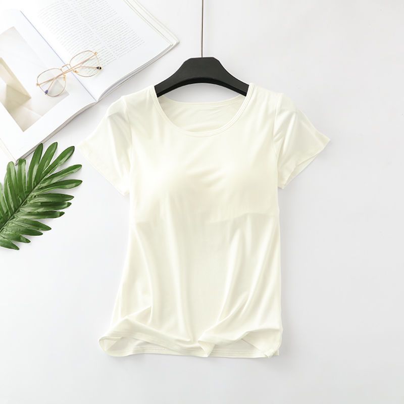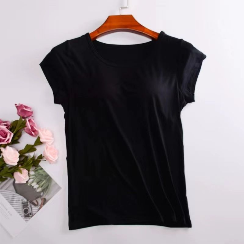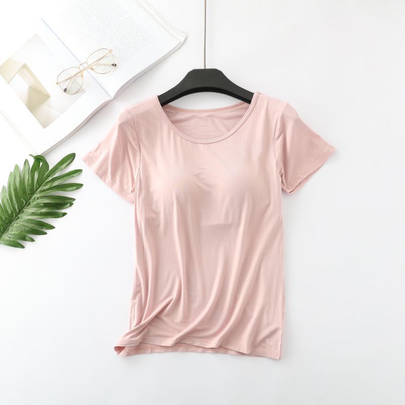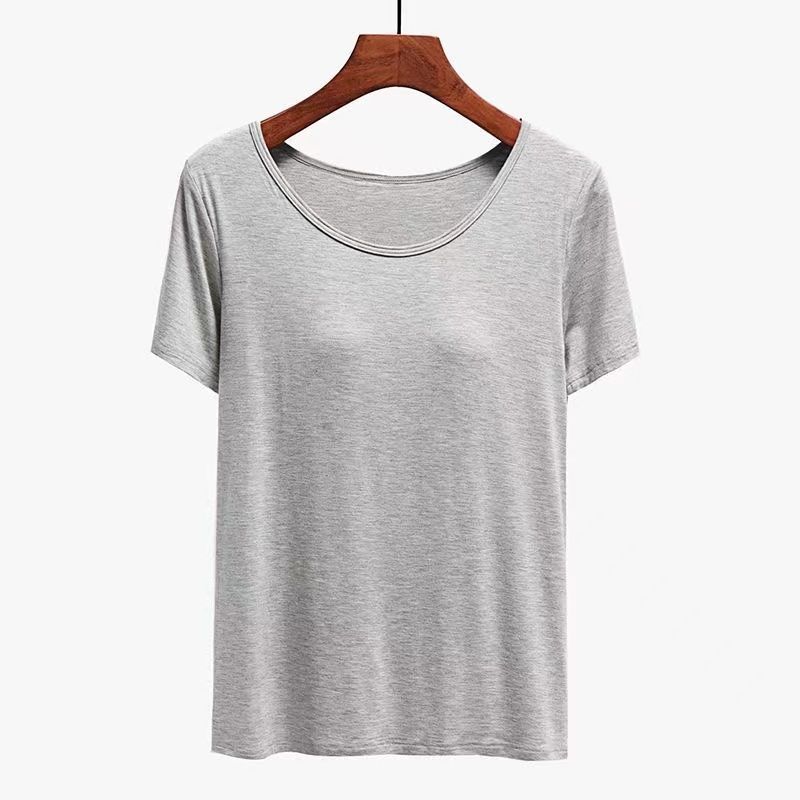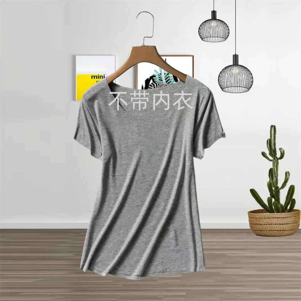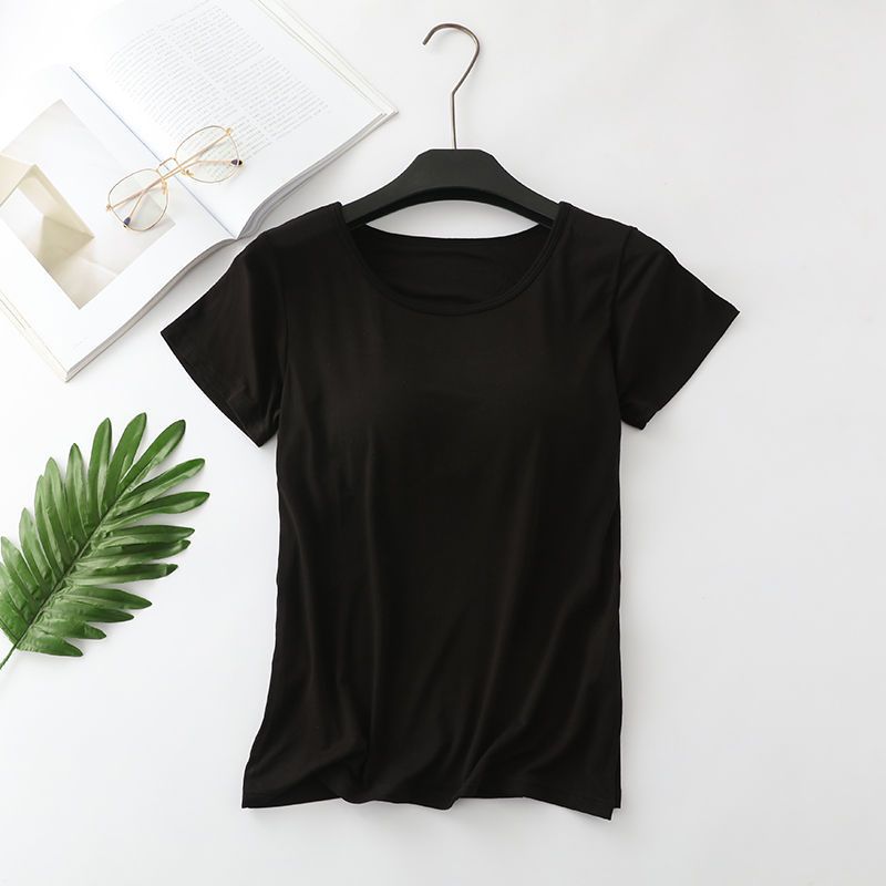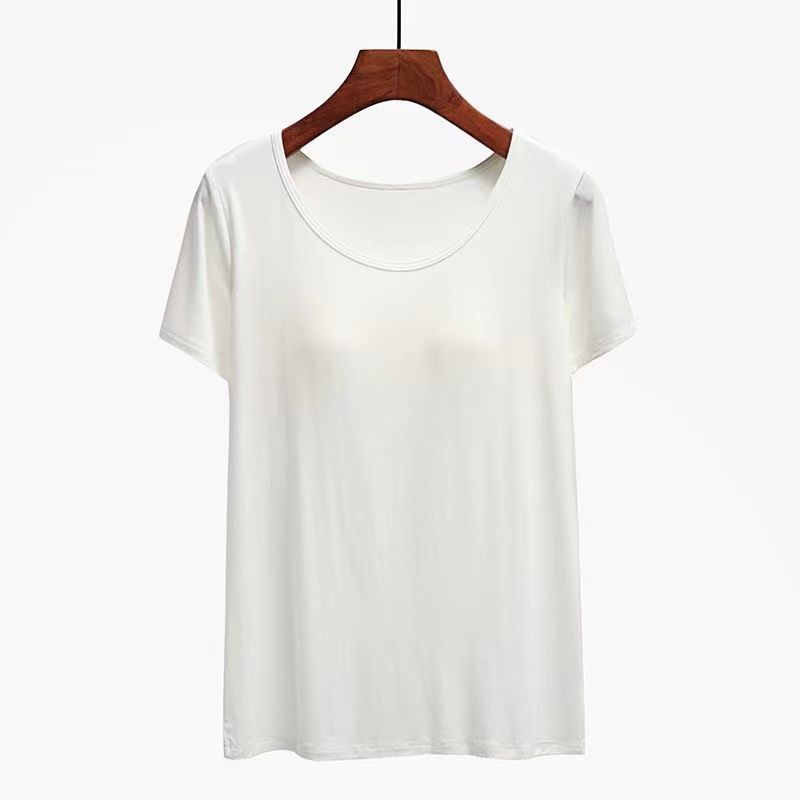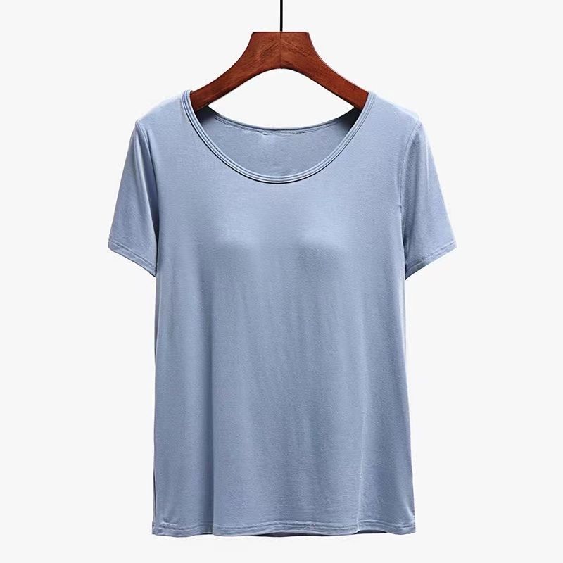 带胸垫莫代尔短袖t恤女夏外穿居家薄上衣大码宽松百搭圆领打底衫