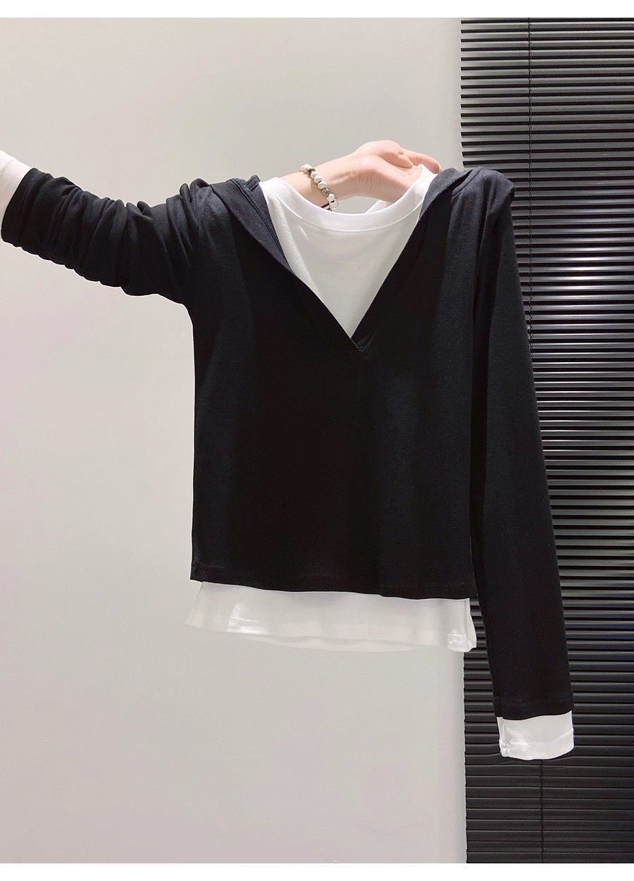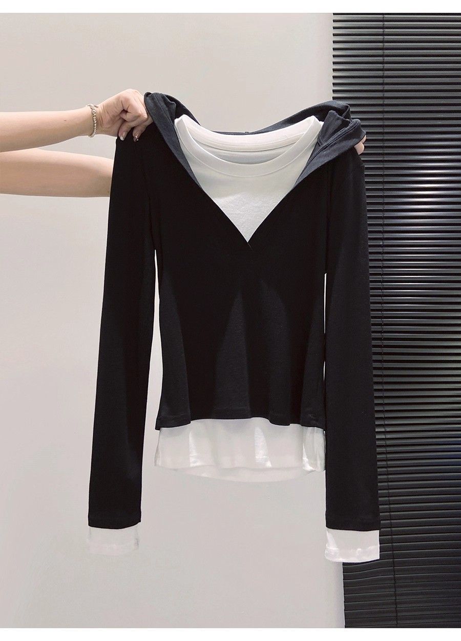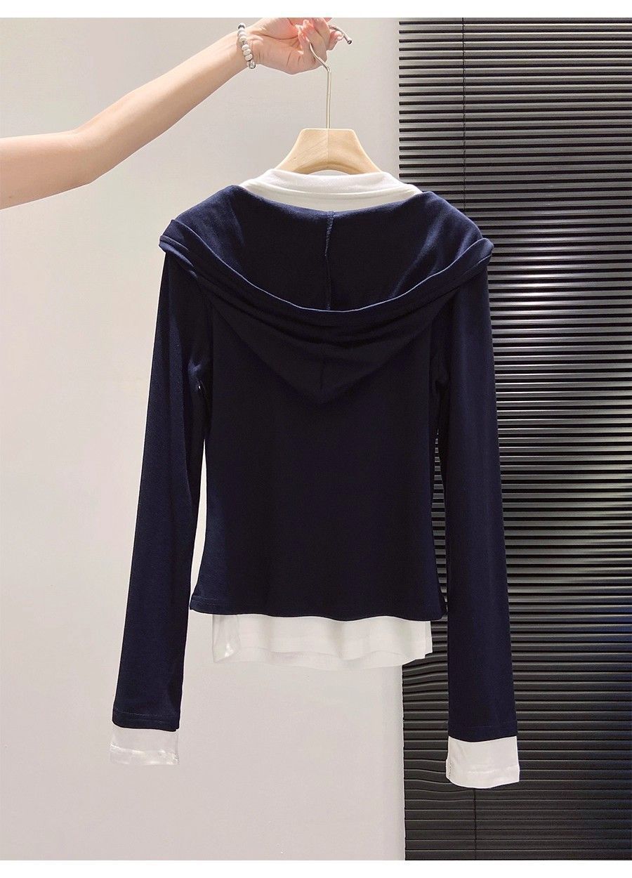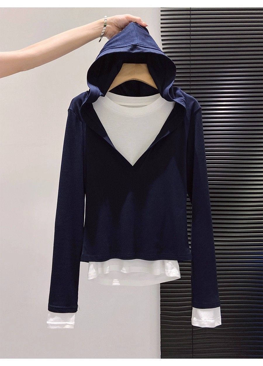 假两件打底女2026早秋季新款高级感设计撞色长袖T恤连帽小衫上衣
