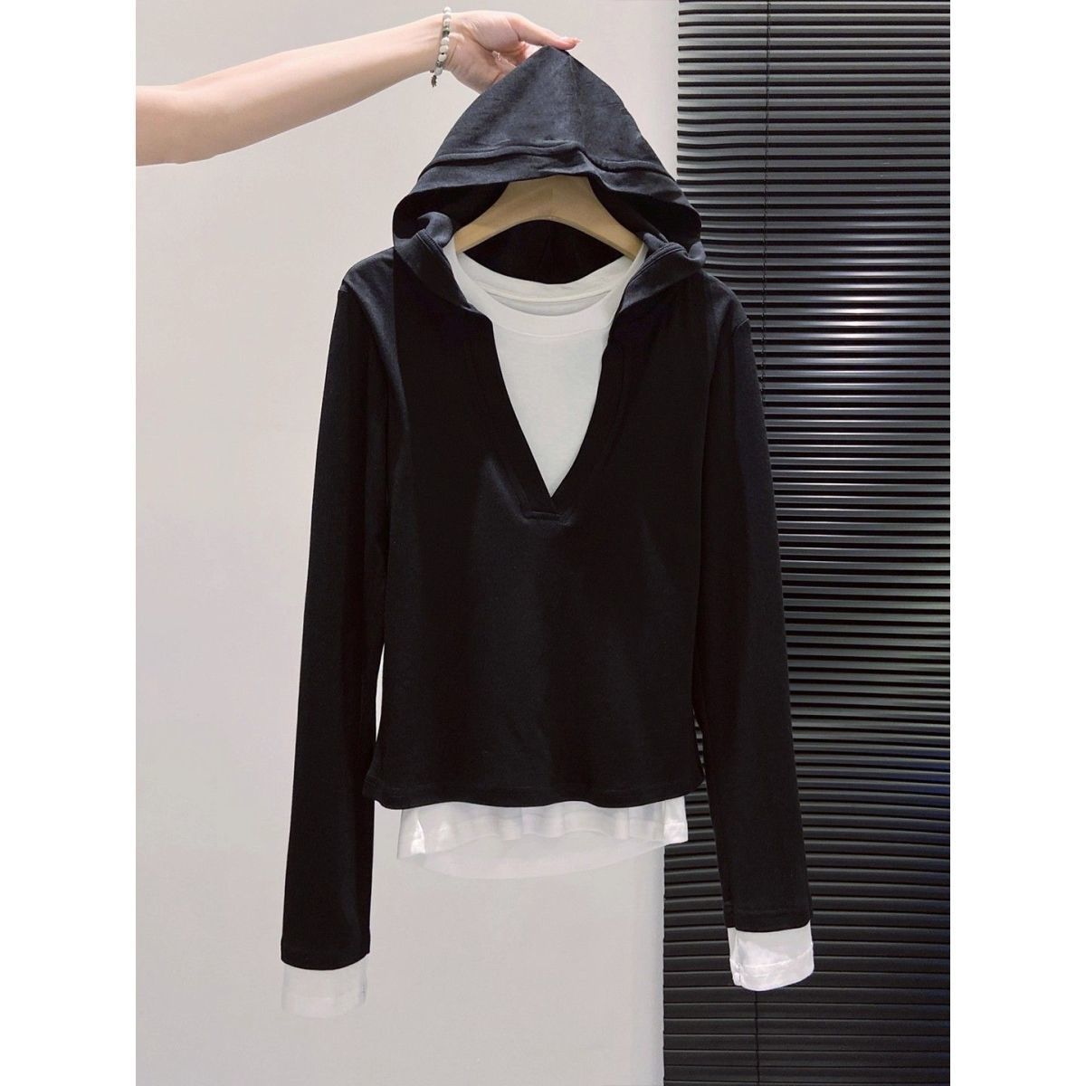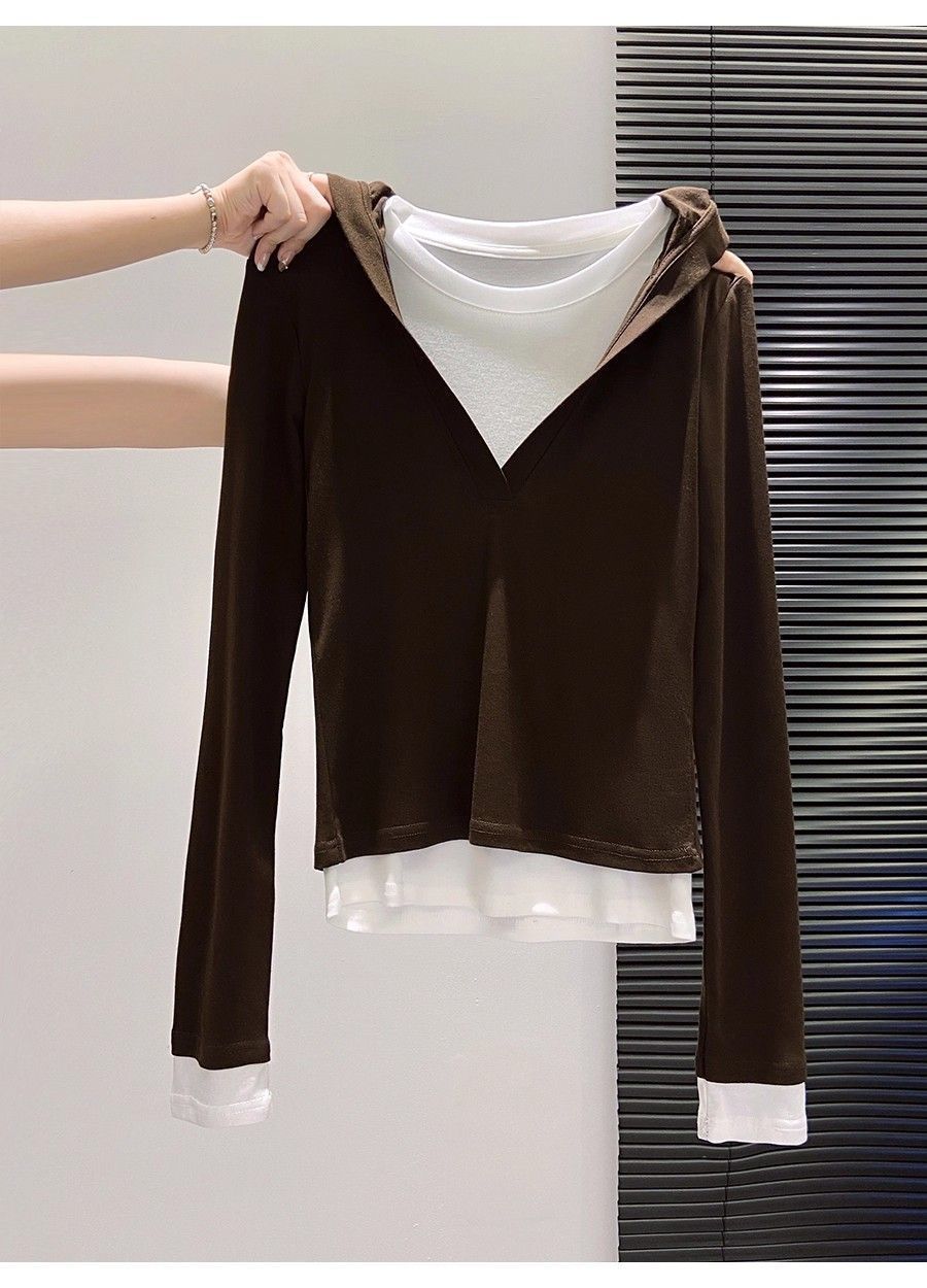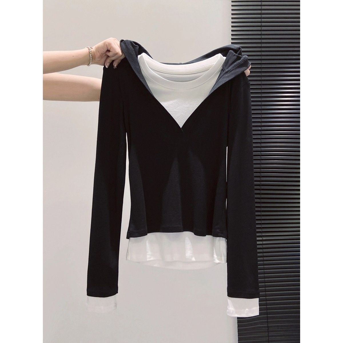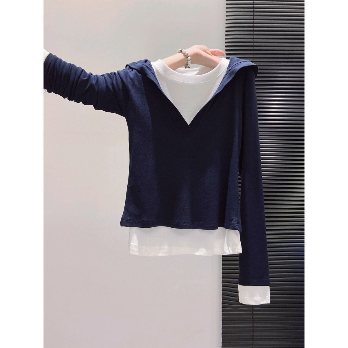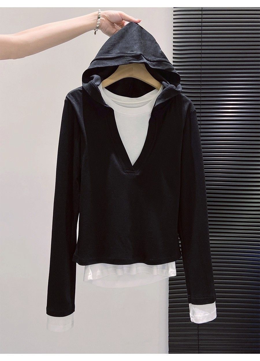假两件打底女2026早秋季新款高级感设计撞色长袖T恤连帽小衫上衣