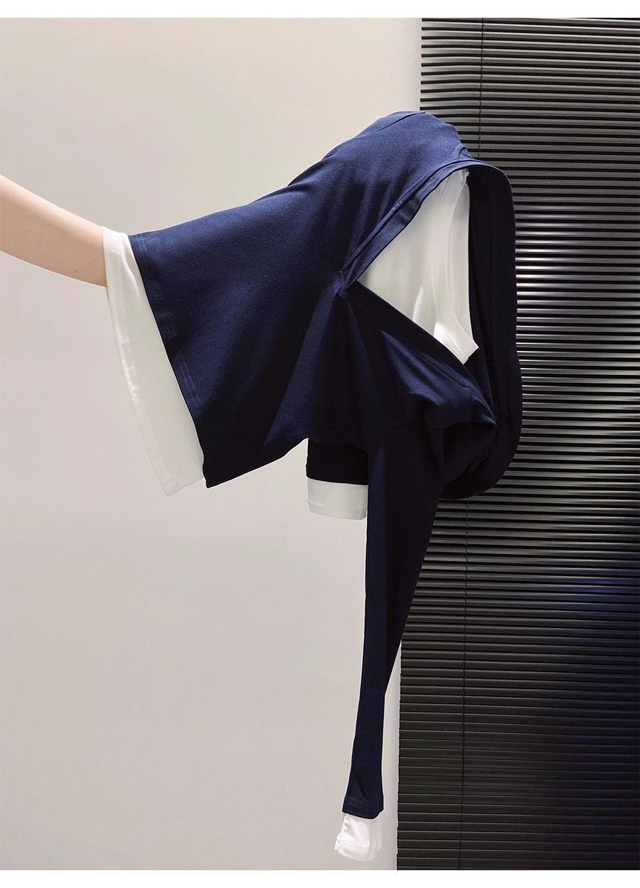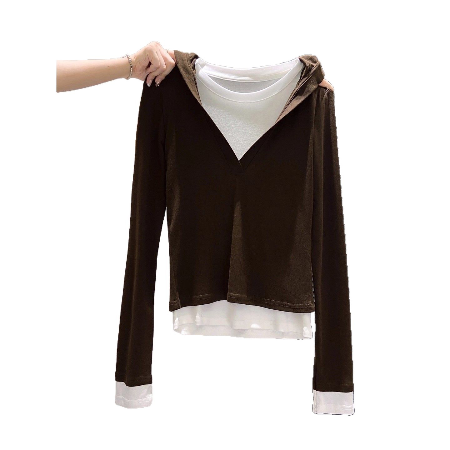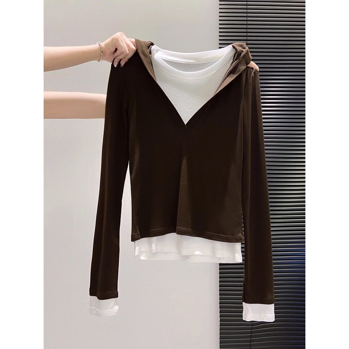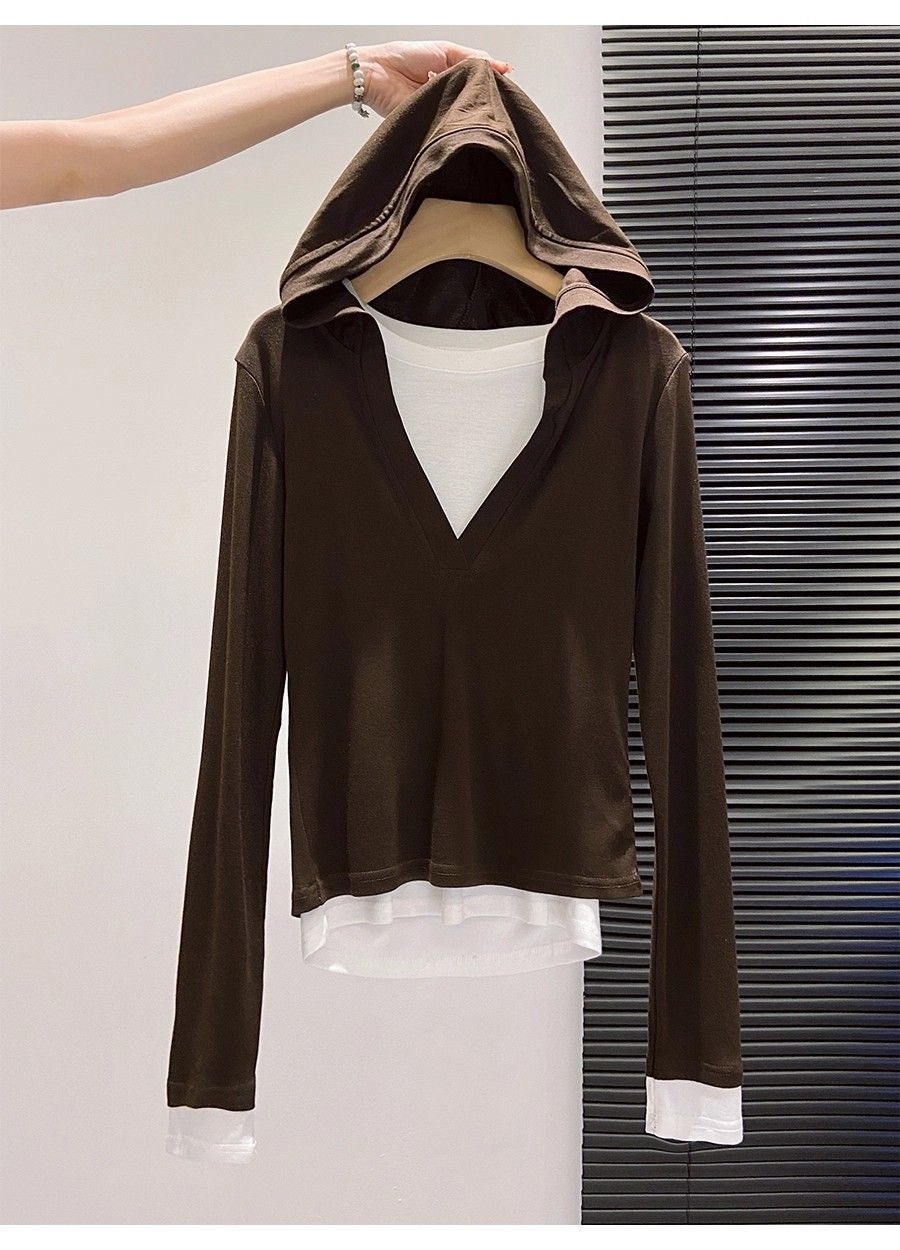 假两件打底女2026早秋季新款高级感设计撞色长袖T恤连帽小衫上衣