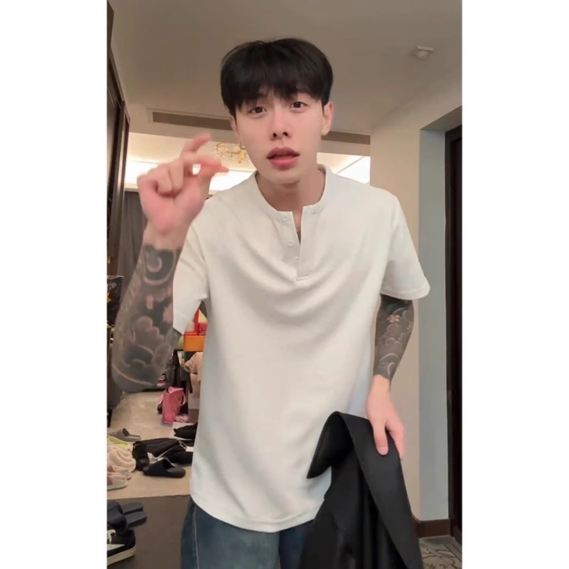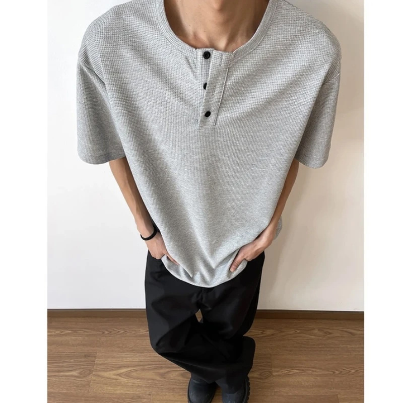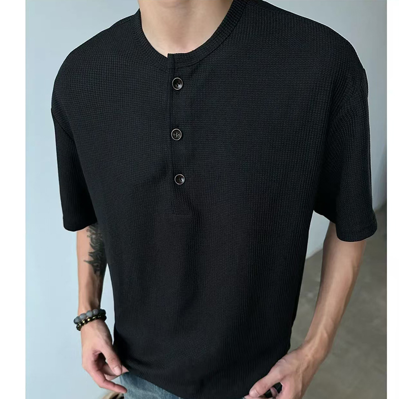 重磅华夫格亨利领短袖T恤男春夏季美式潮牌纯色宽松休闲半袖体恤