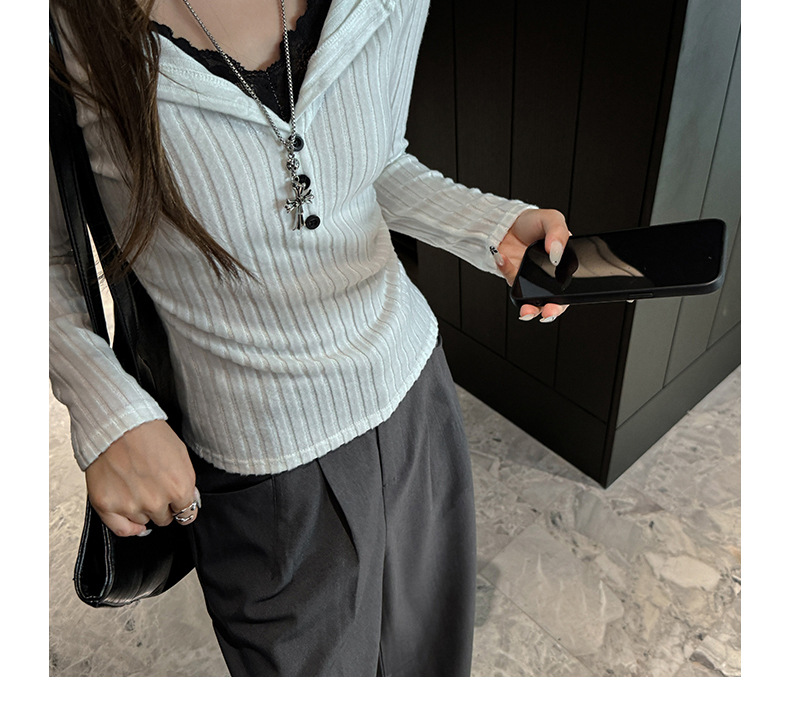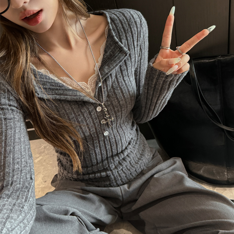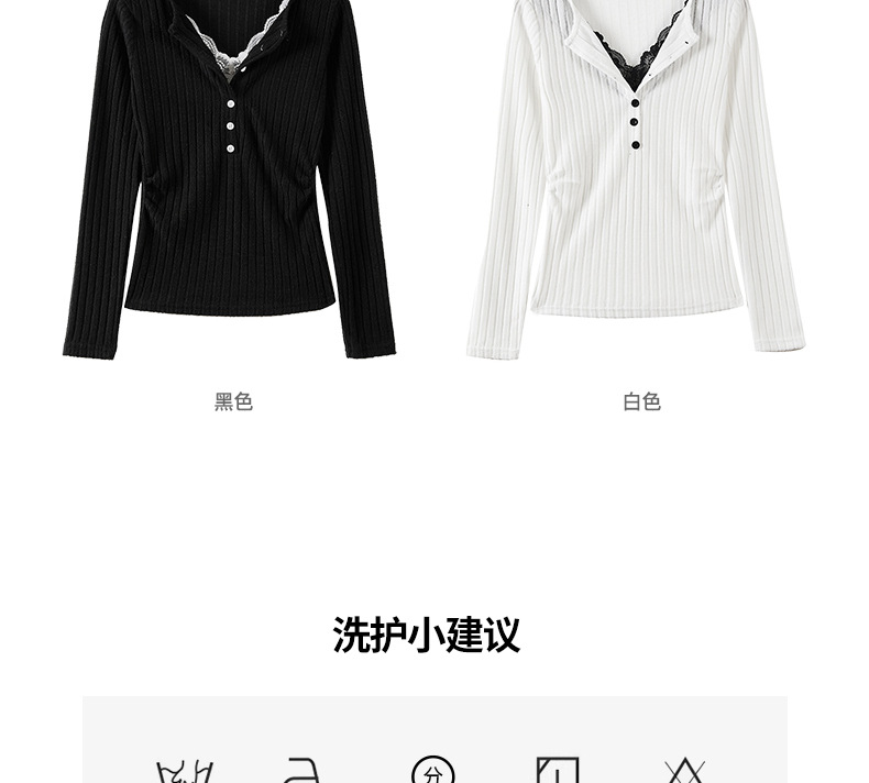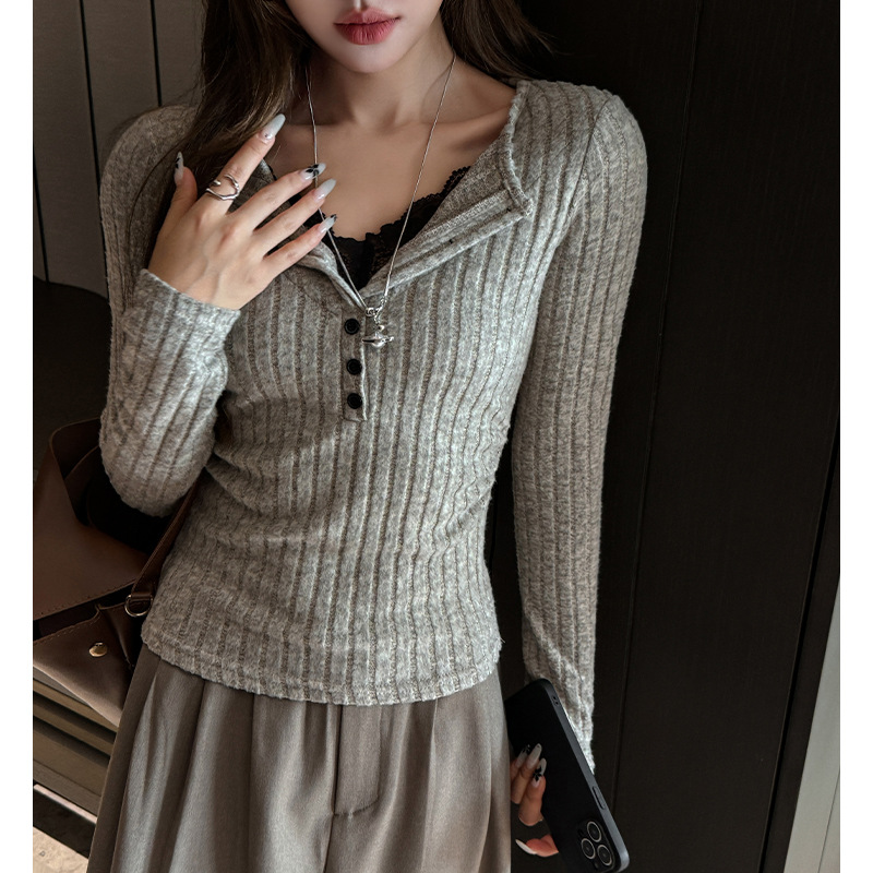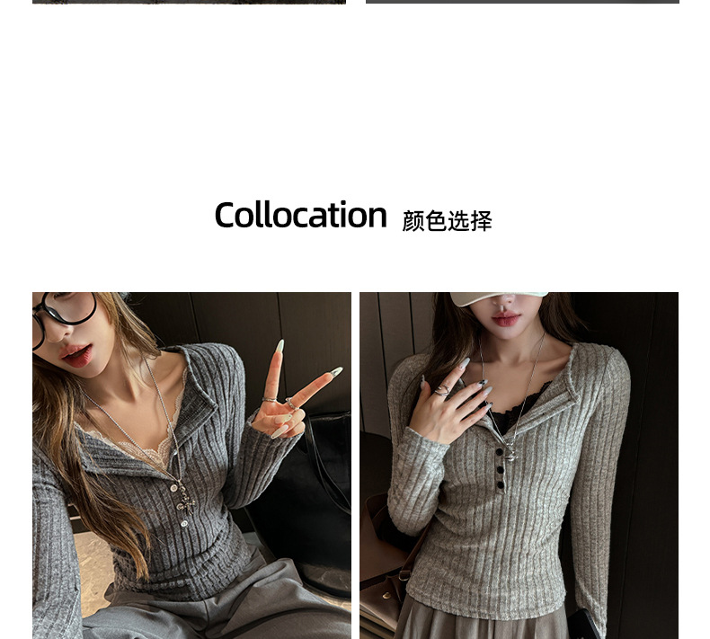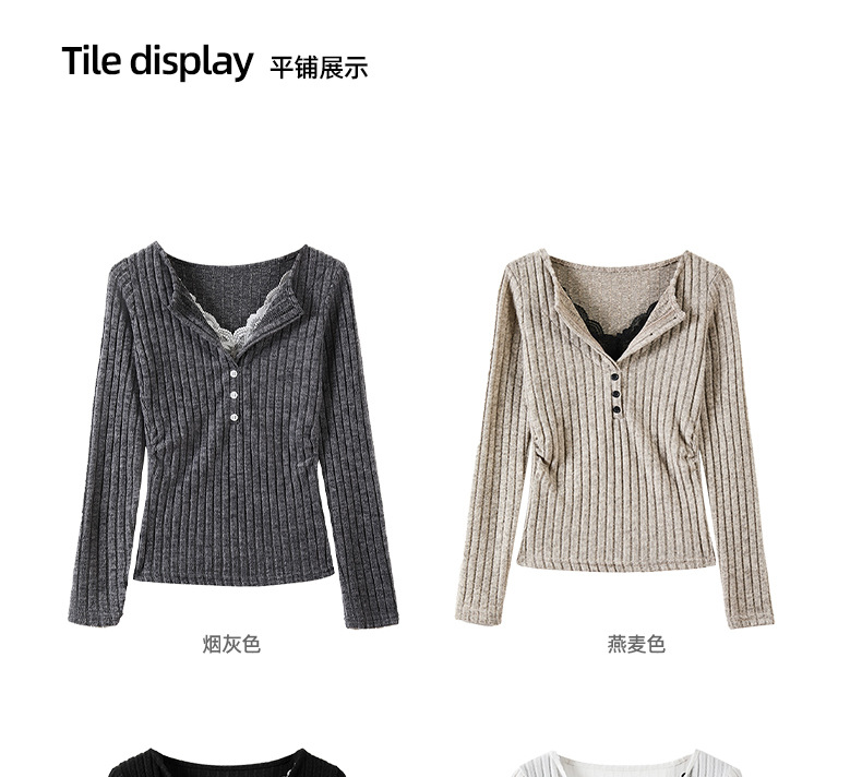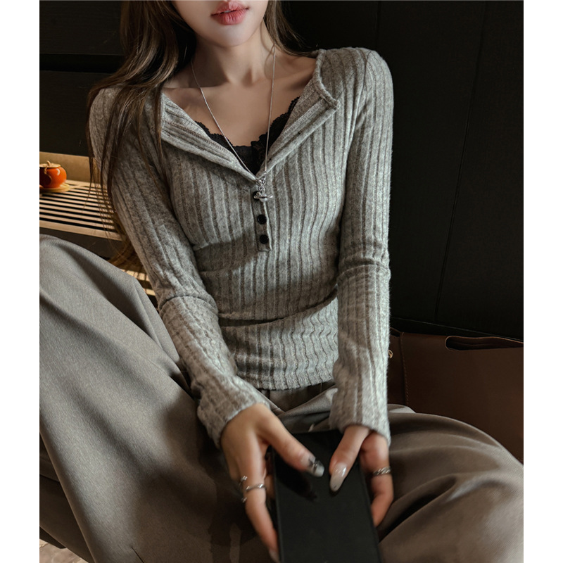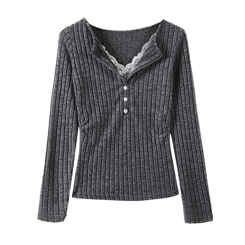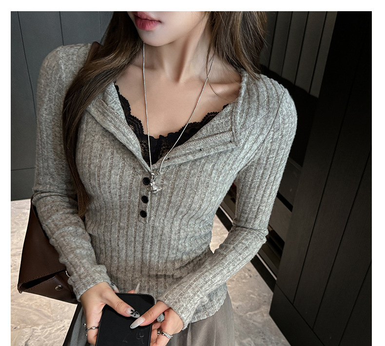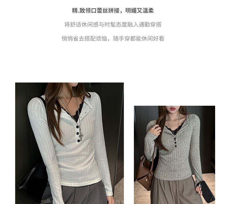 坑条V领蕾丝拼接设计感长袖正肩t恤女气质修身高级感内搭打底上衣