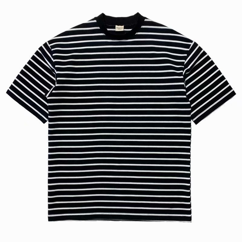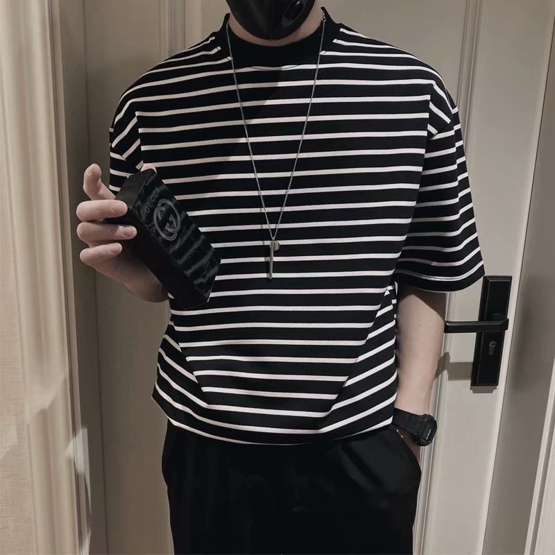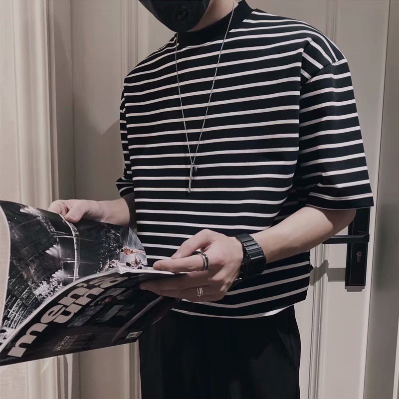百搭短袖男生t恤夏季新款宽松韩版潮流条纹半高领五分半袖潮体恤