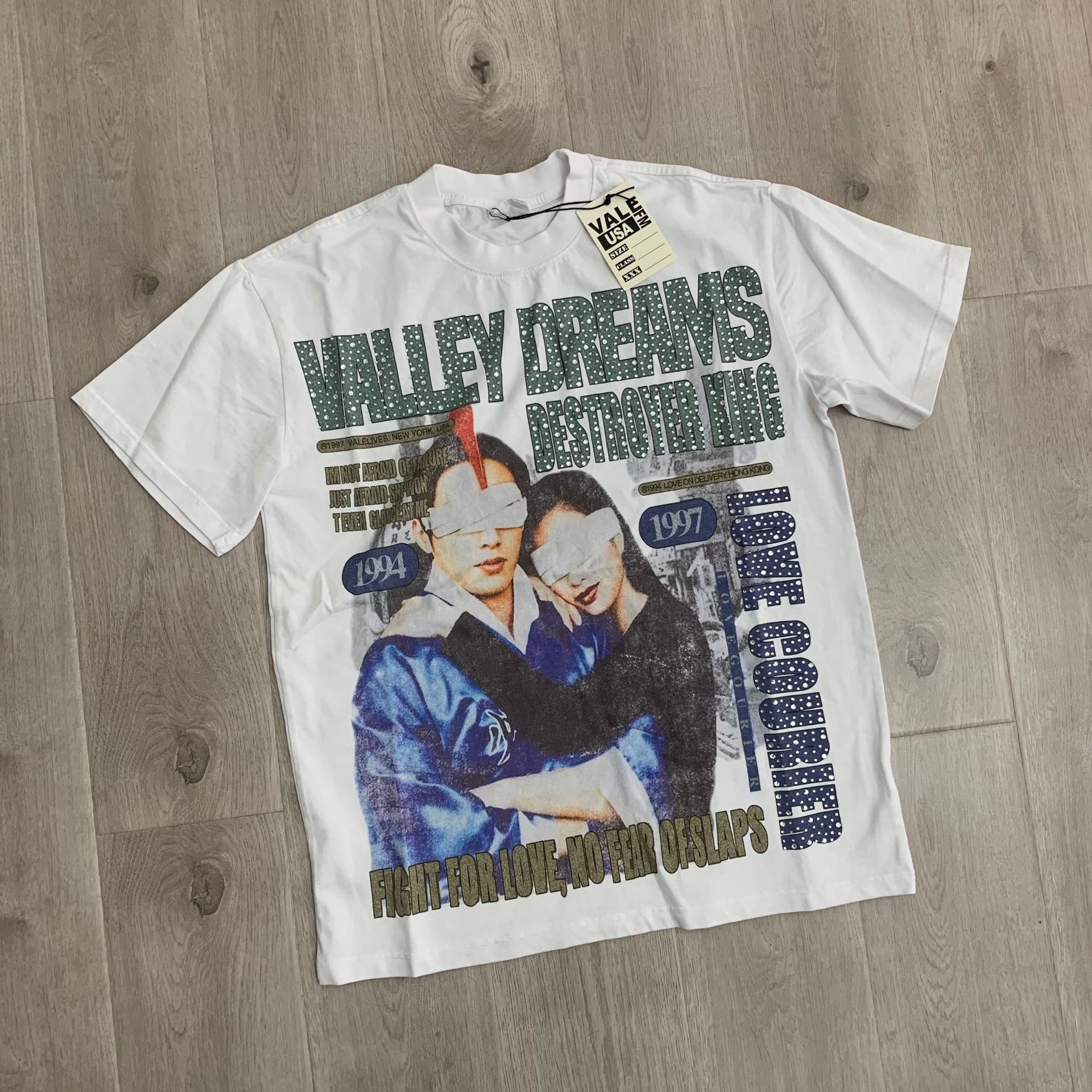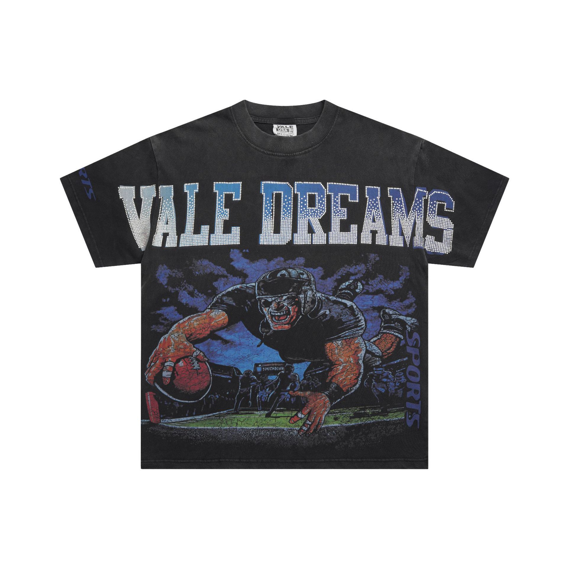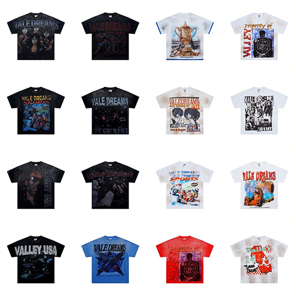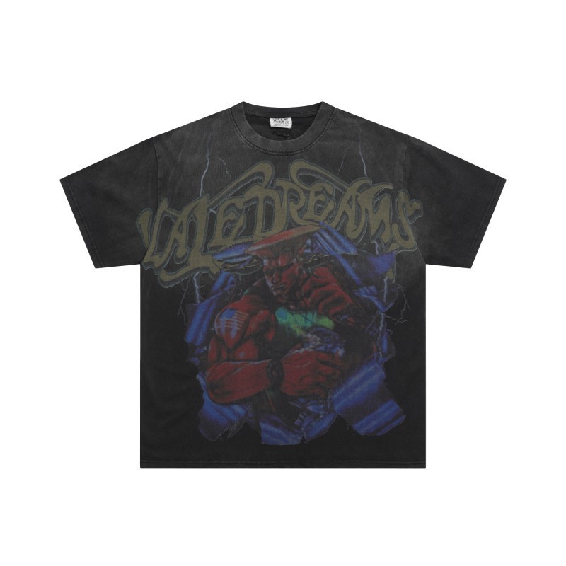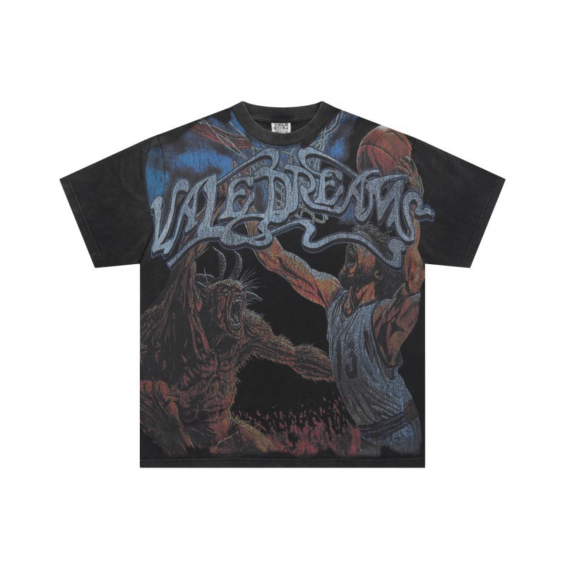 跨境欧美潮牌Va&le字母图案印花水洗复古短袖t恤男女高街美式半袖
