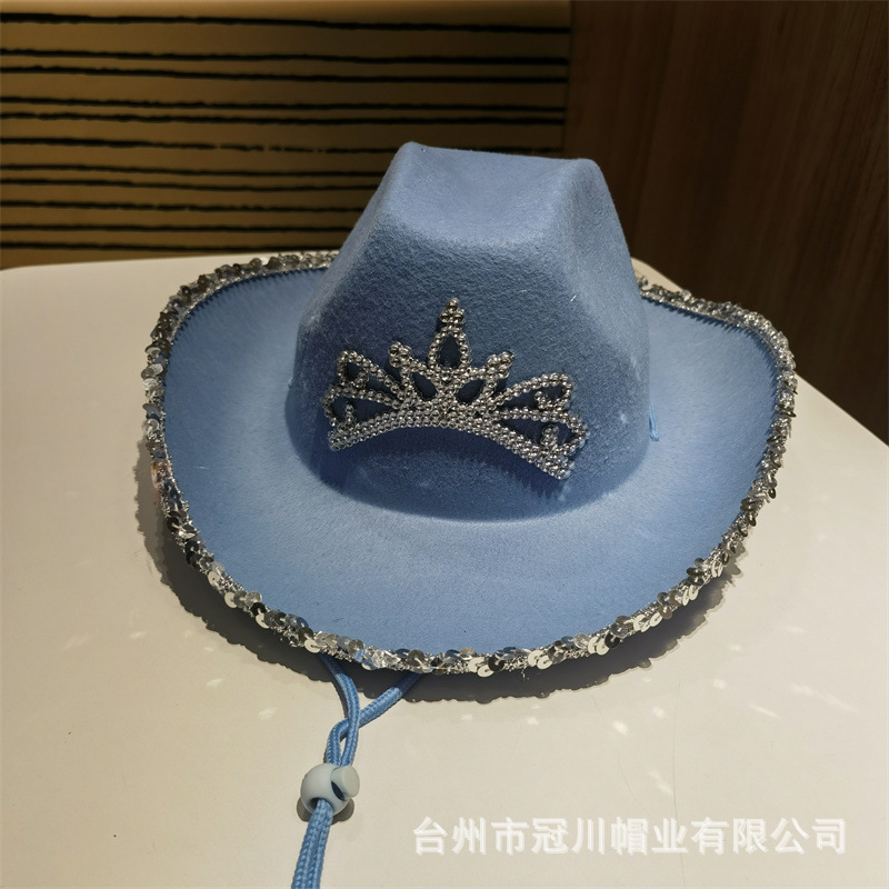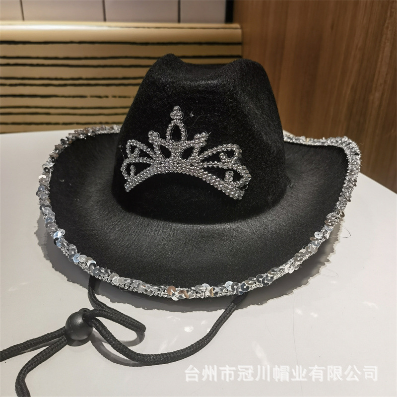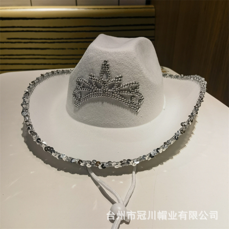 跨境粉色银丝羽毛牛仔帽女无纺布皇冠西部牛仔帽爵士卷檐礼帽辣妹