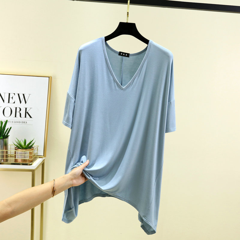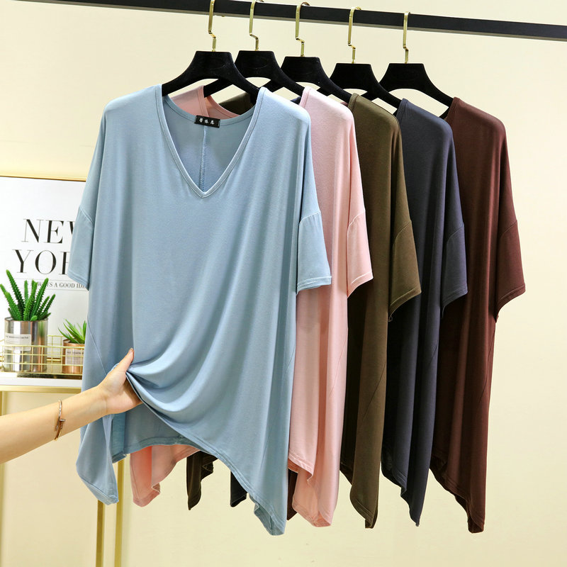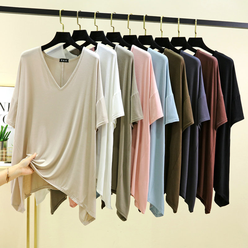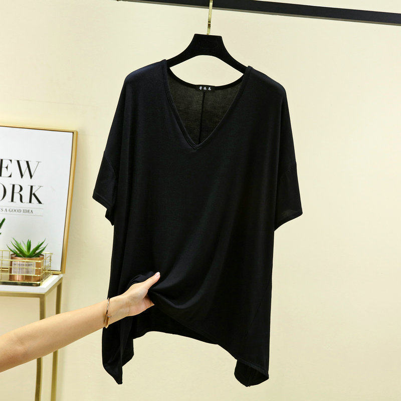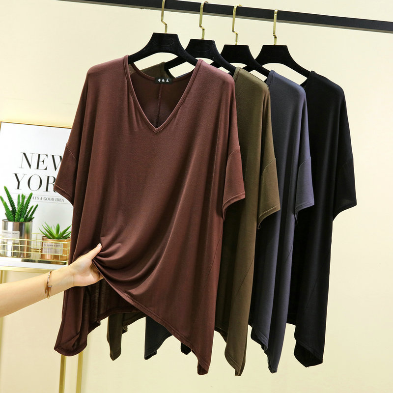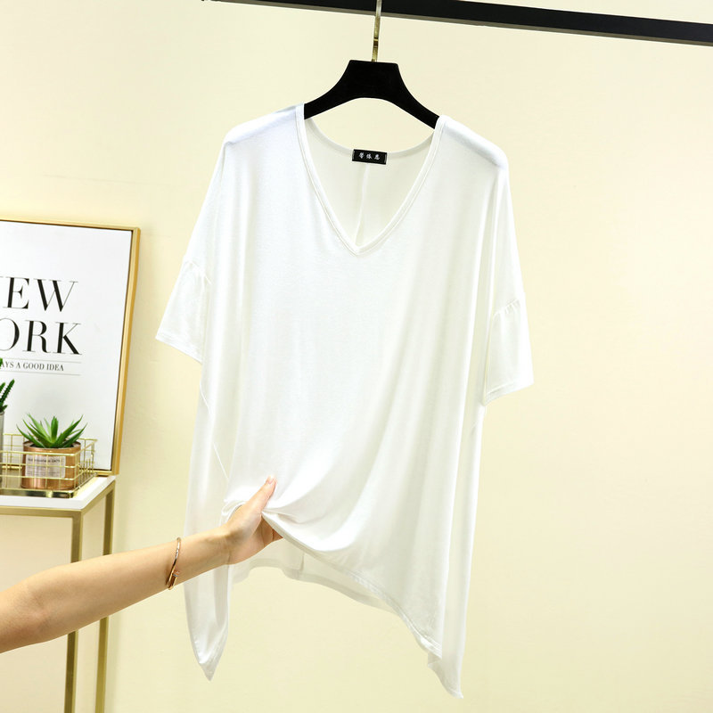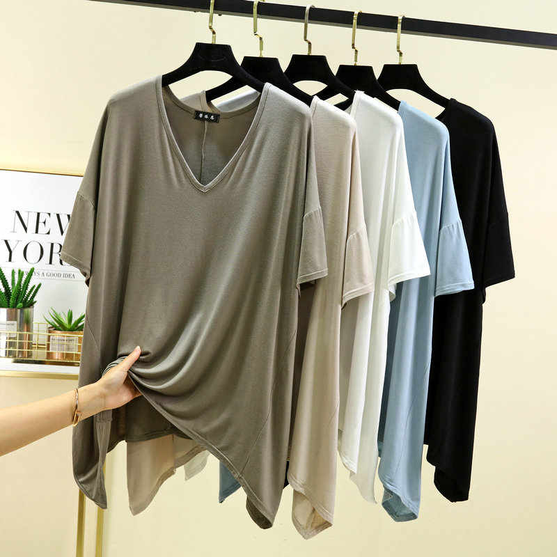 宽松v领不规则五分袖T恤衫夏季薄款莫代尔大码半袖上衣纯色打底衫