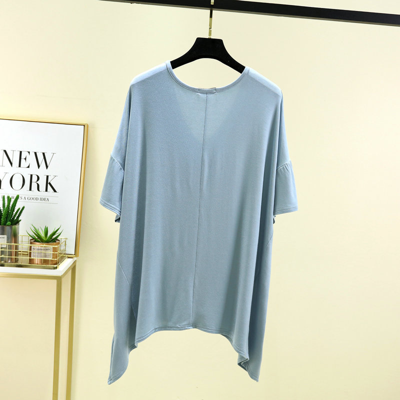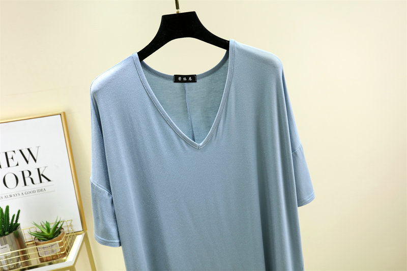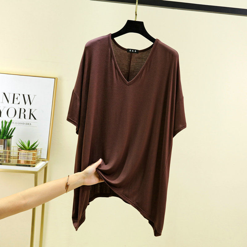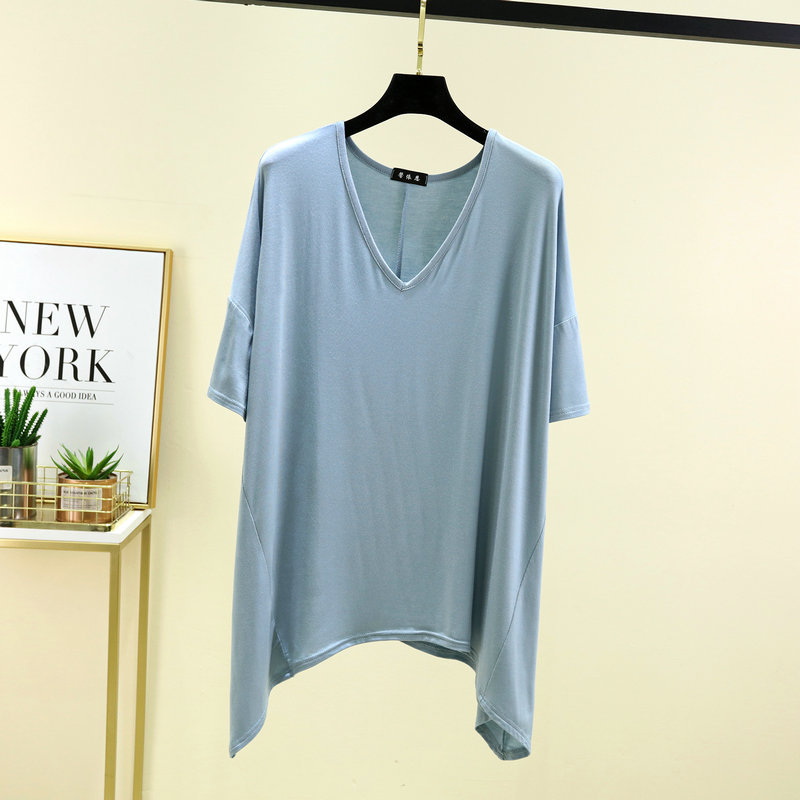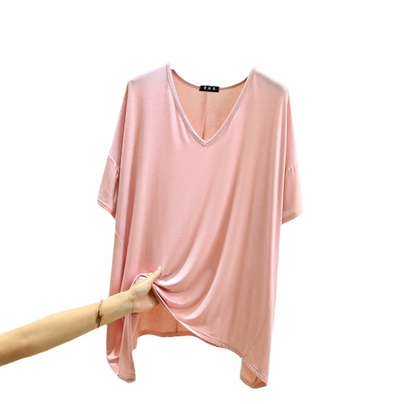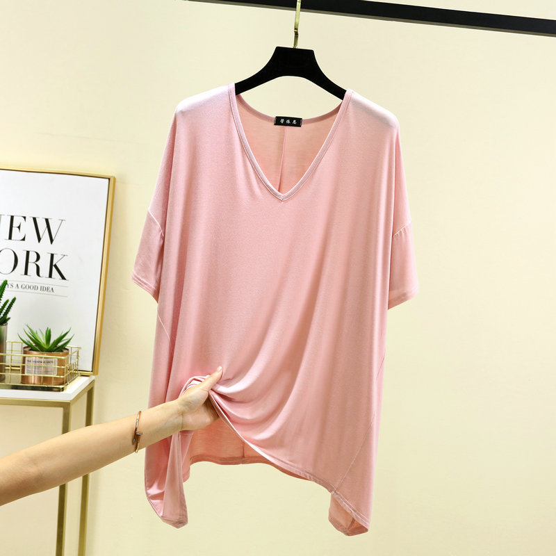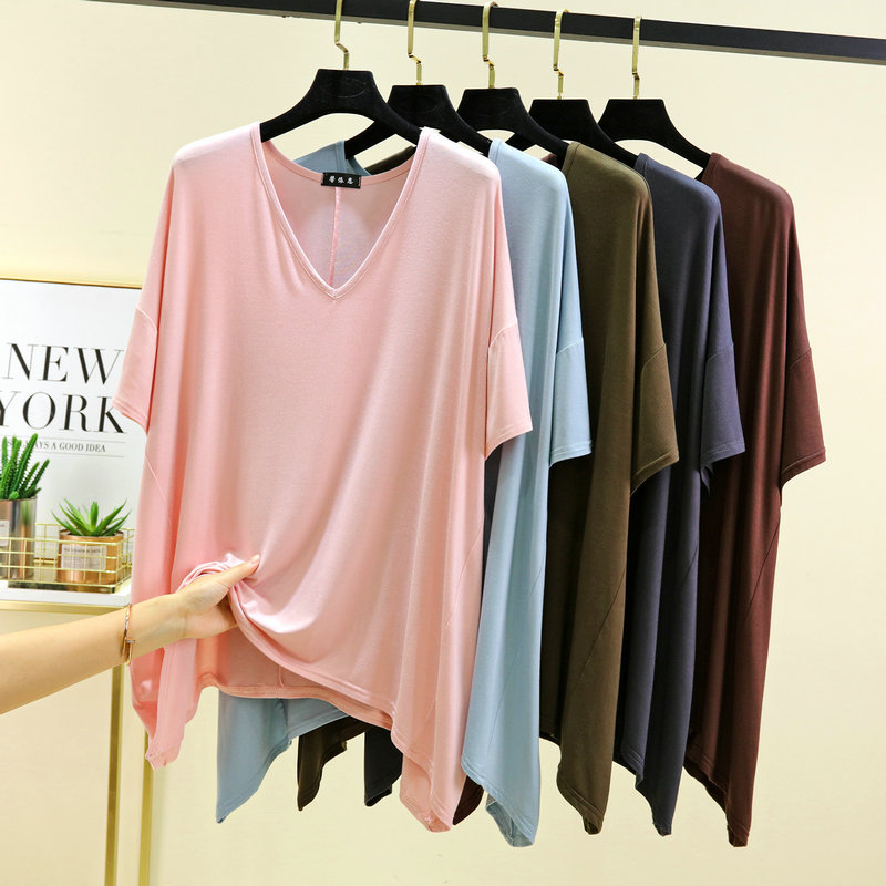 宽松v领不规则五分袖T恤衫夏季薄款莫代尔大码半袖上衣纯色打底衫