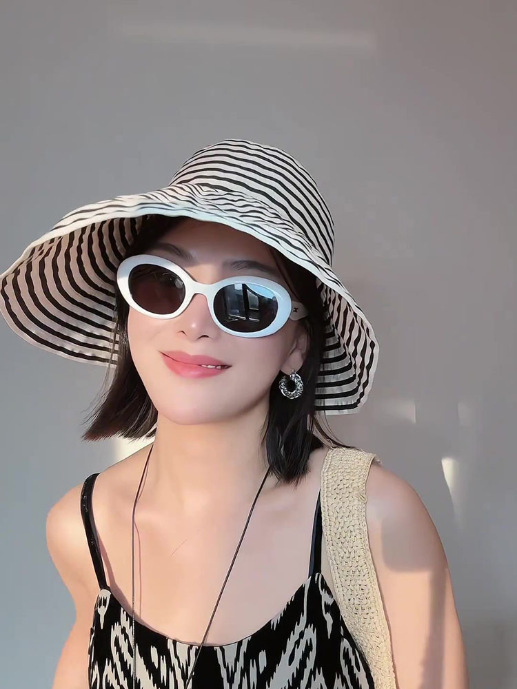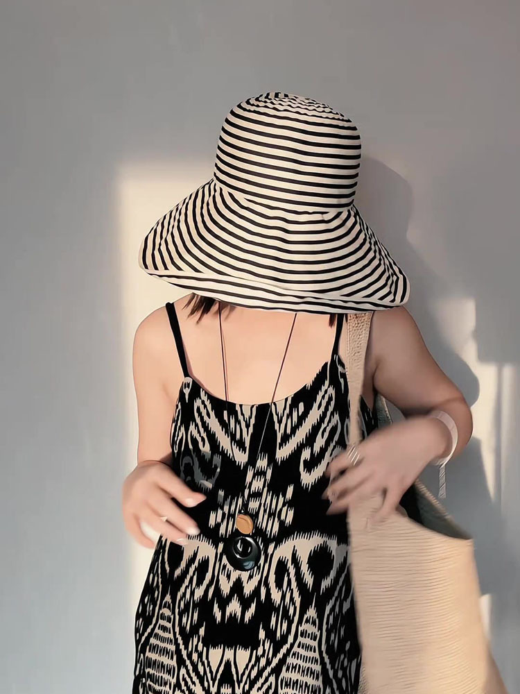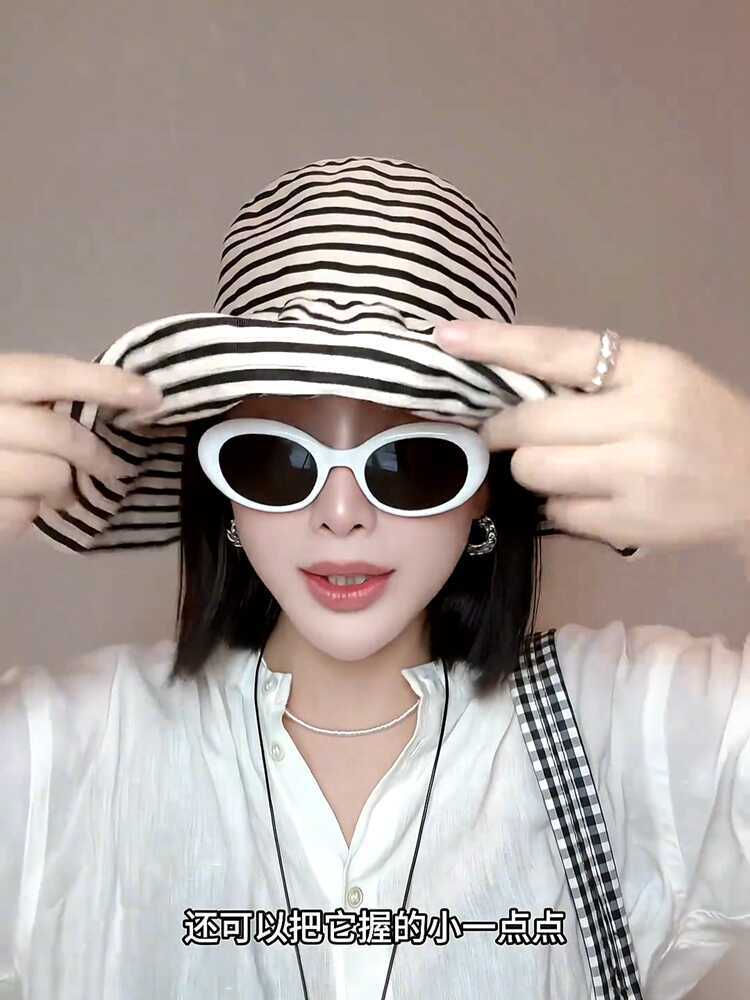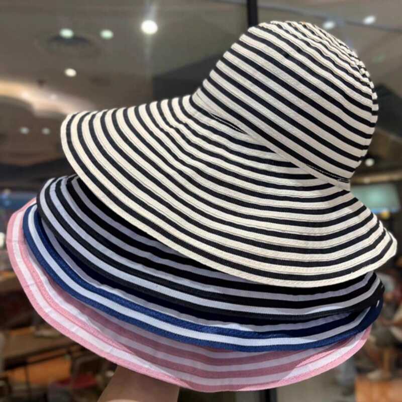 日系可折叠夏季条纹渔夫帽女新款长防晒帽子时尚盆帽大头围太阳帽