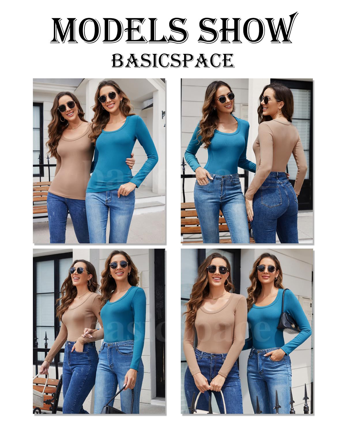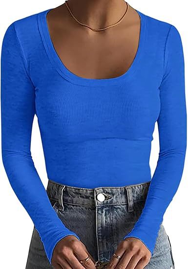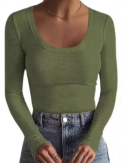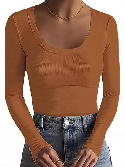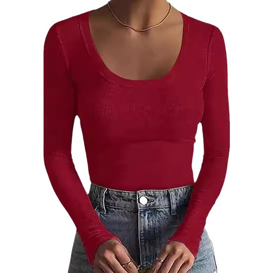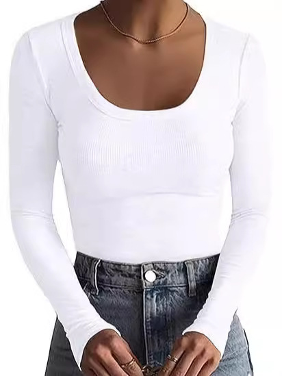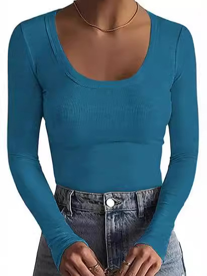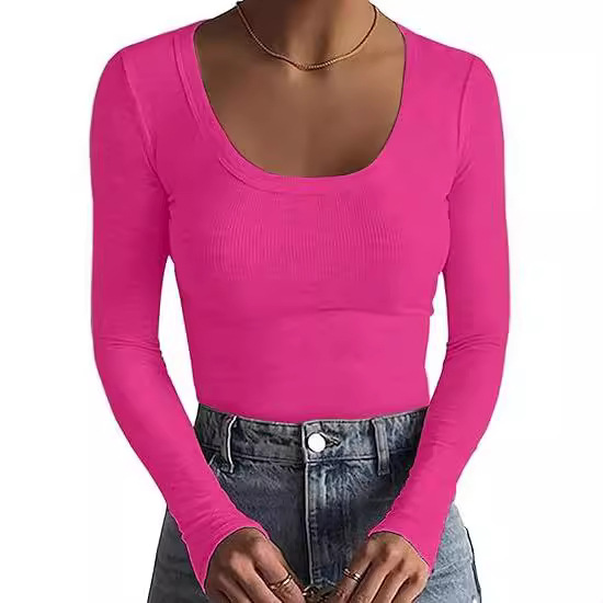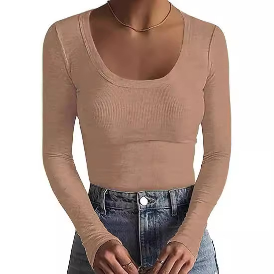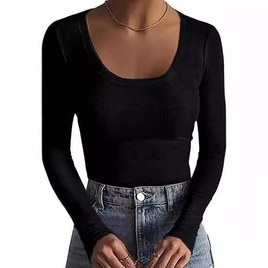 2024新品女式T恤速卖通基础款螺纹圆领长袖性感修身女上衣T辣妹