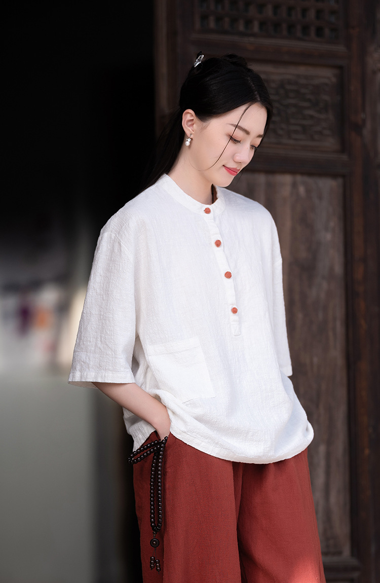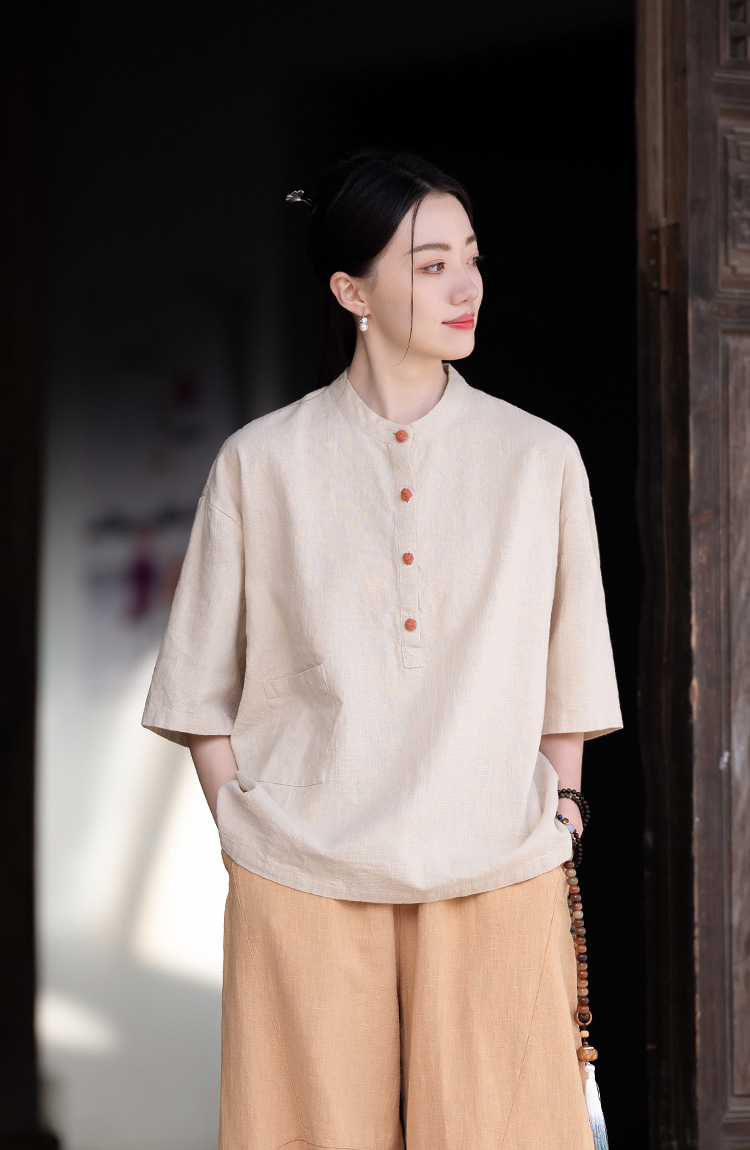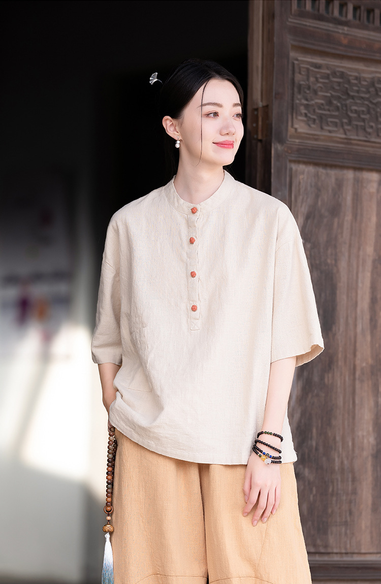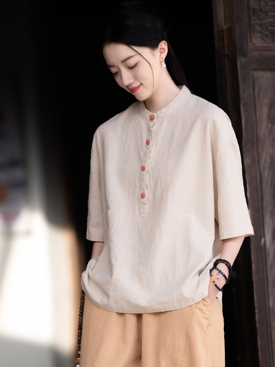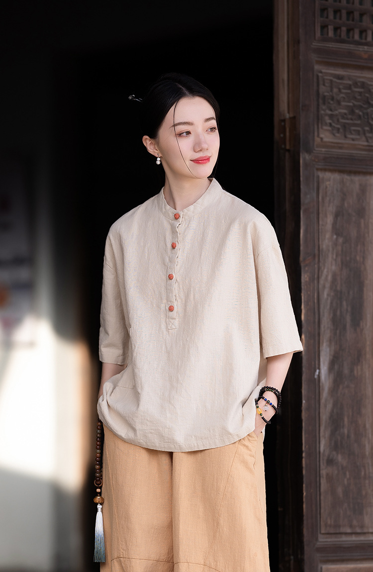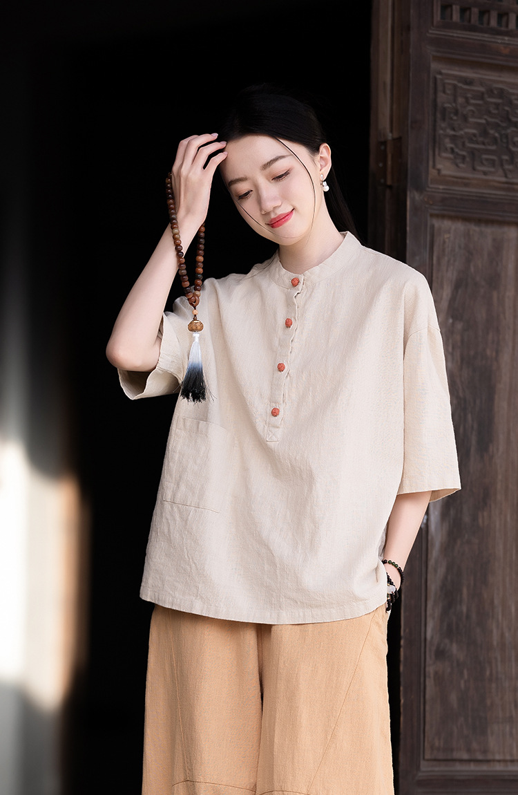 棉麻女装新品2026复古国风立领拼色盘扣短袖上衣女式衬衫T恤