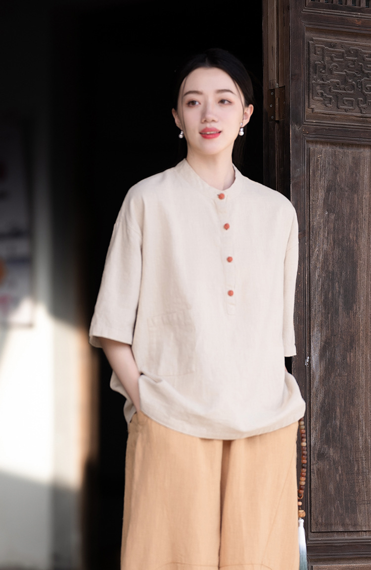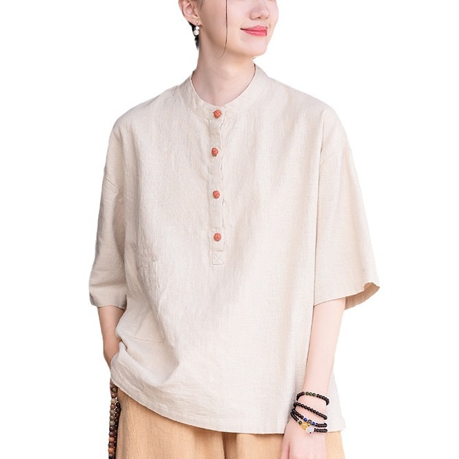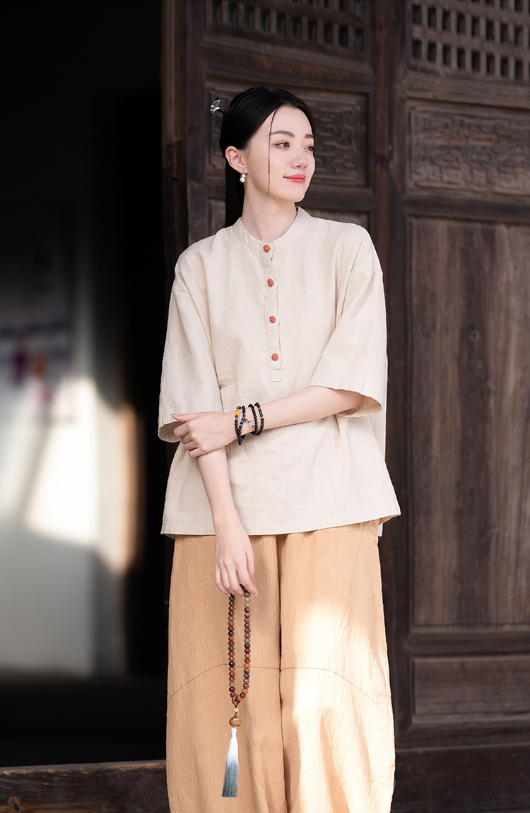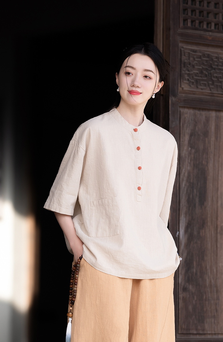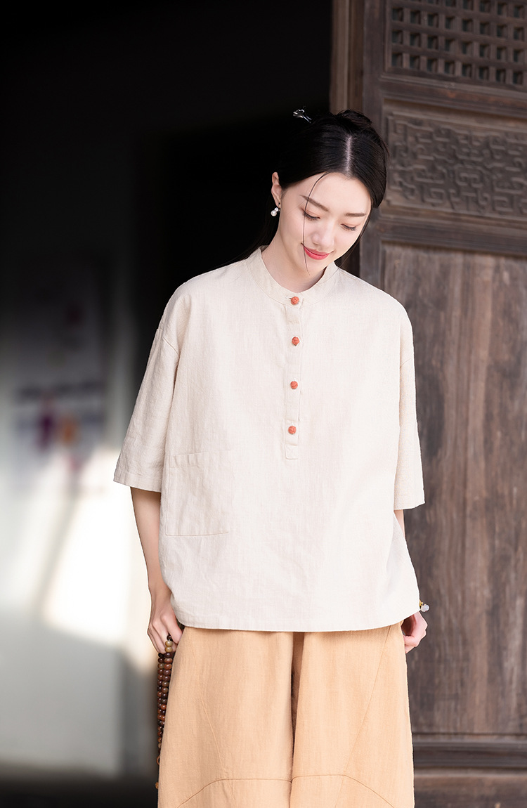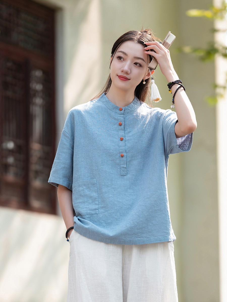 棉麻女装新品2026复古国风立领拼色盘扣短袖上衣女式衬衫T恤