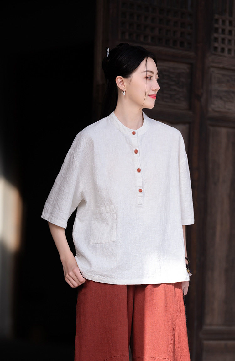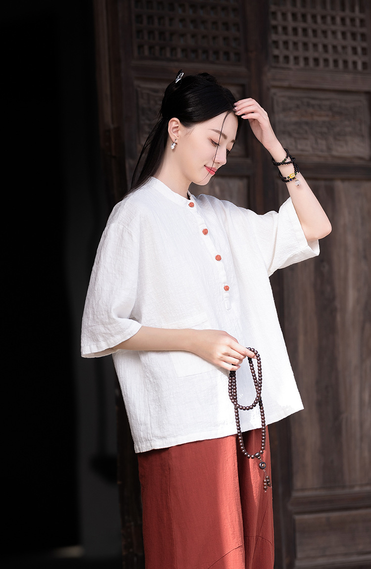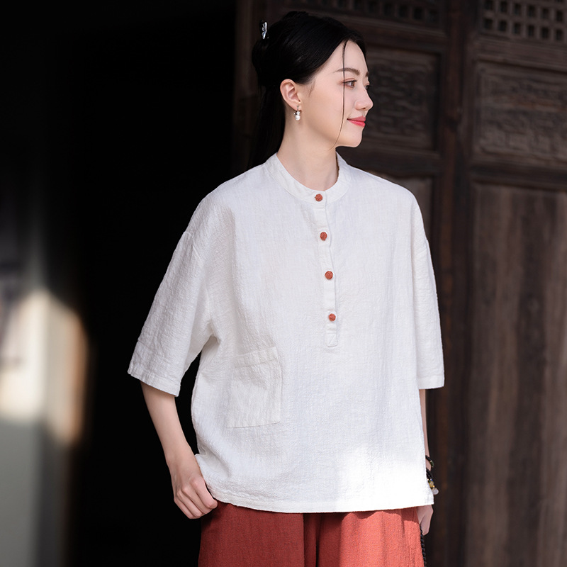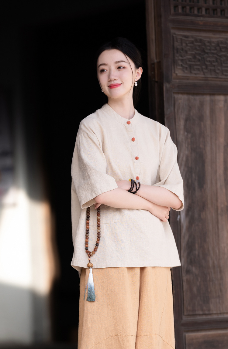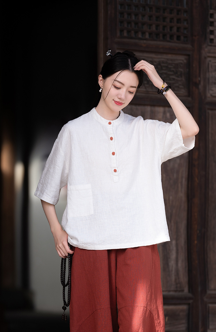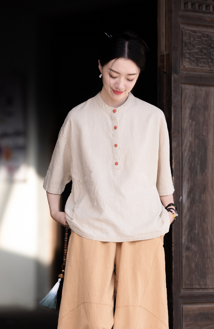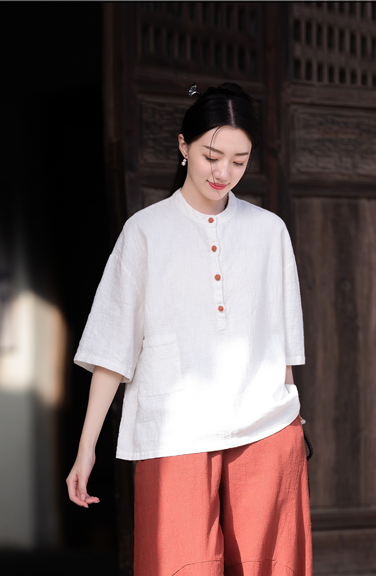 棉麻女装新品2026复古国风立领拼色盘扣短袖上衣女式衬衫T恤