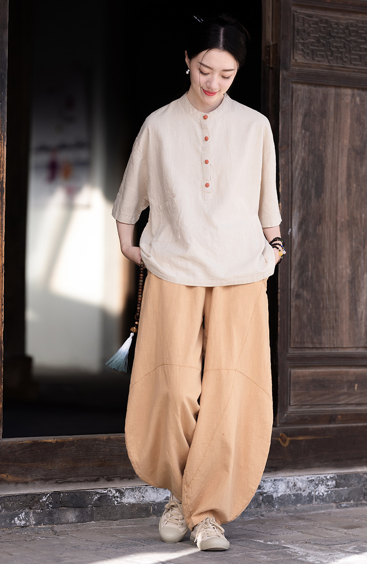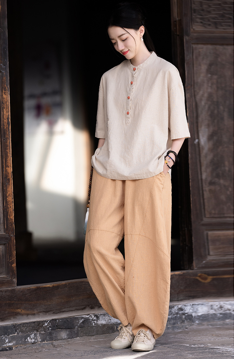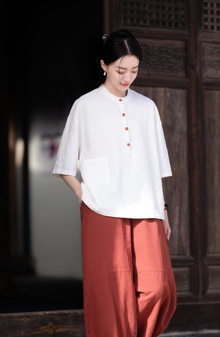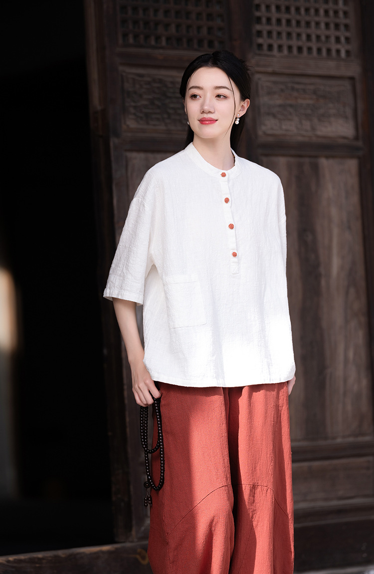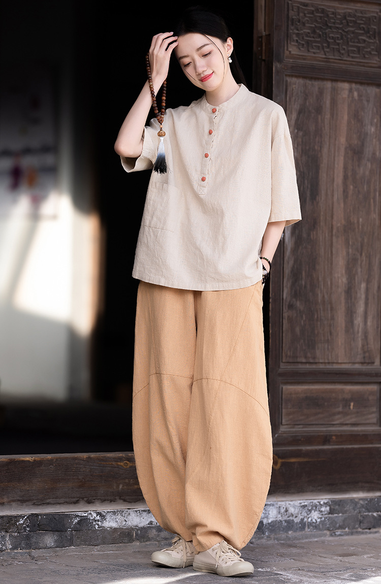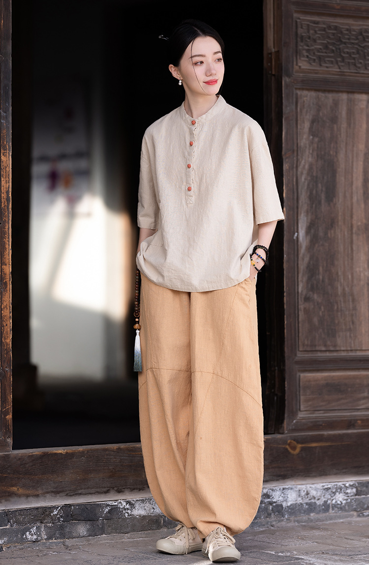 棉麻女装新品2026复古国风立领拼色盘扣短袖上衣女式衬衫T恤