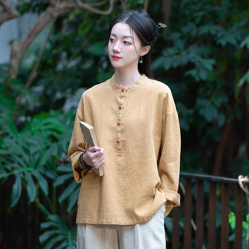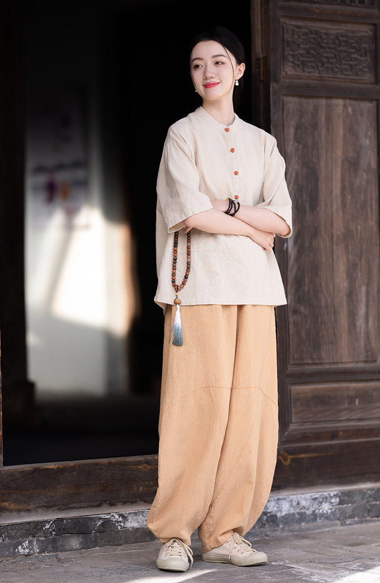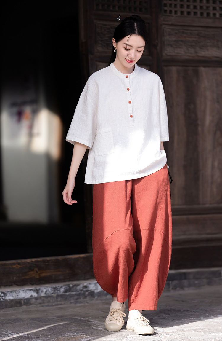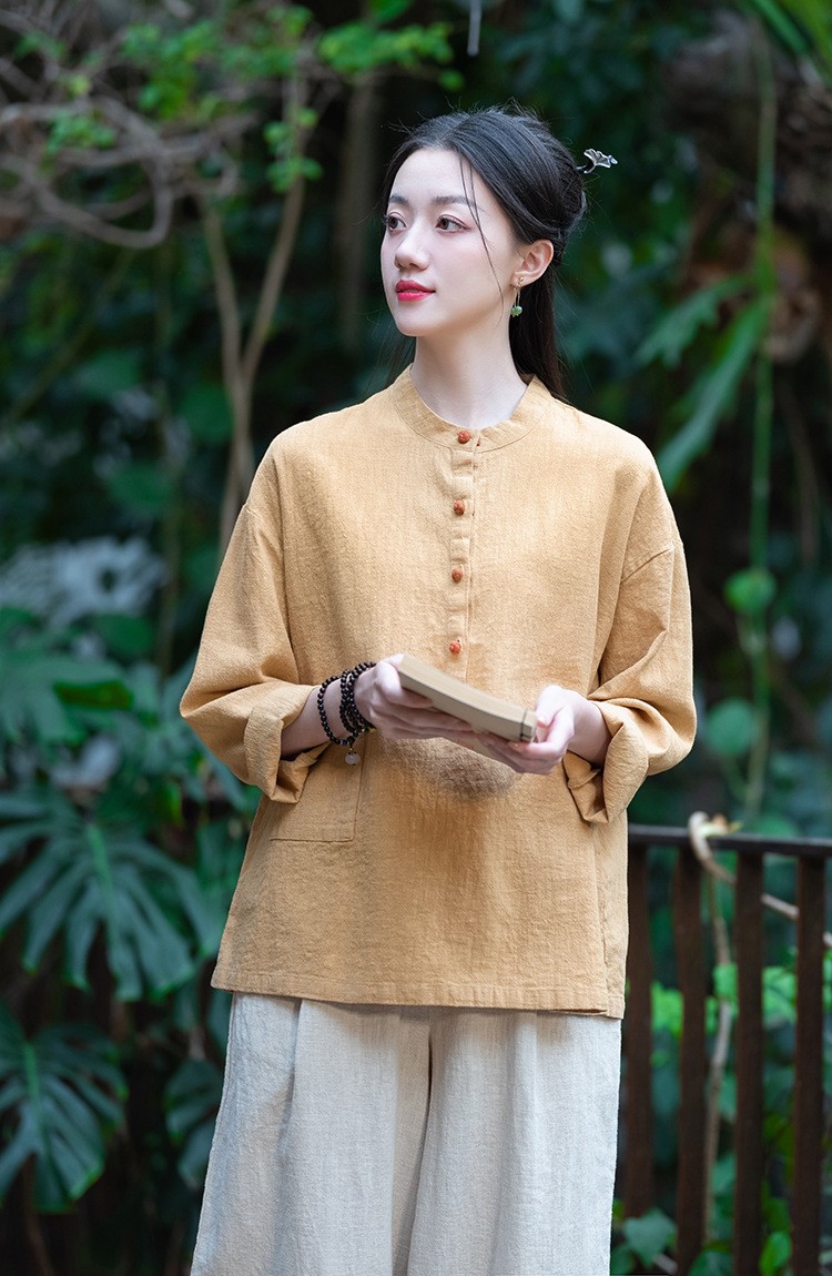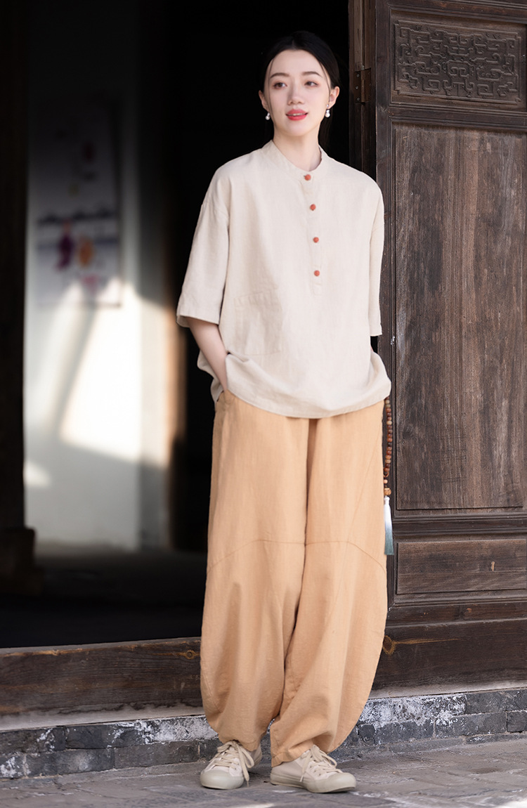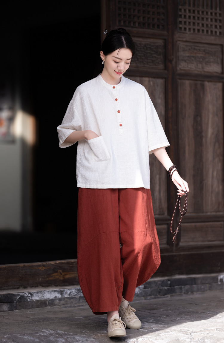 棉麻女装新品2026复古国风立领拼色盘扣短袖上衣女式衬衫T恤
