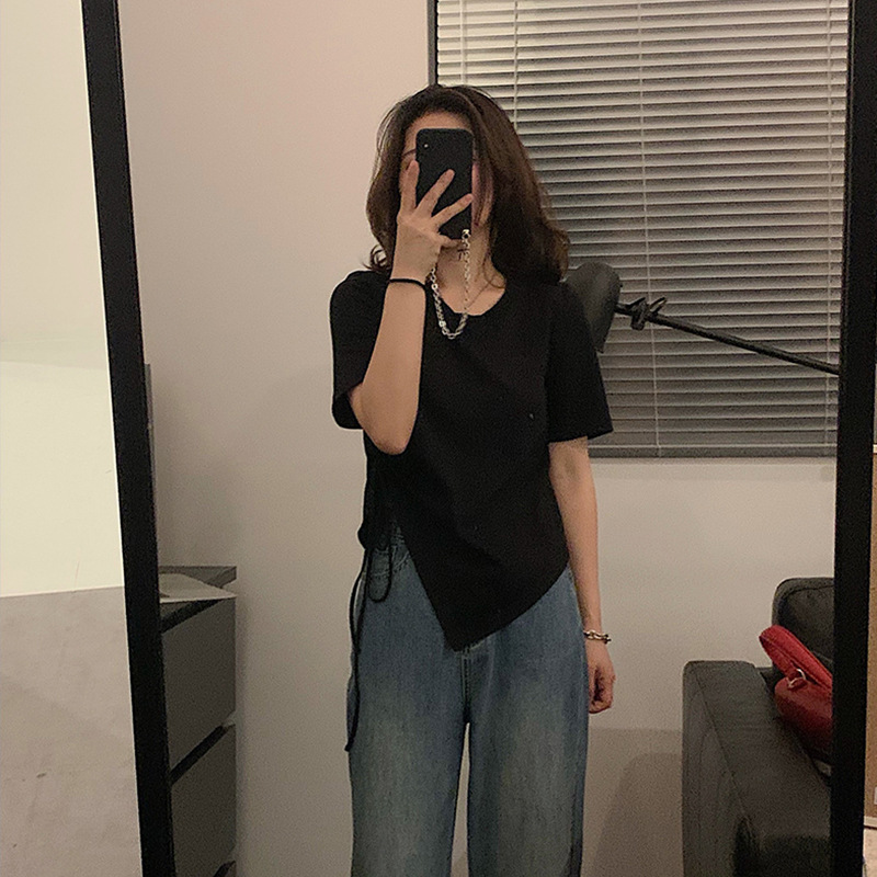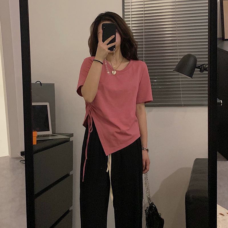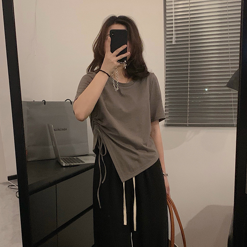 短款t恤女夏季短袖2025年新款抽绳设计感小众不规则高腰学生上衣
