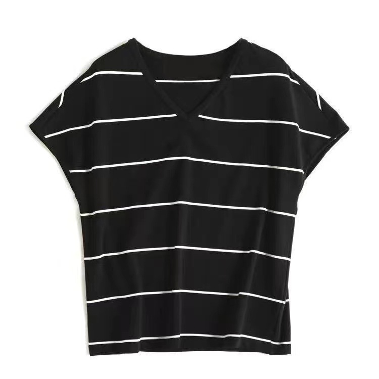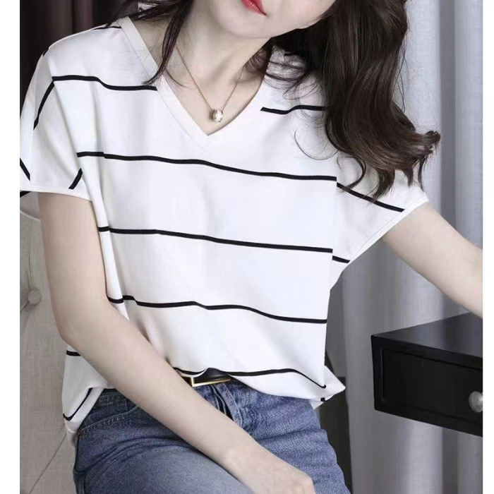 韩系大码胖MM夏季300斤宽松遮肚百搭V领显瘦条纹短袖t恤衫上衣女