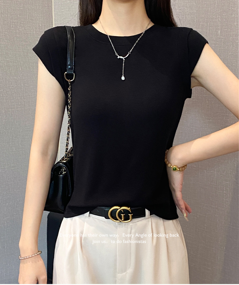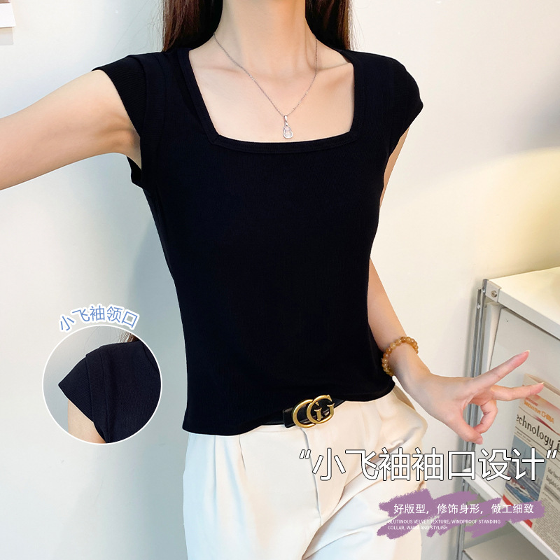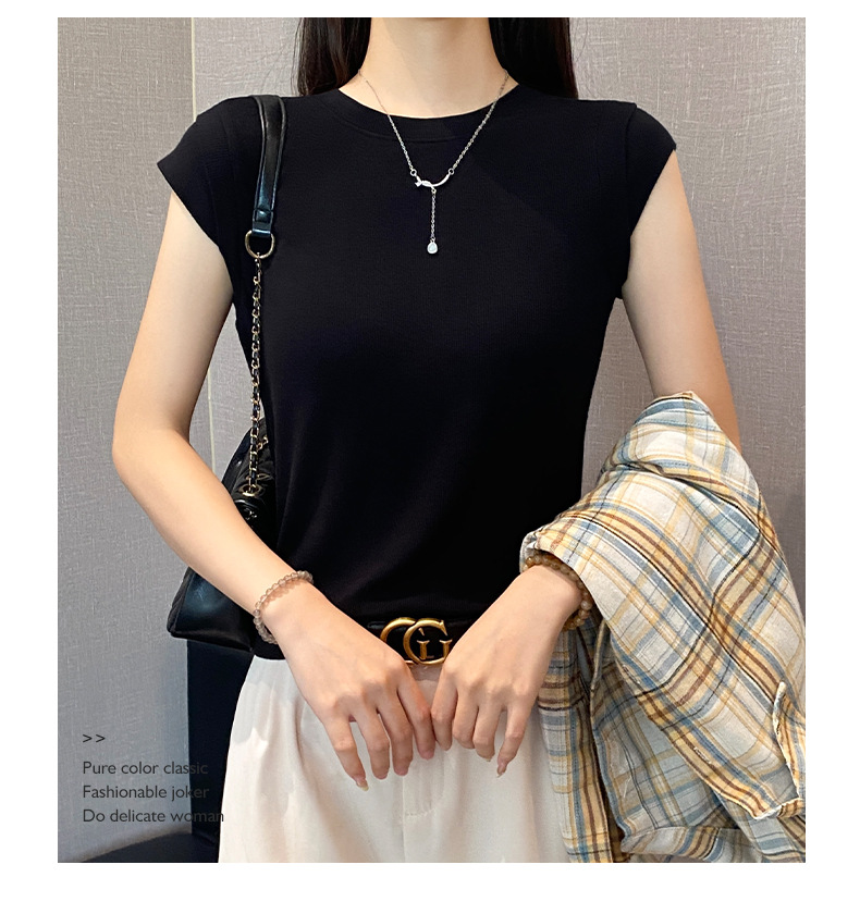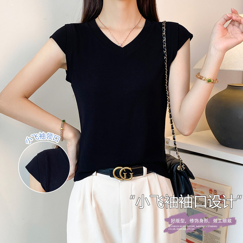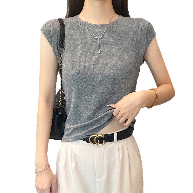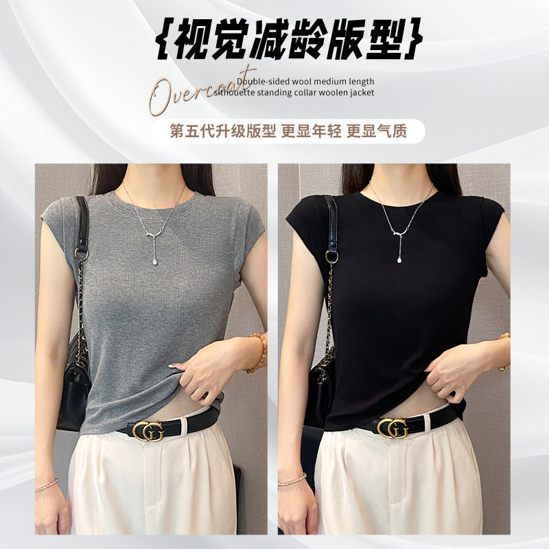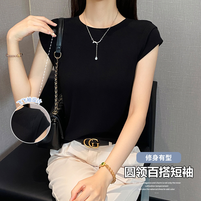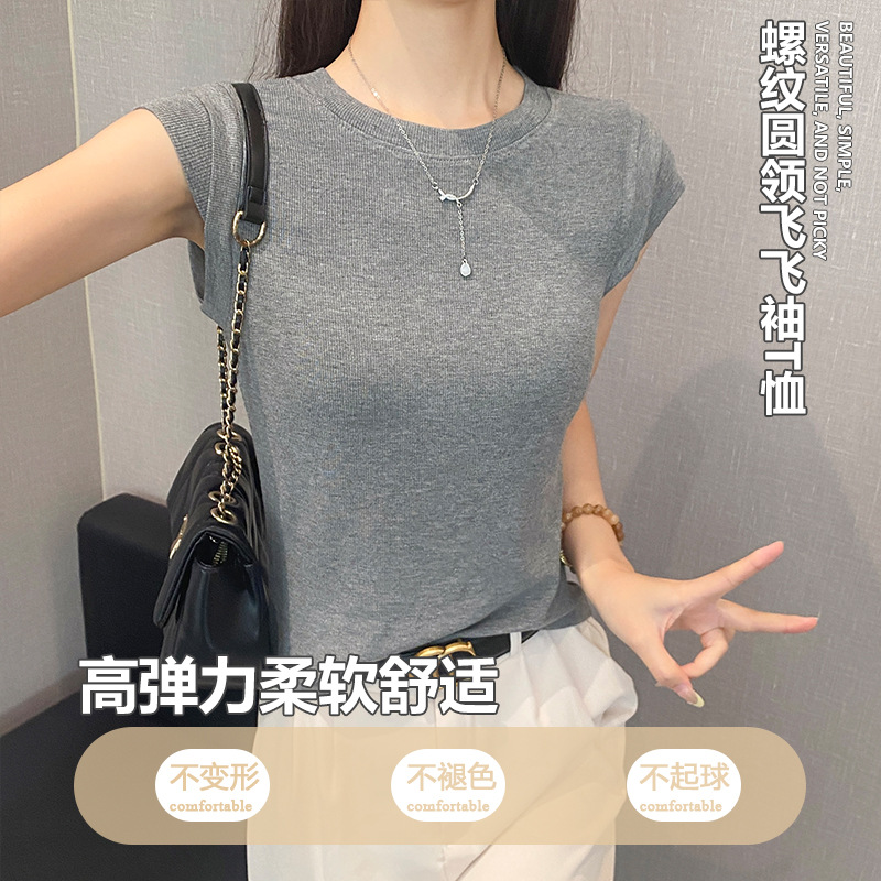 2025新款螺纹圆领短袖t恤女夏季修身打底衫百搭显瘦飞飞袖上衣潮