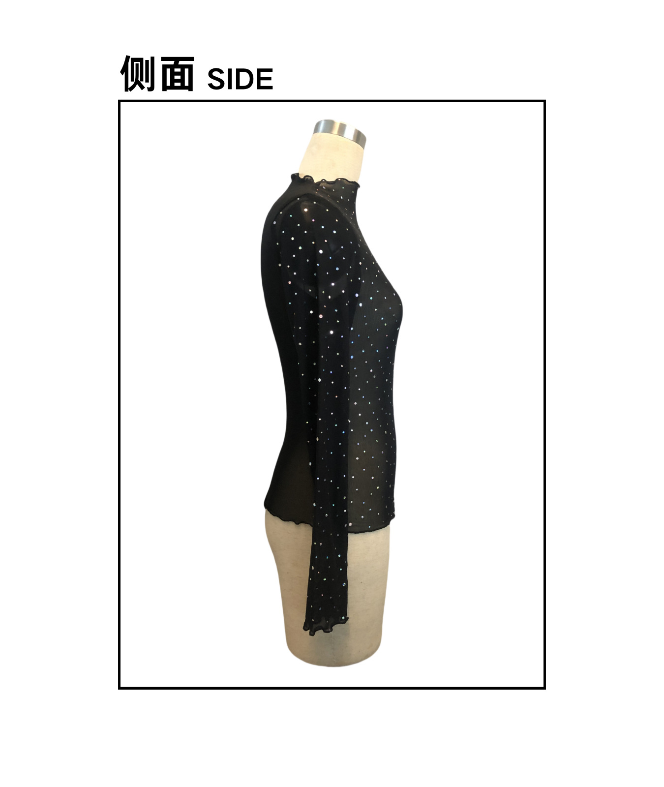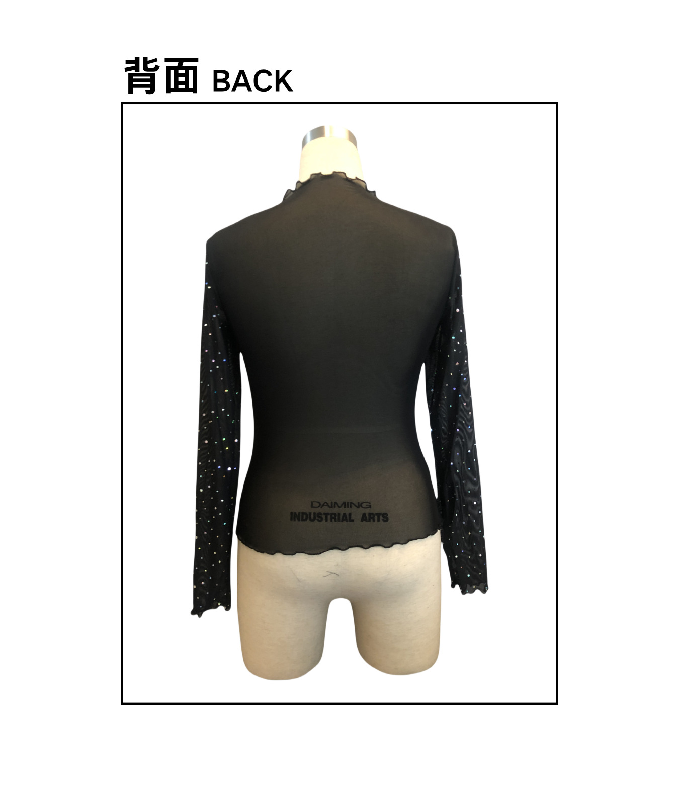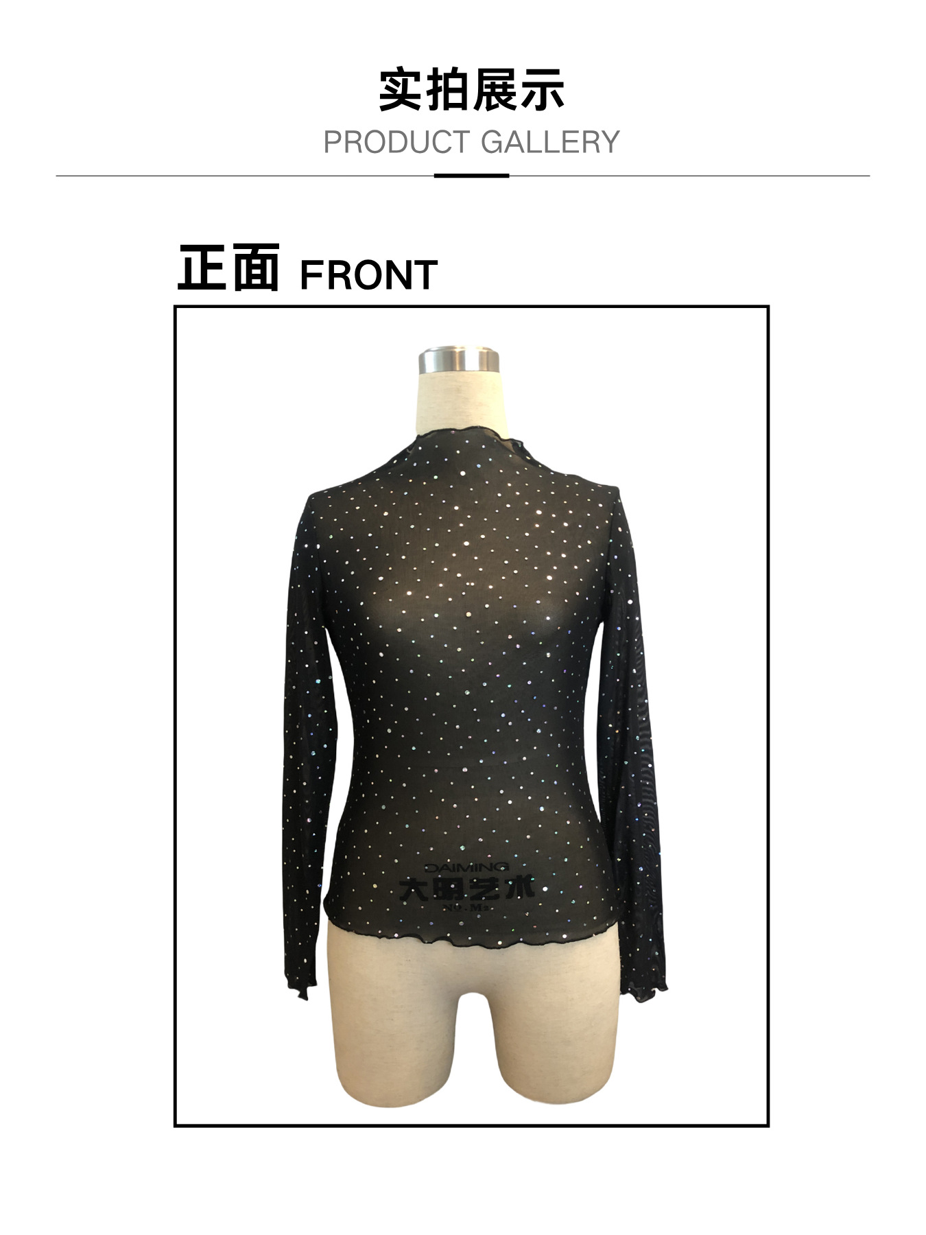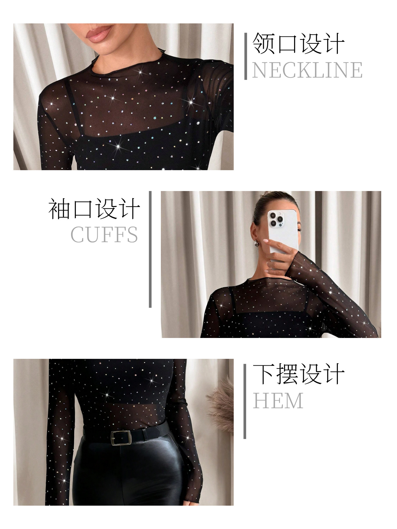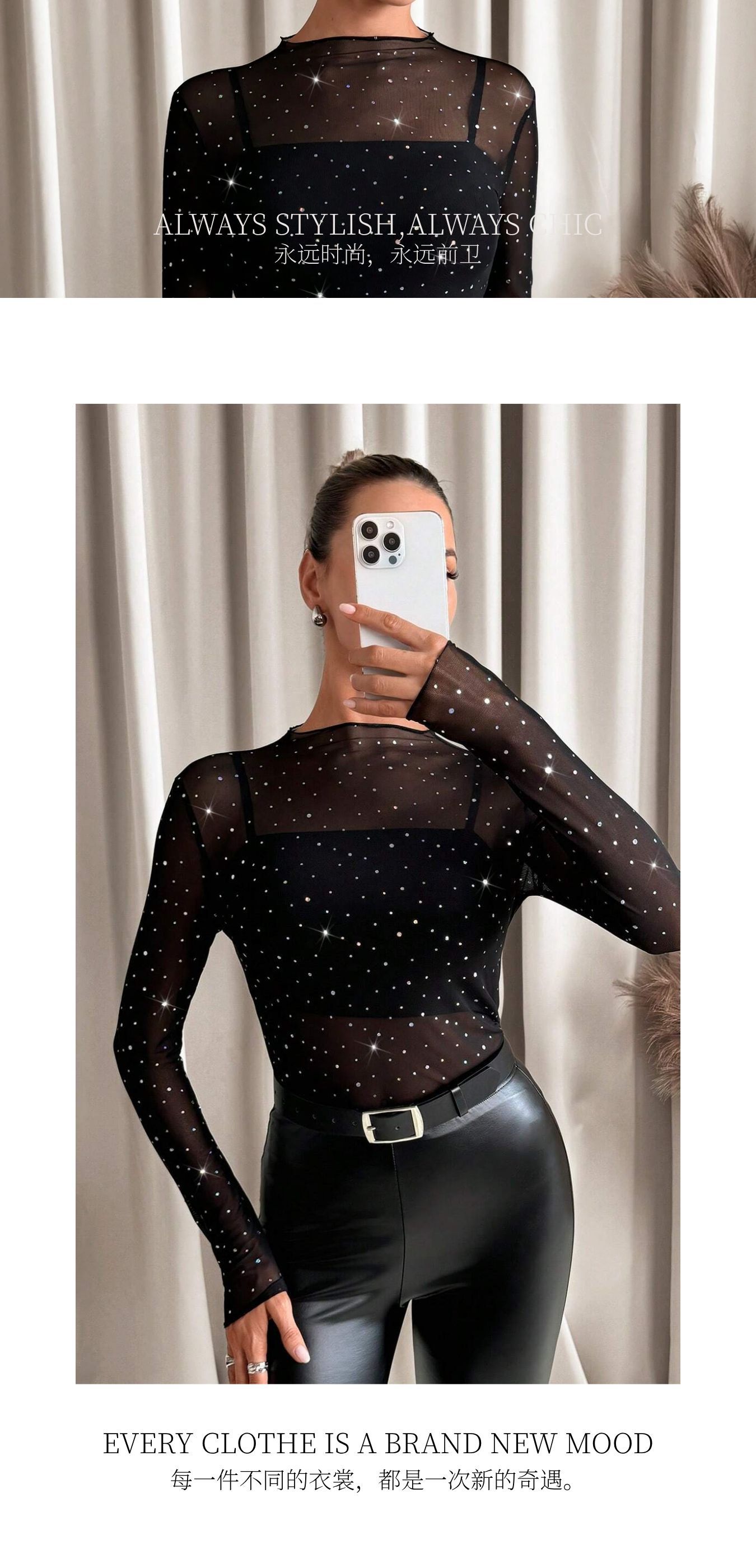 欧美跨境2026春季新款女士小立领长袖网沙透明水钻装饰T恤上衣女
