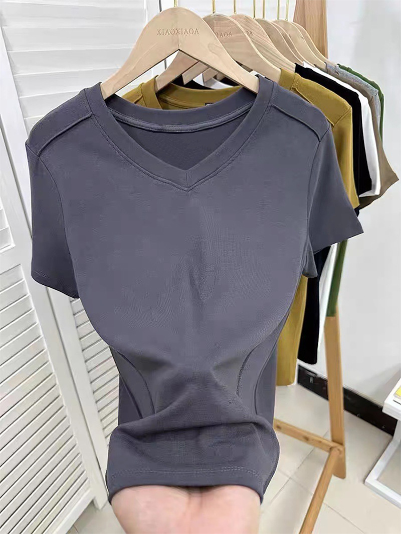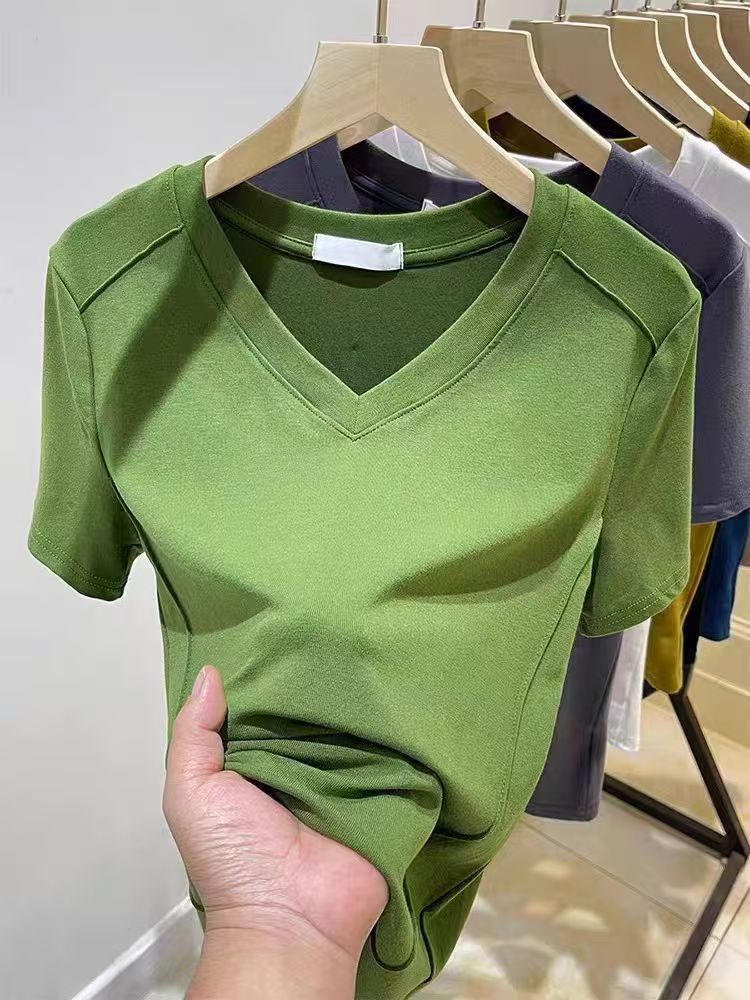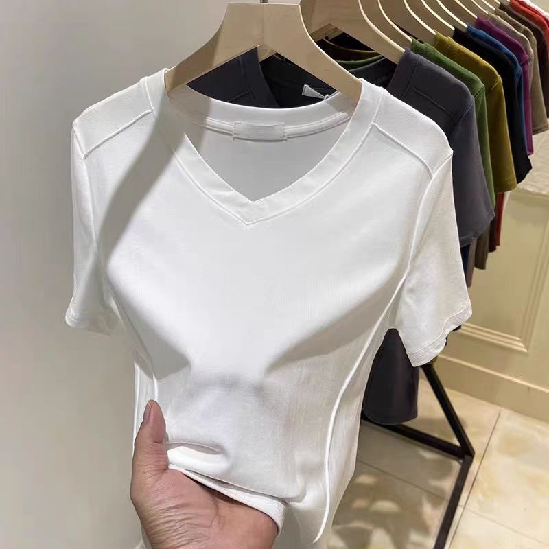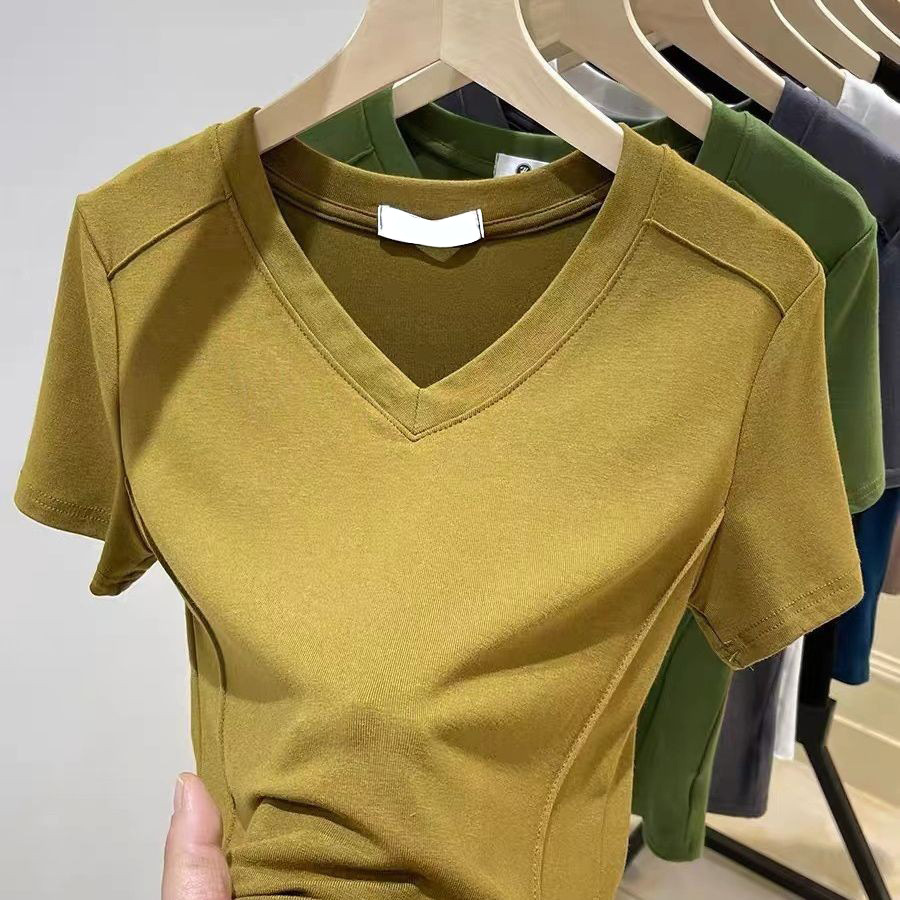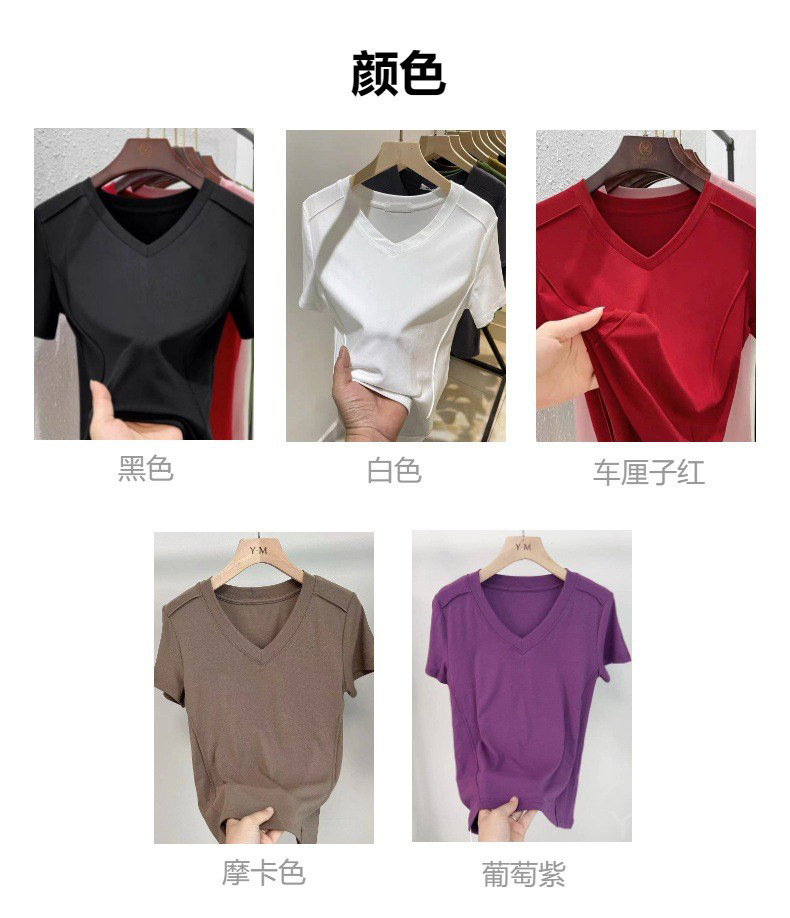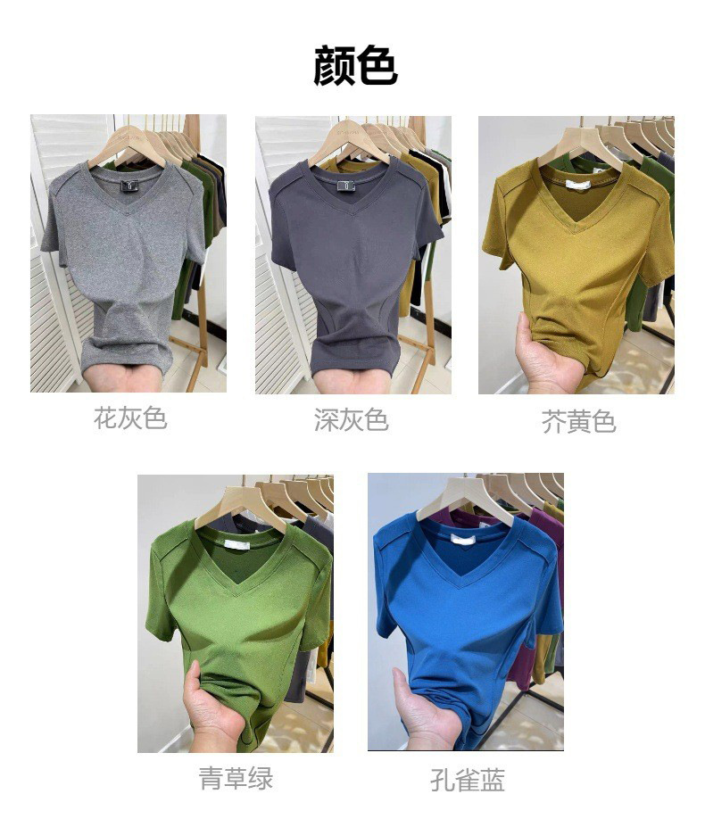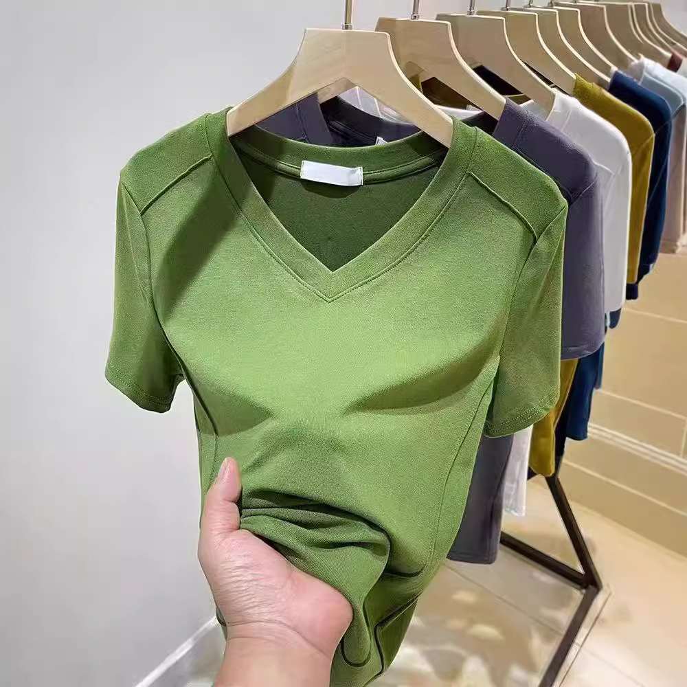 爆款纯色v领正肩鱼骨短袖夏季新款打底衫短袖t恤女