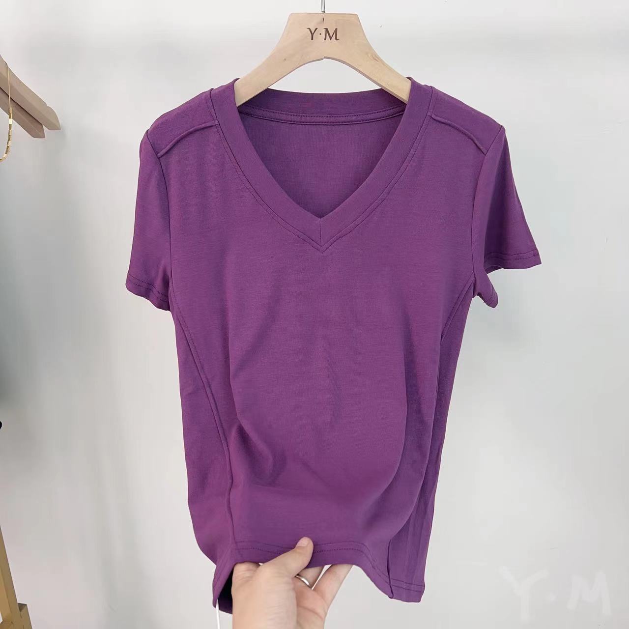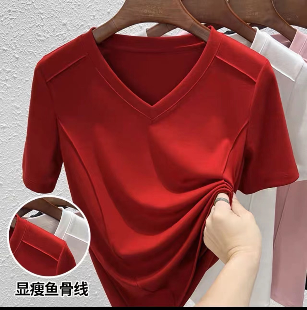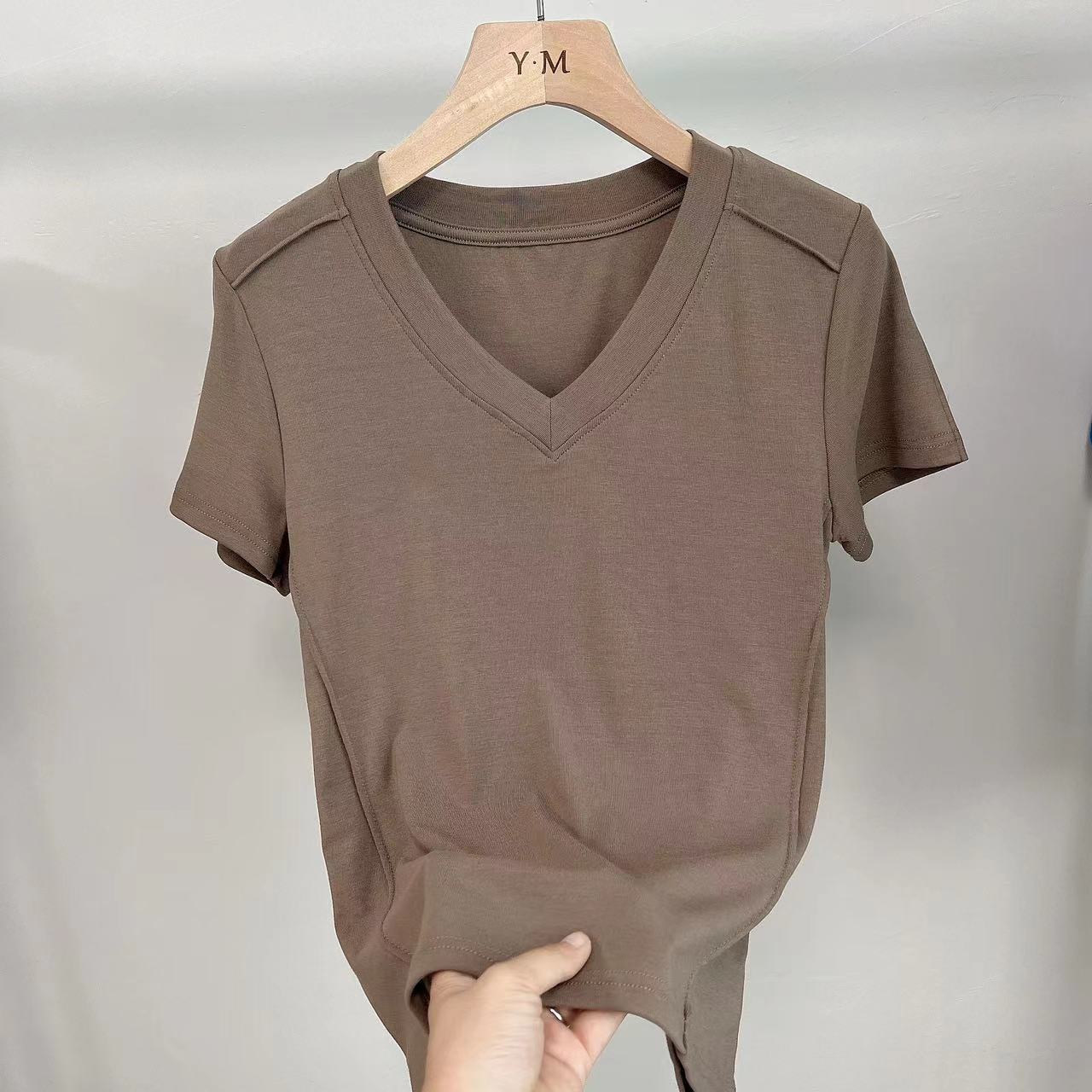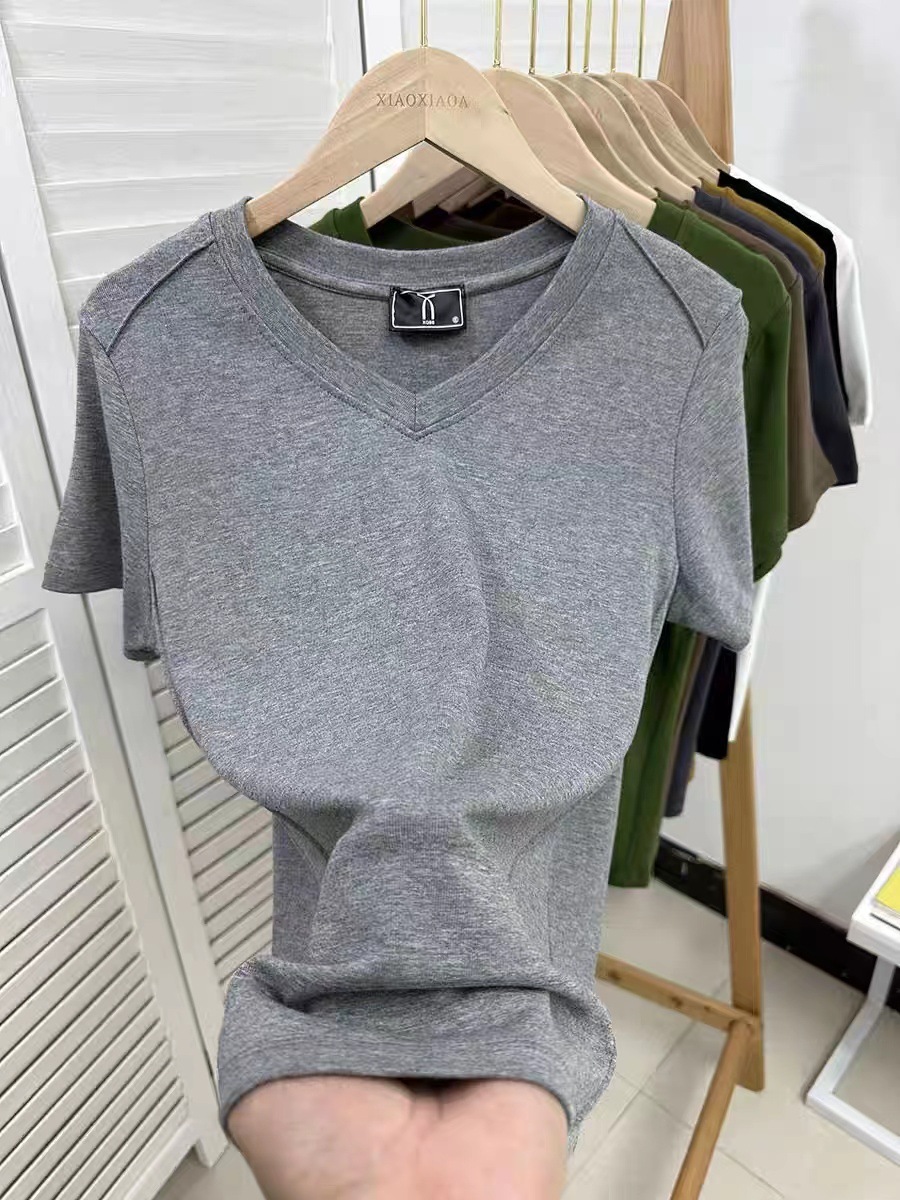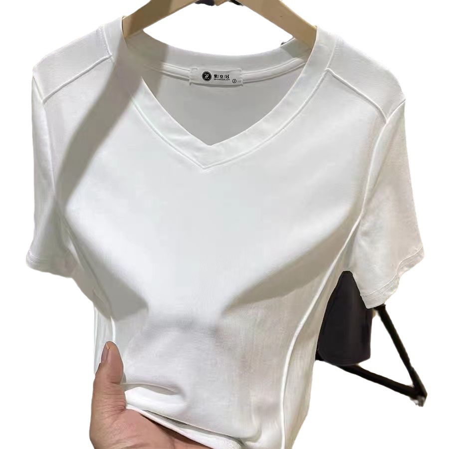 爆款纯色v领正肩鱼骨短袖夏季新款打底衫短袖t恤女