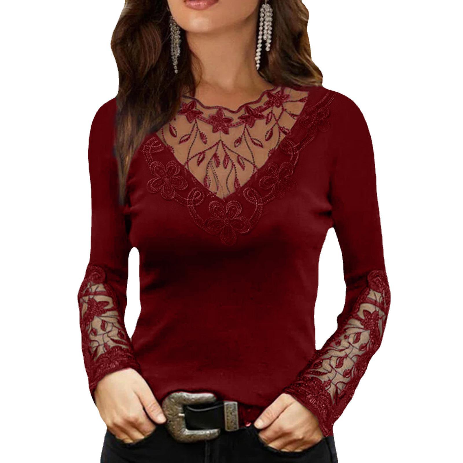2024春秋新款女装 欧美性感深V花边领蕾丝长袖T恤修身上衣