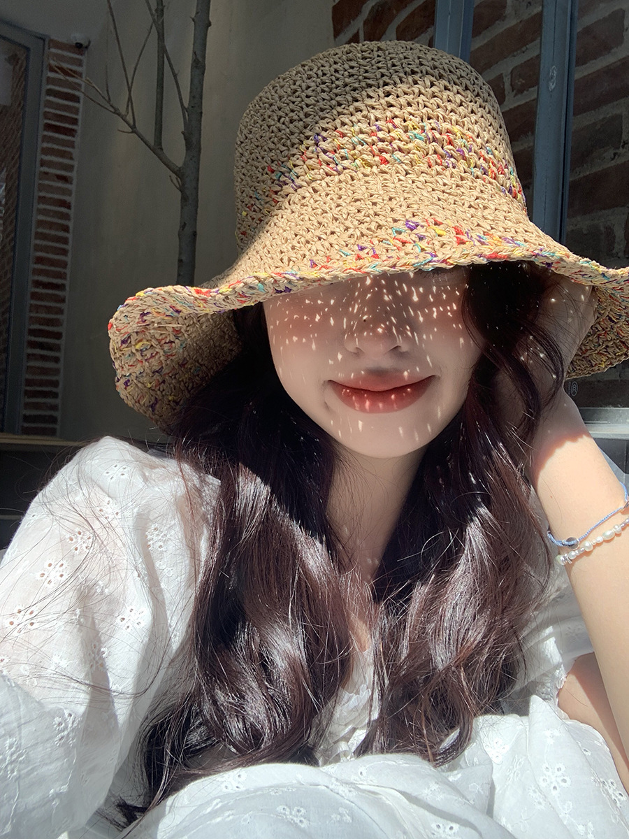 2023 夏季镂空防晒遮阳帽透气不闷热彩色度假风宽檐编织草帽女