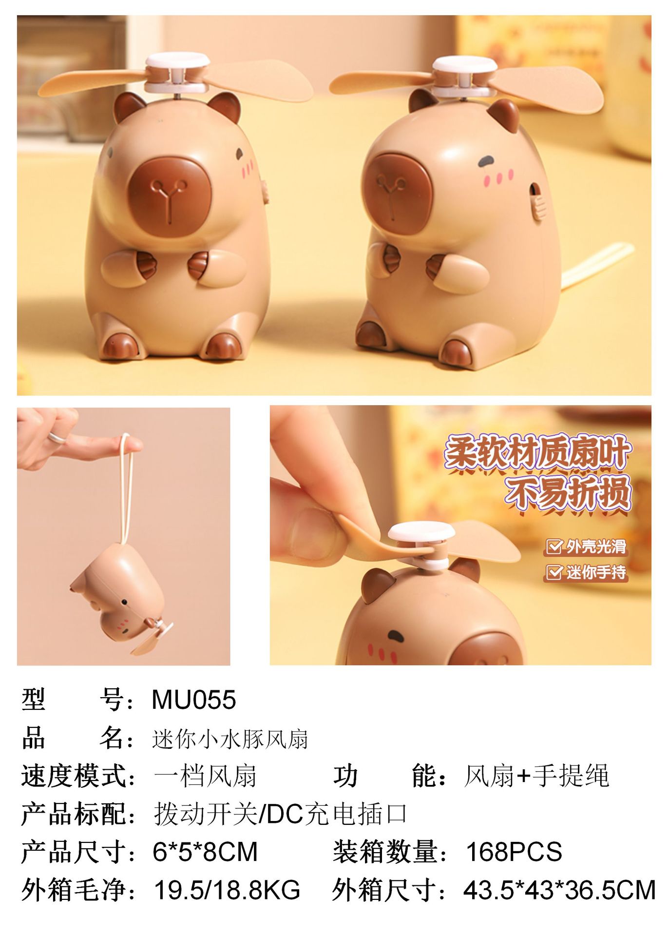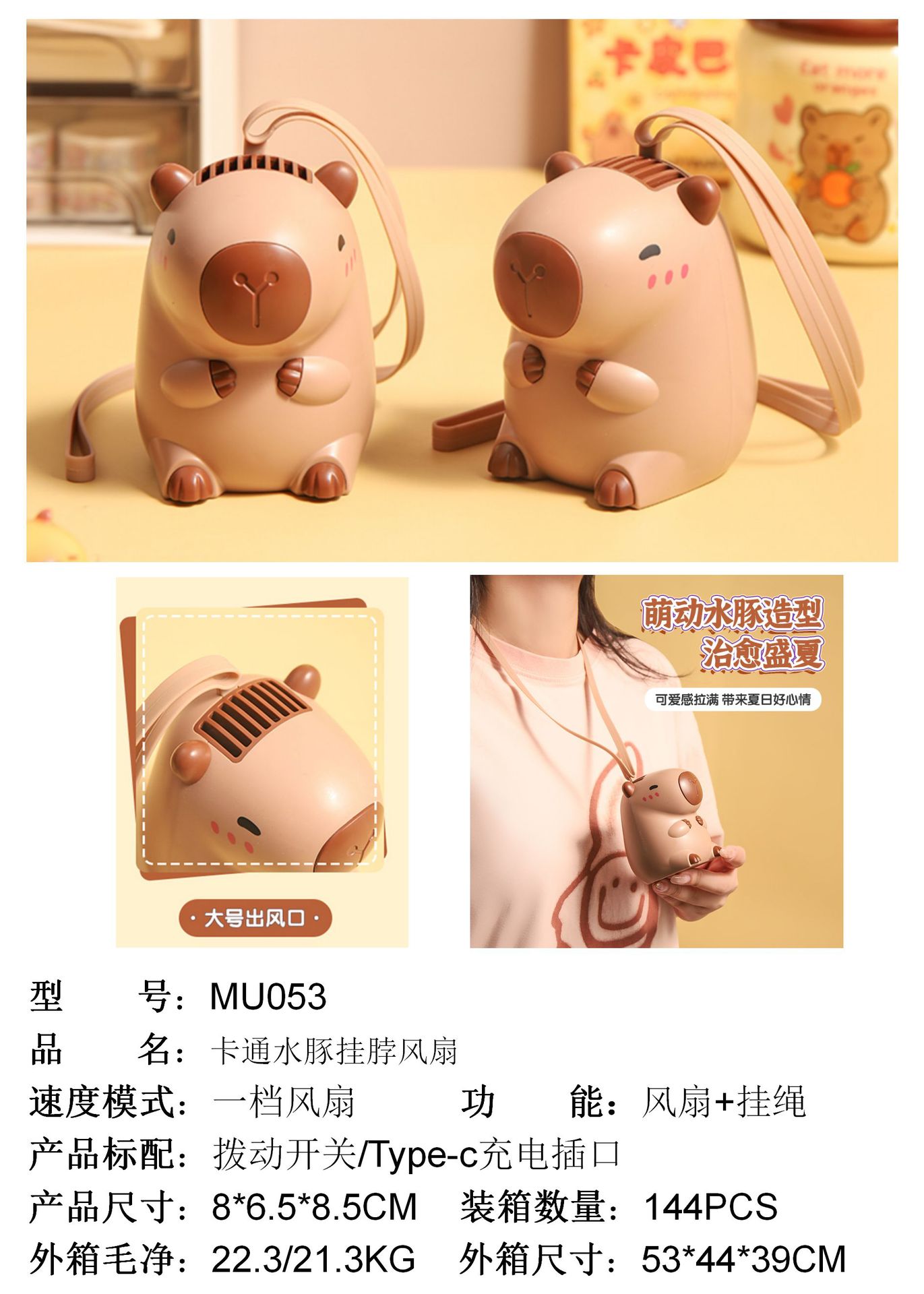 夏日创意新品卡通水豚挂脖风扇迷你便携式USB充电随身挂绳电风扇