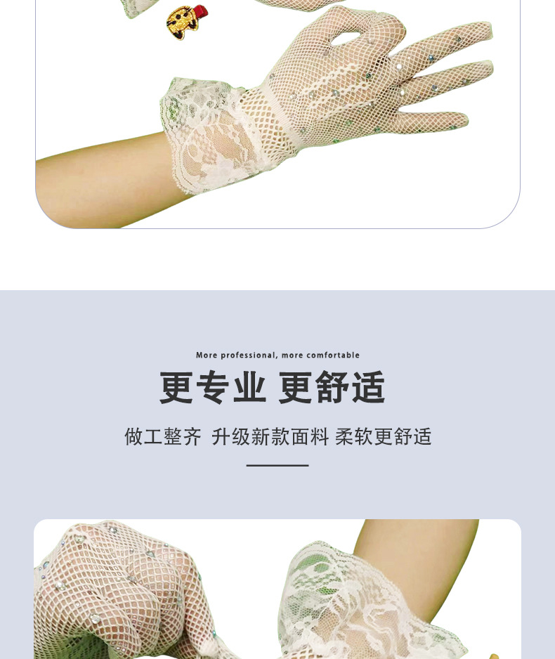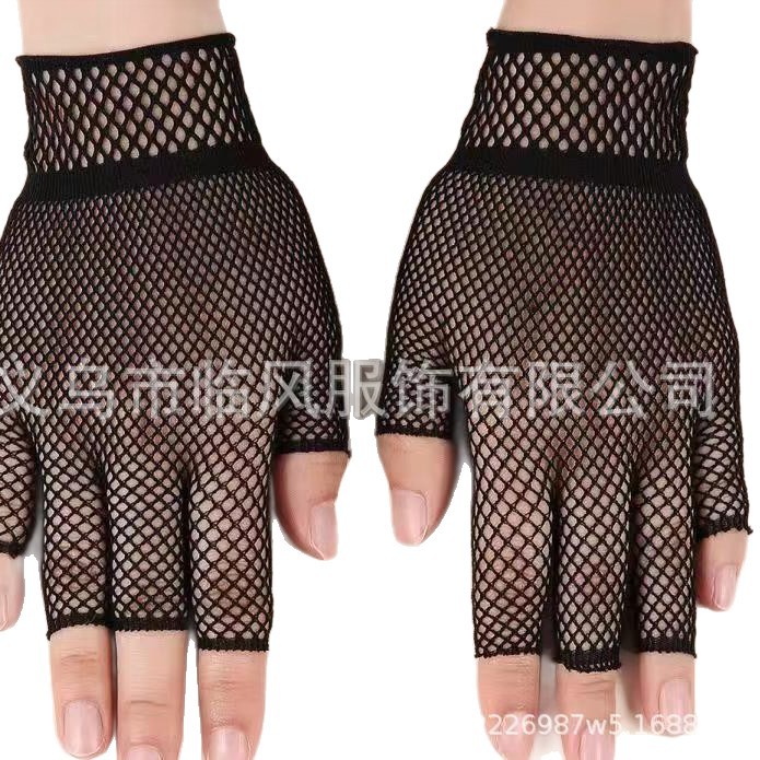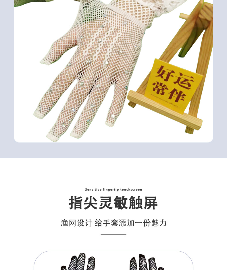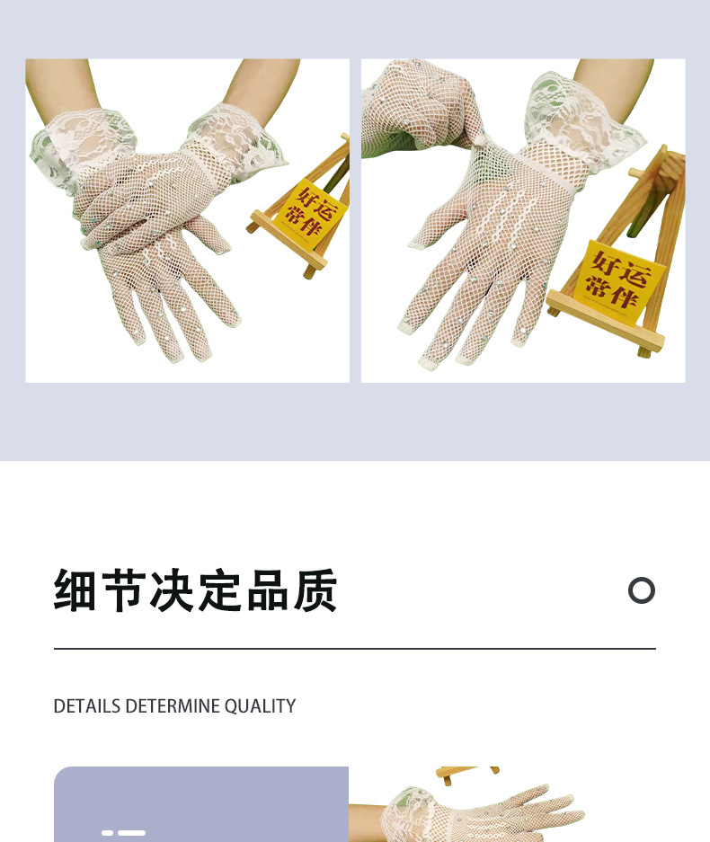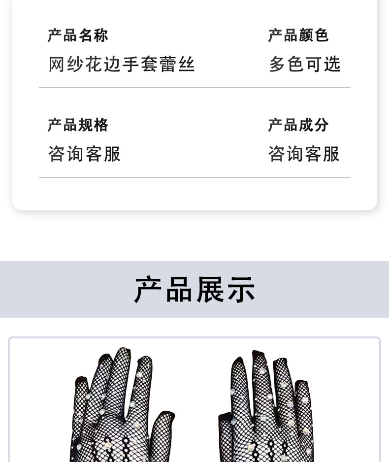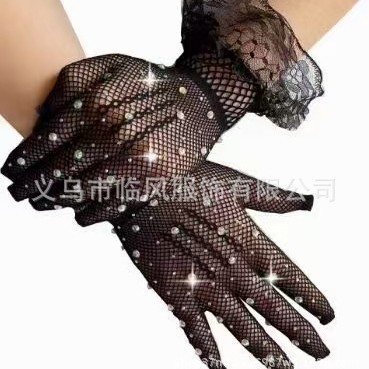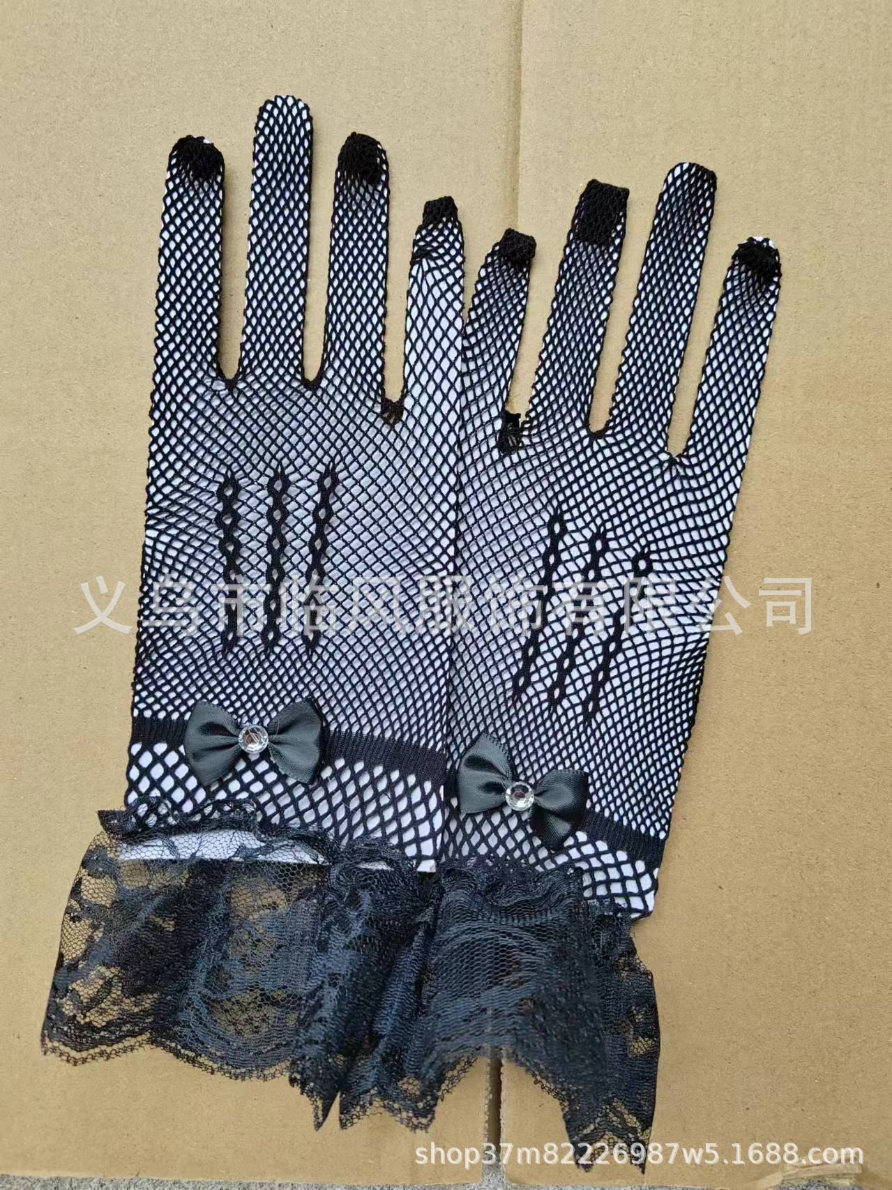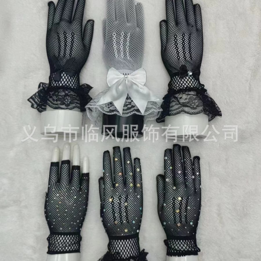 跨境薄款网眼手套女镂空夏天黑色弹力蕾丝烫钻旗袍跳舞蝴蝶结短款