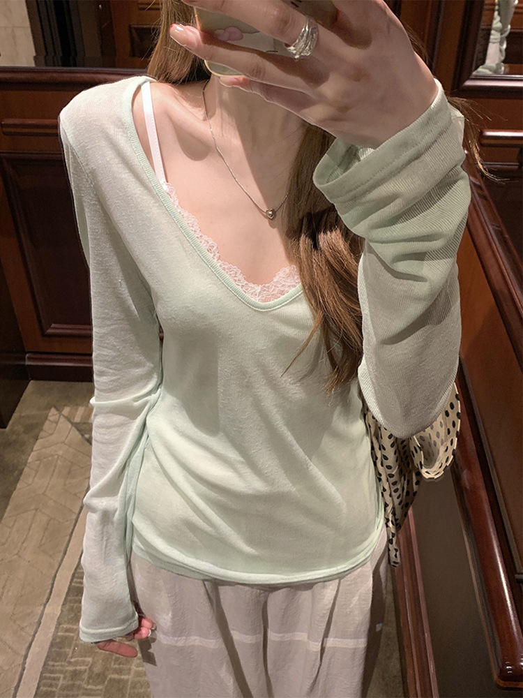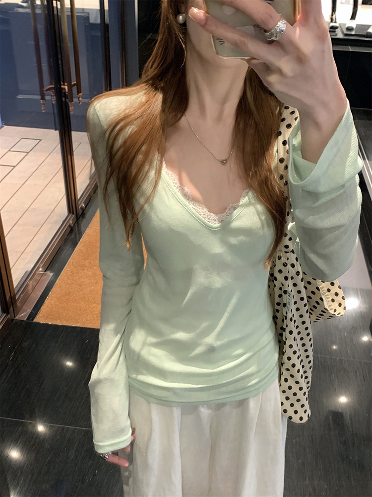 薄荷曼波风绿色v领长袖T恤女氛围感叠穿慵懒休闲气质防晒罩衫上衣