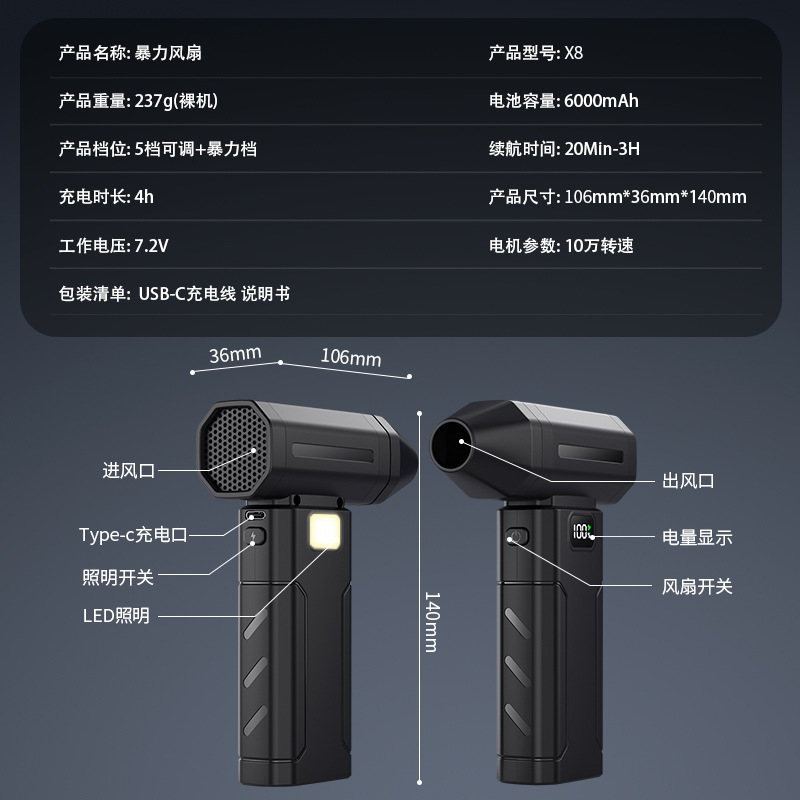 X8暴力涡轮风扇手持USB充电高速迷你风扇 车内户外露营暴力吹风扇