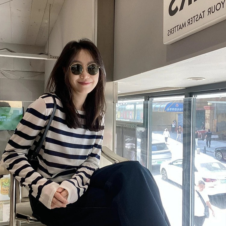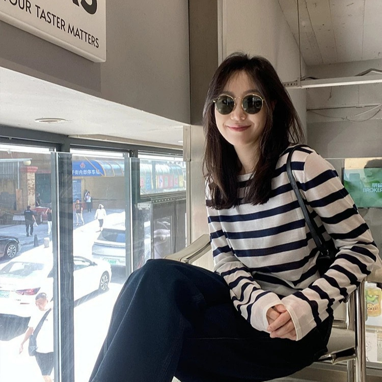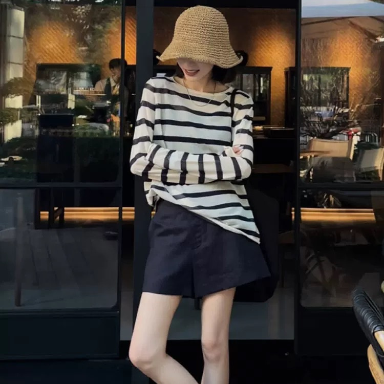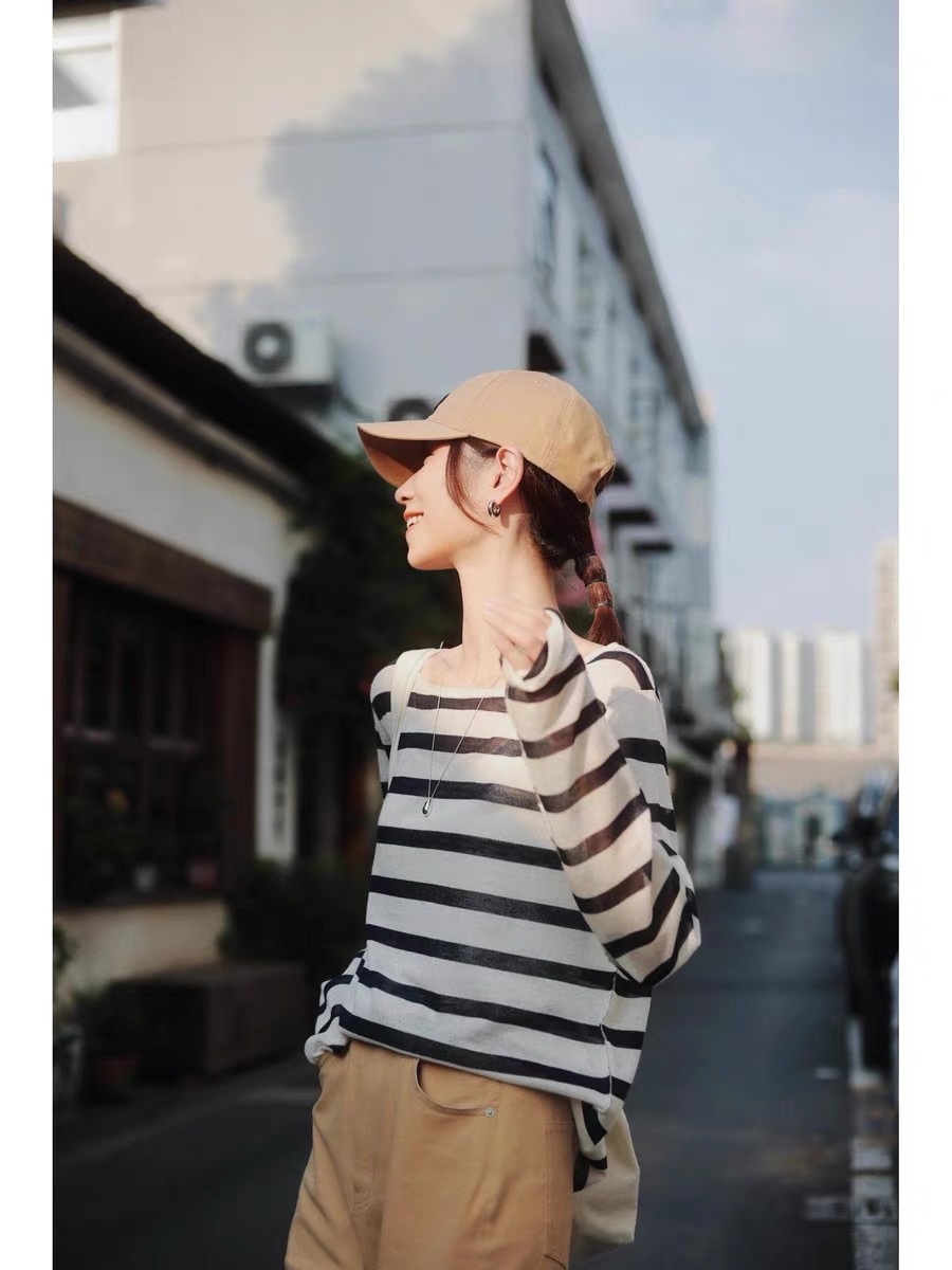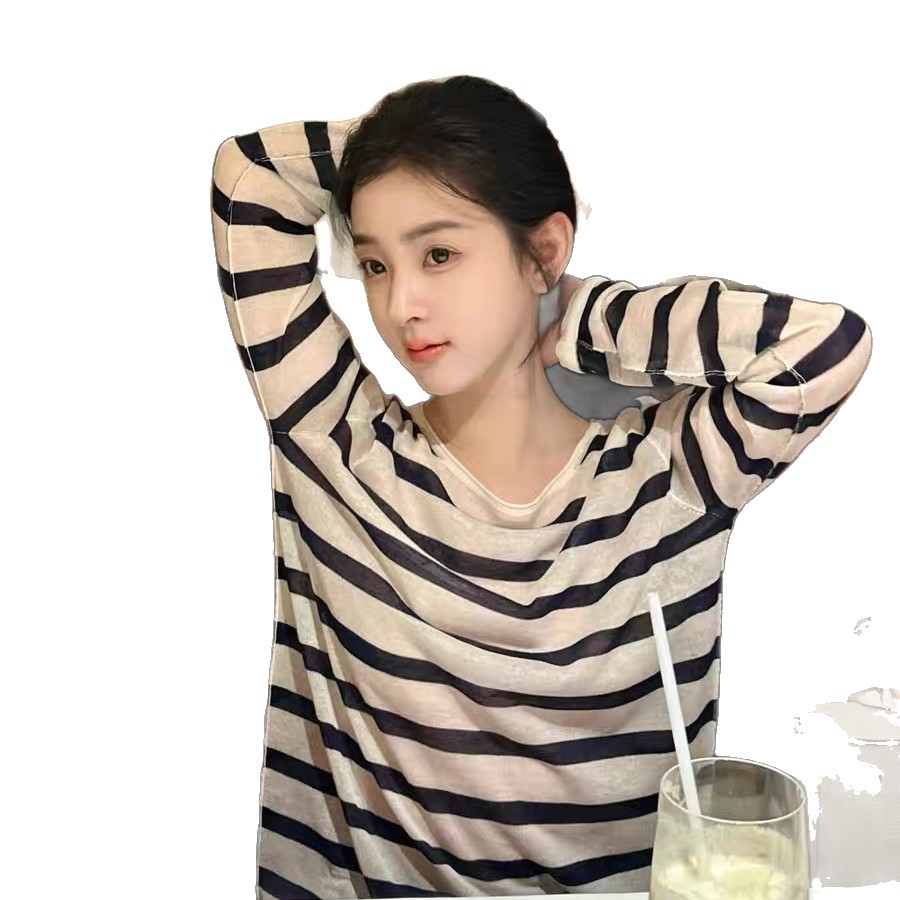 100%天丝莱赛尔撞色黑白条纹针织衫女25夏新薄款长袖防晒上衣宽松