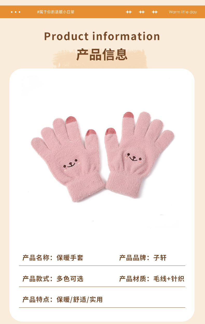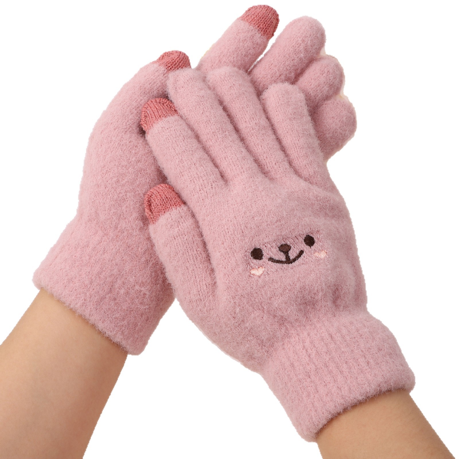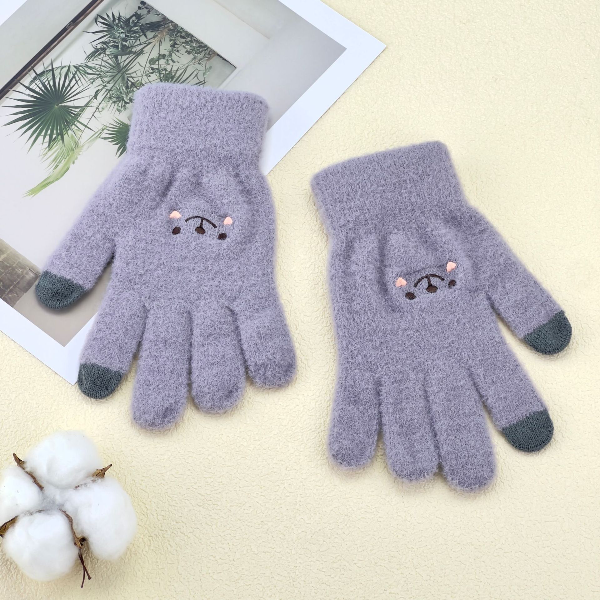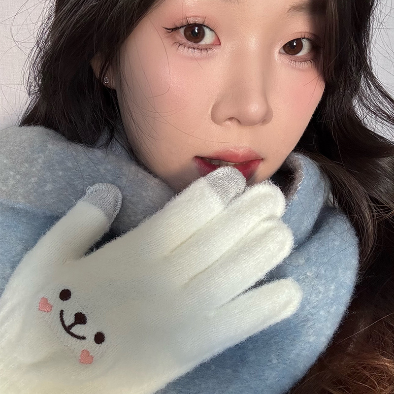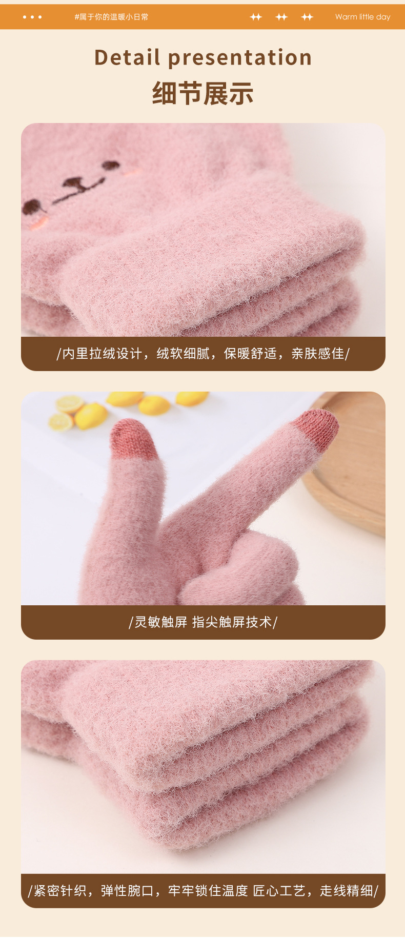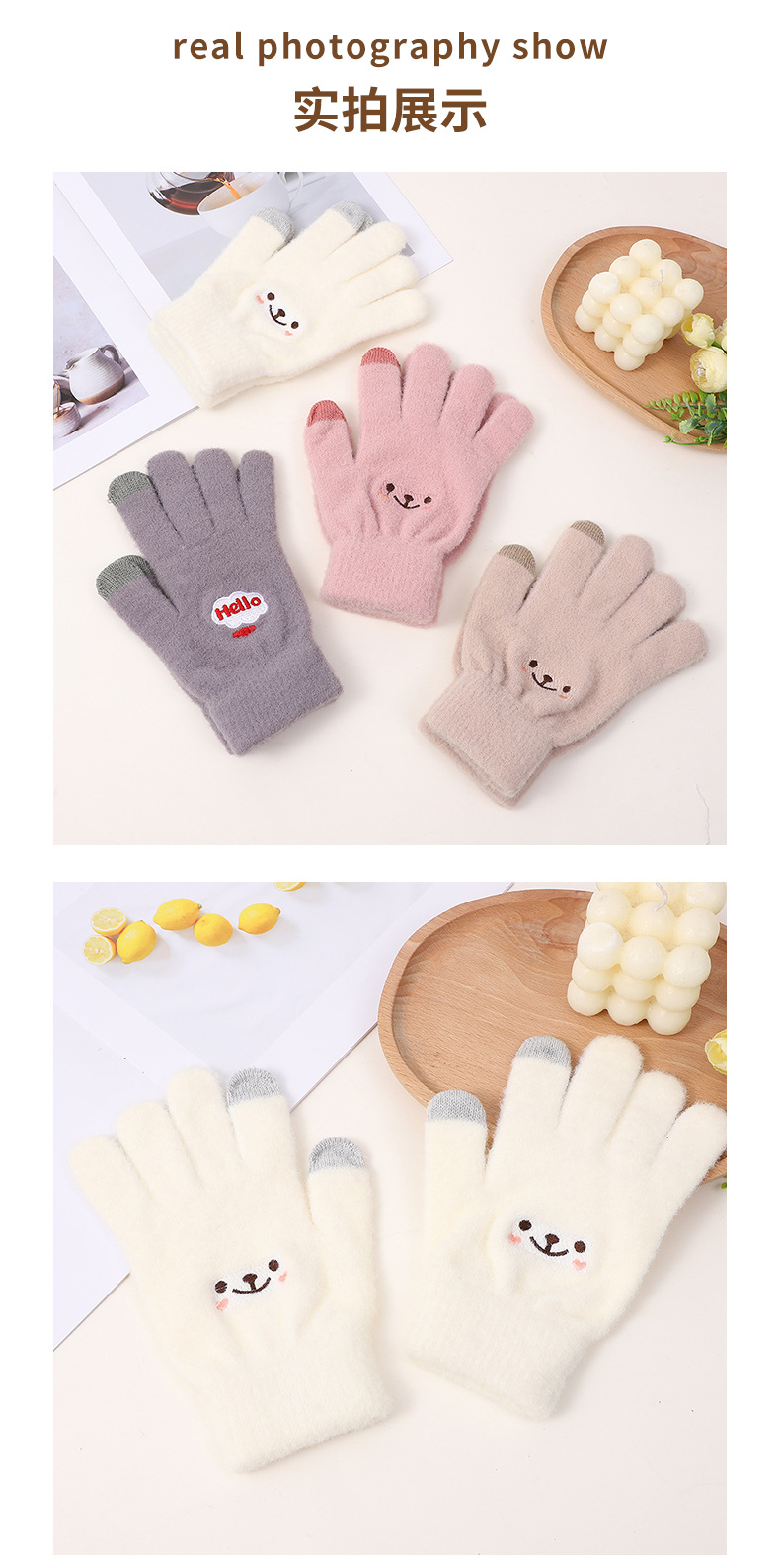 秋冬季可爱笑脸熊保暖手套女卡通触屏骑行手套百搭刺绣男针织手套