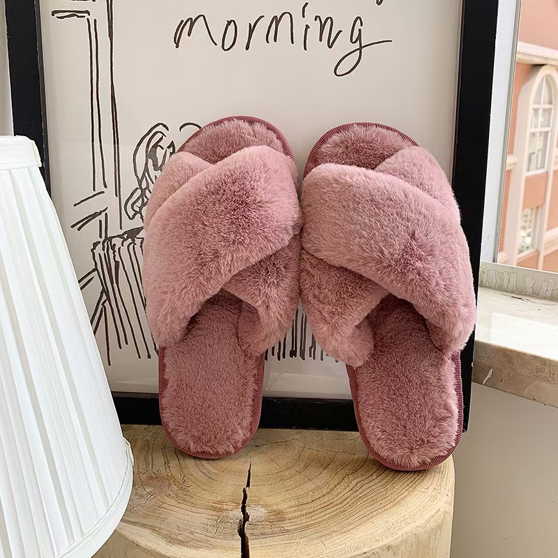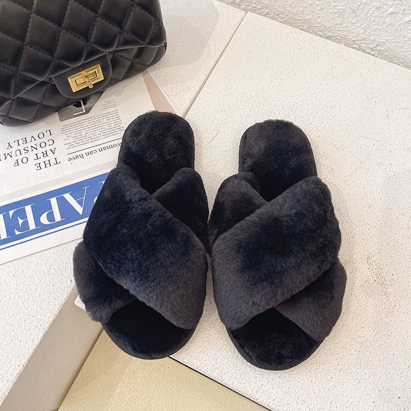 秋冬毛绒绒时尚家居交叉露趾外穿毛毛拖鞋女平底防滑棉拖保暖女鞋