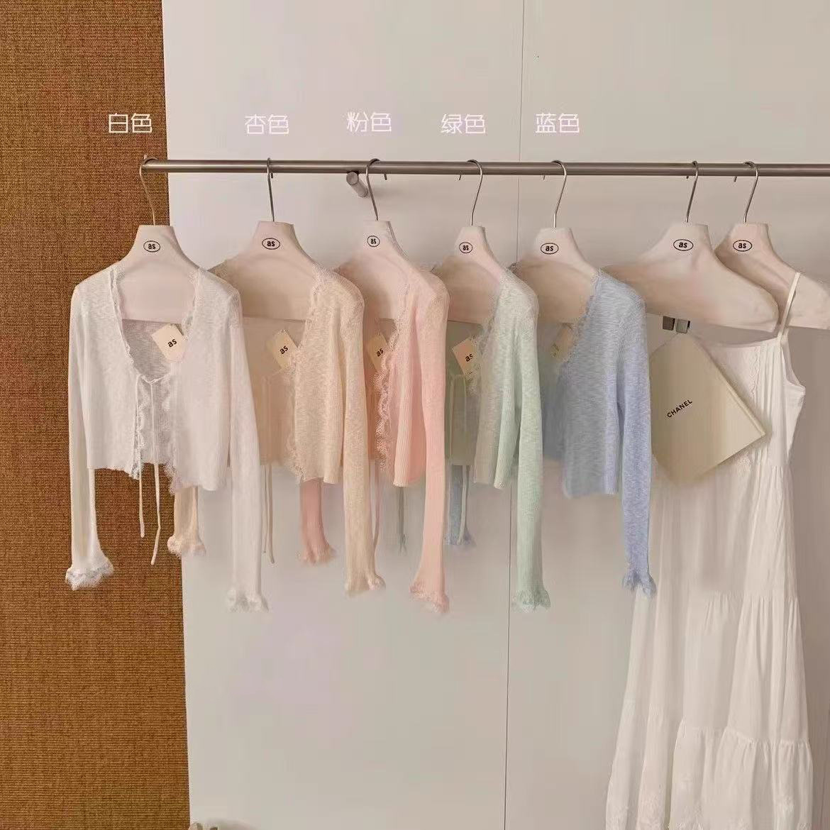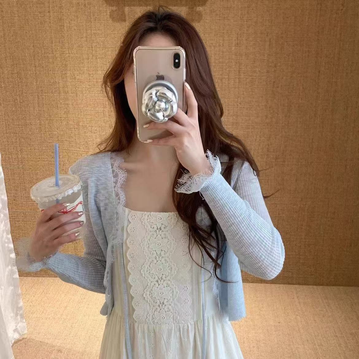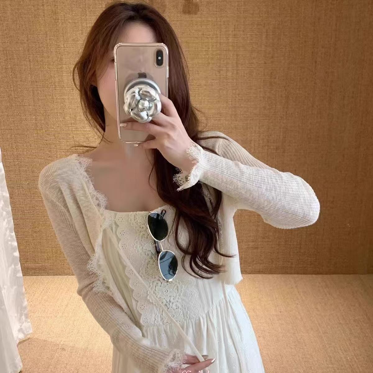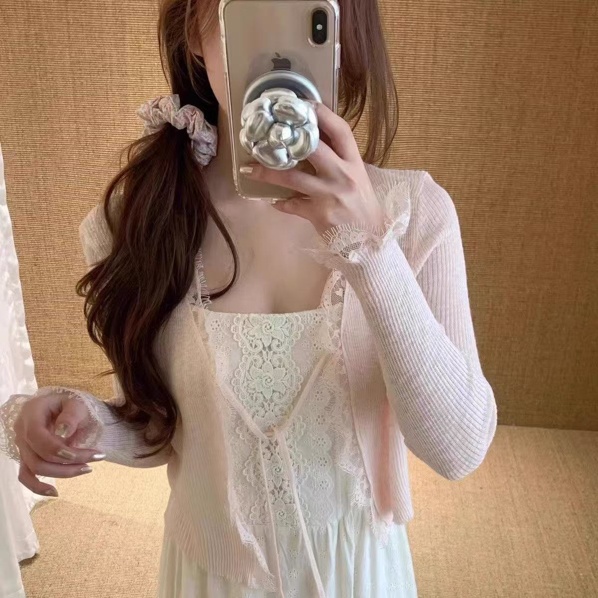 蕾丝拼接系带冰丝针织开衫女春季法式披肩外搭防晒罩衫配裙子上衣