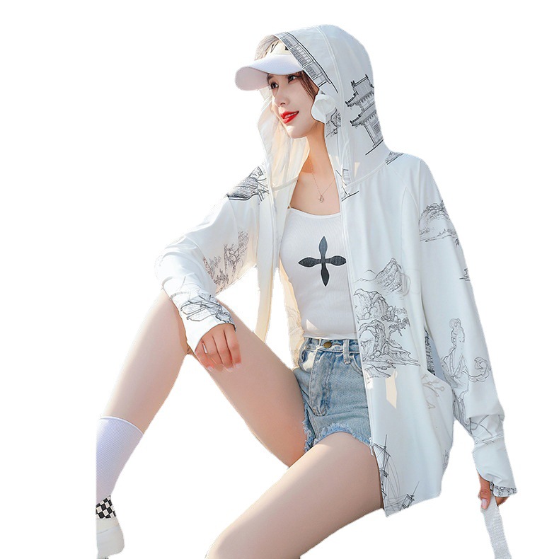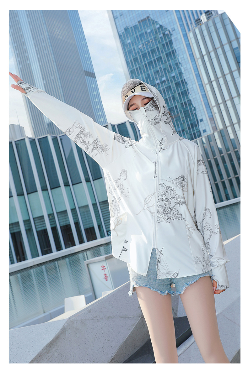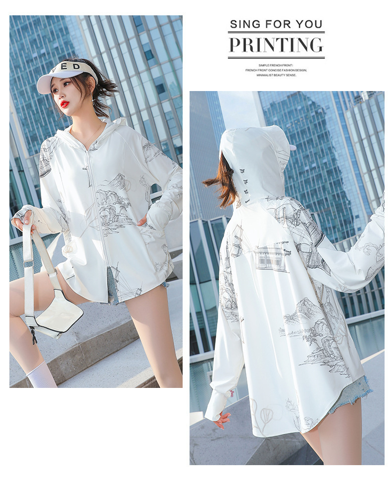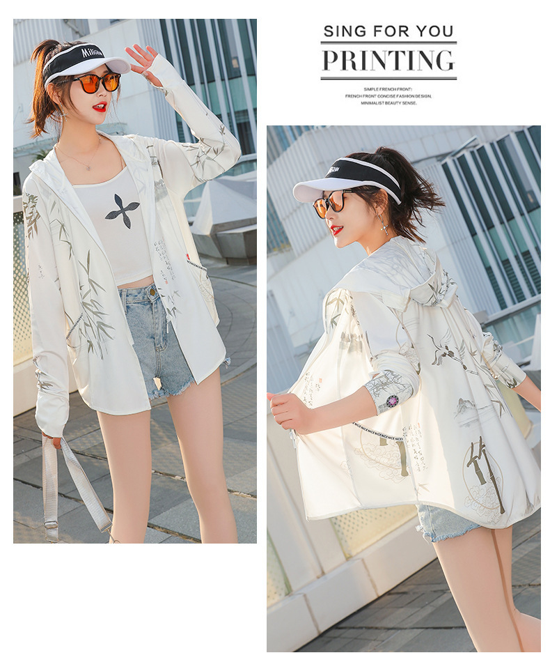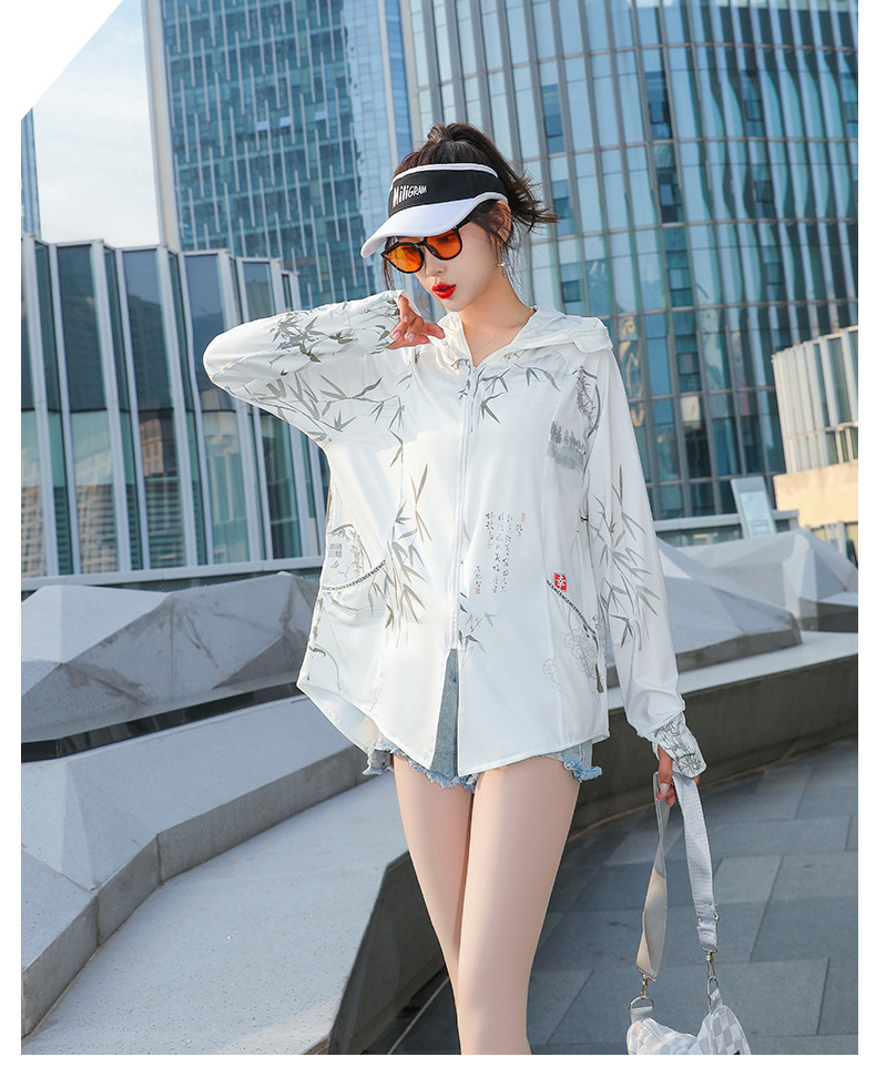 夏季新款印花国风冰丝女防紫外线长袖超薄款外套连帽透气防晒衣