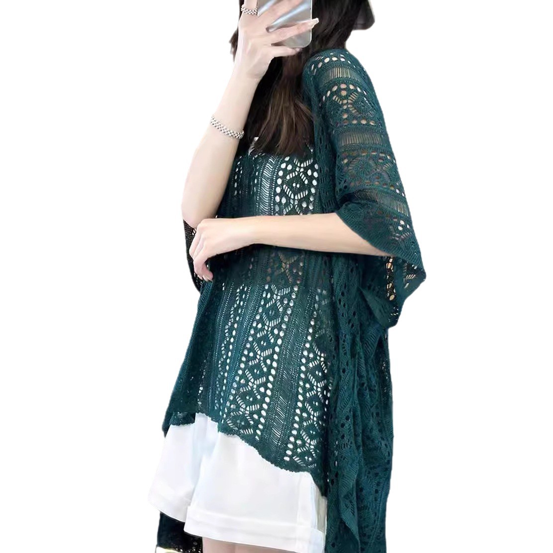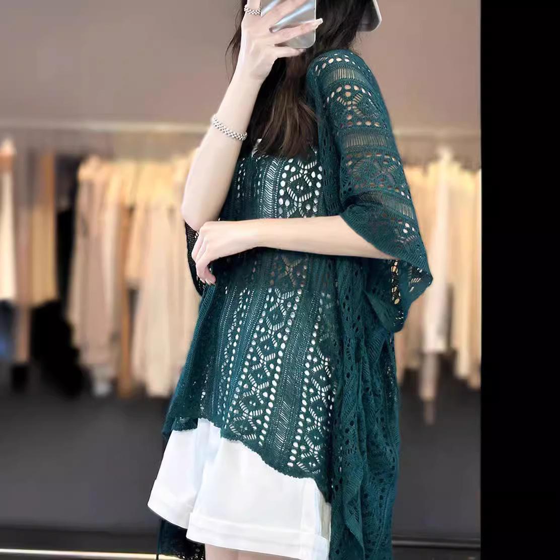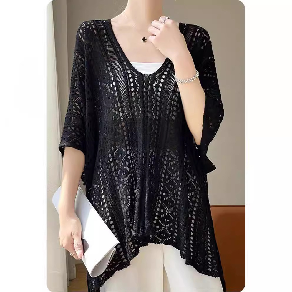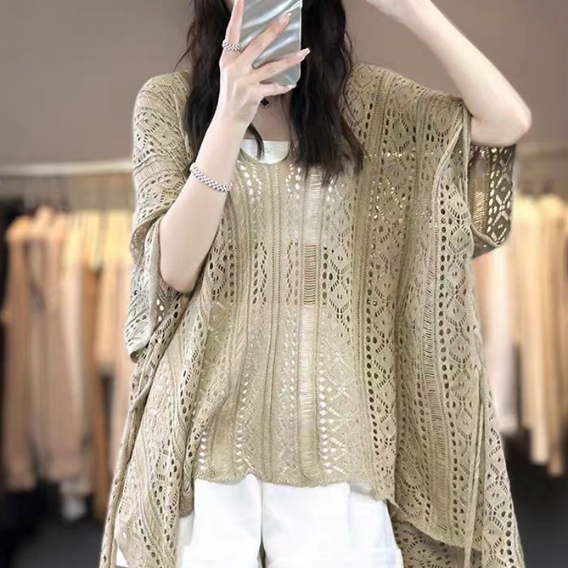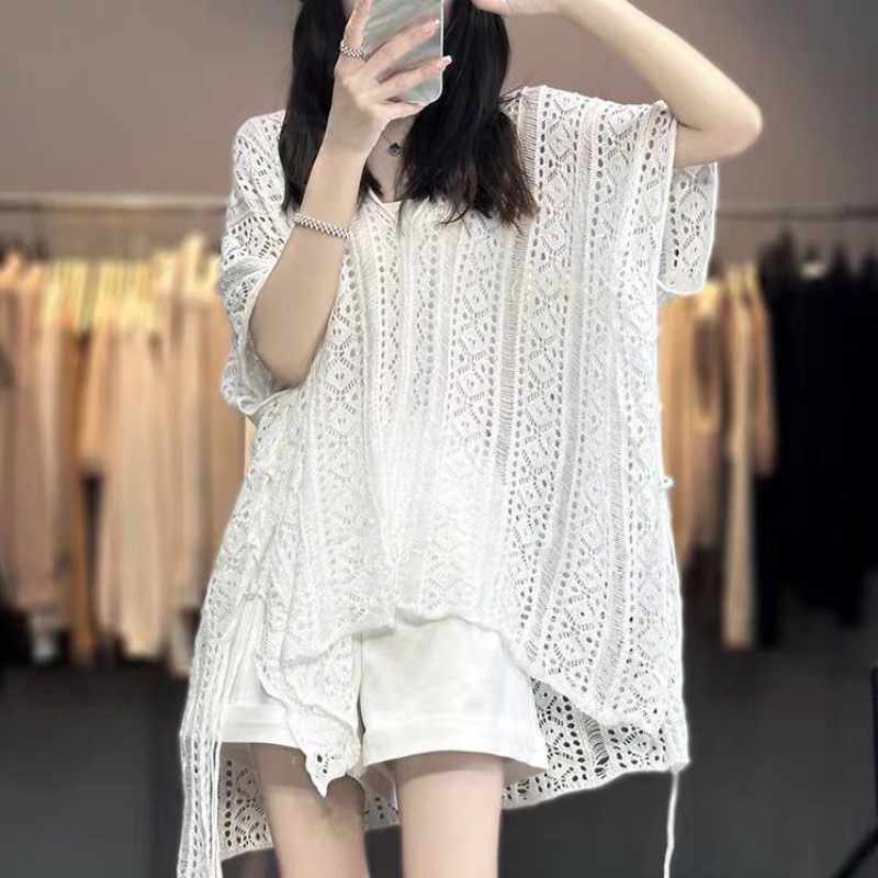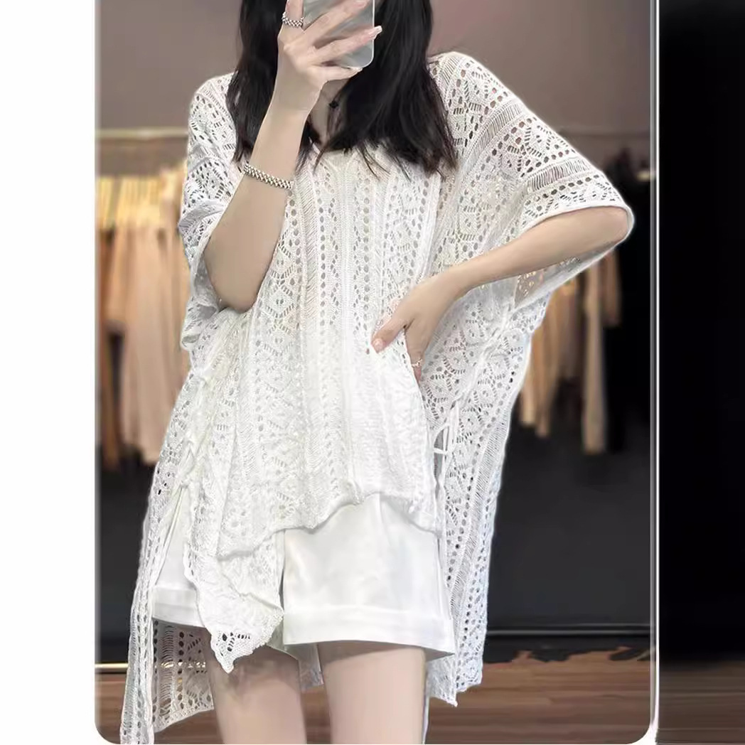 韩国日系夏日镂空系带上衣针织镂空宽松慵懒罩衫针织短袖防晒衫女