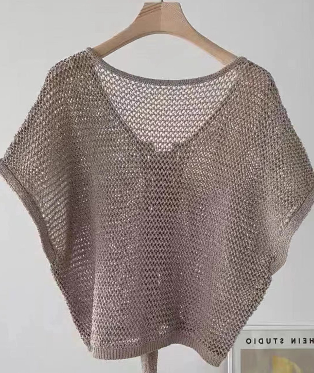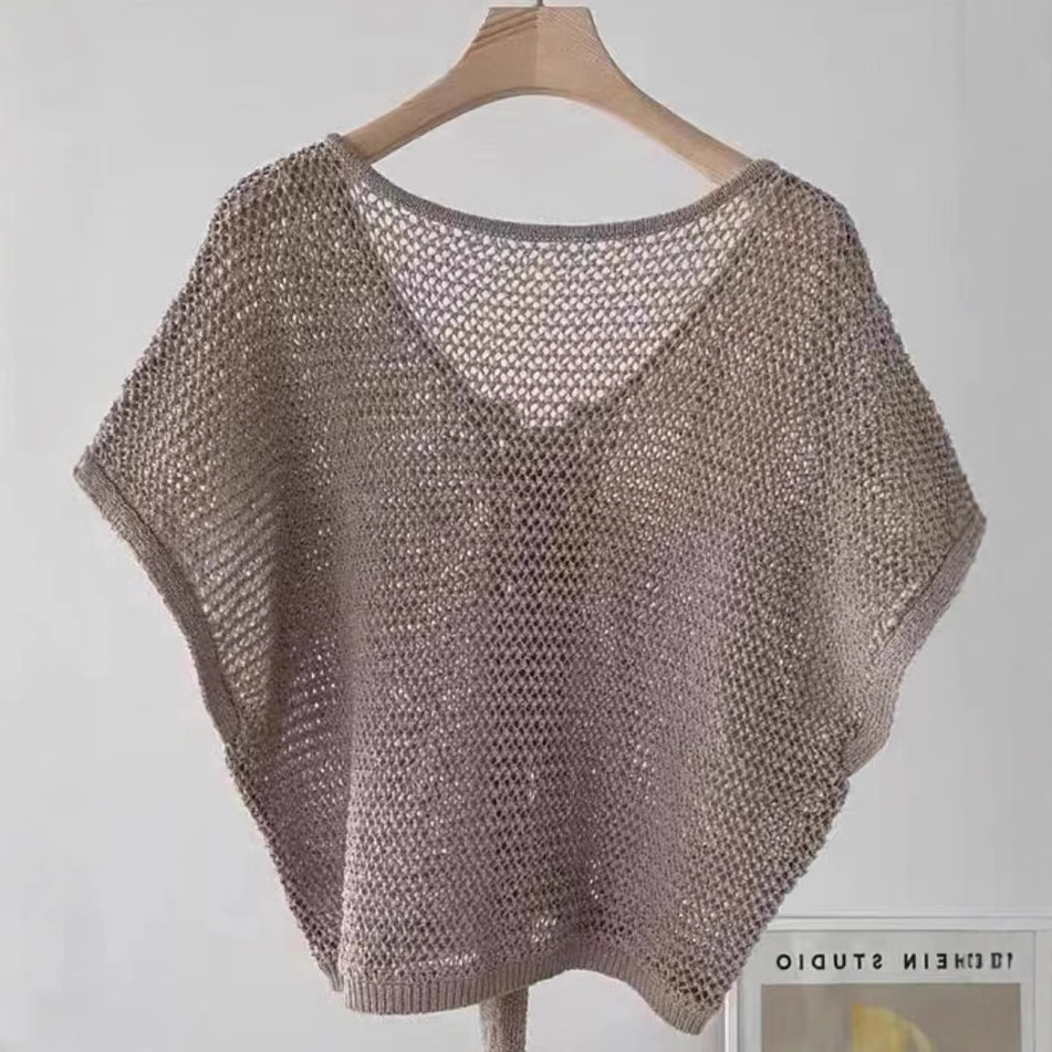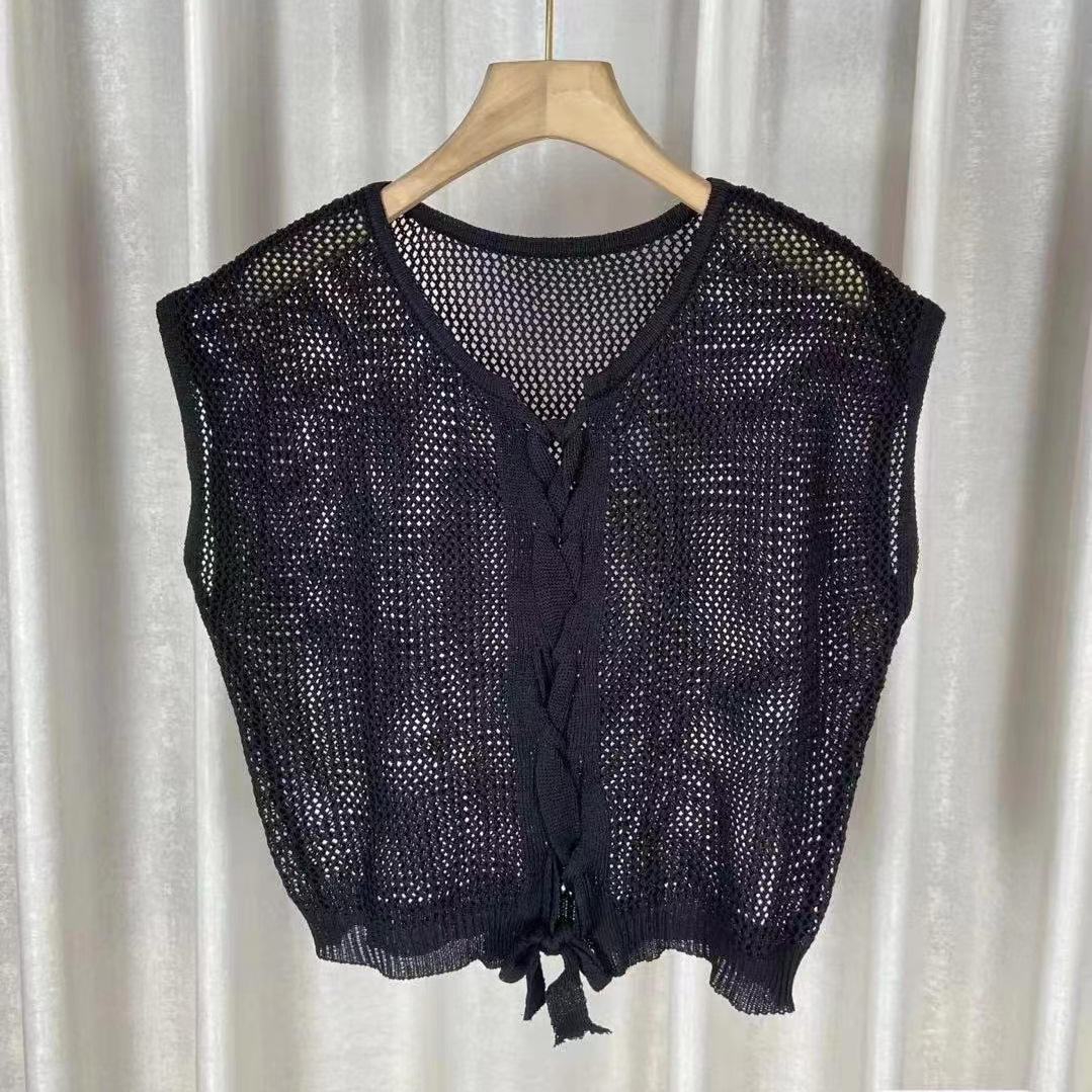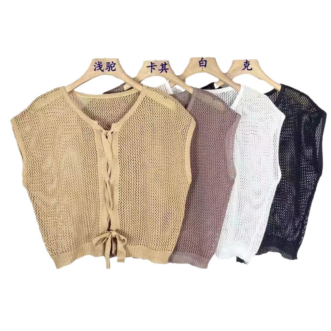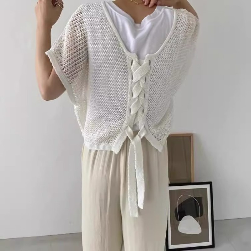 韩版复古镂空针织小开衫女夏季薄款宽松外穿绑带防晒罩衫短款上衣