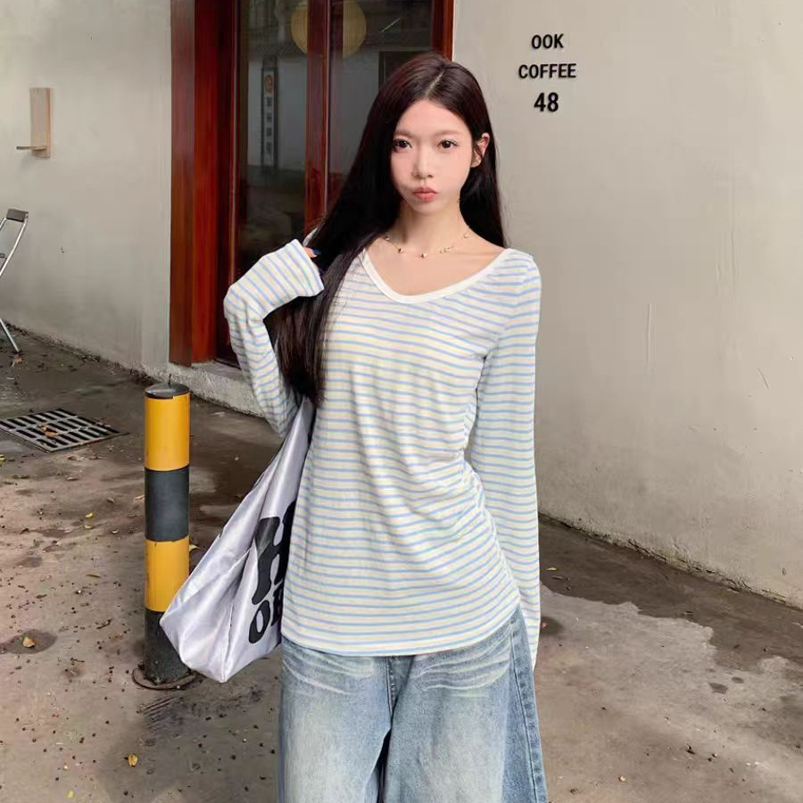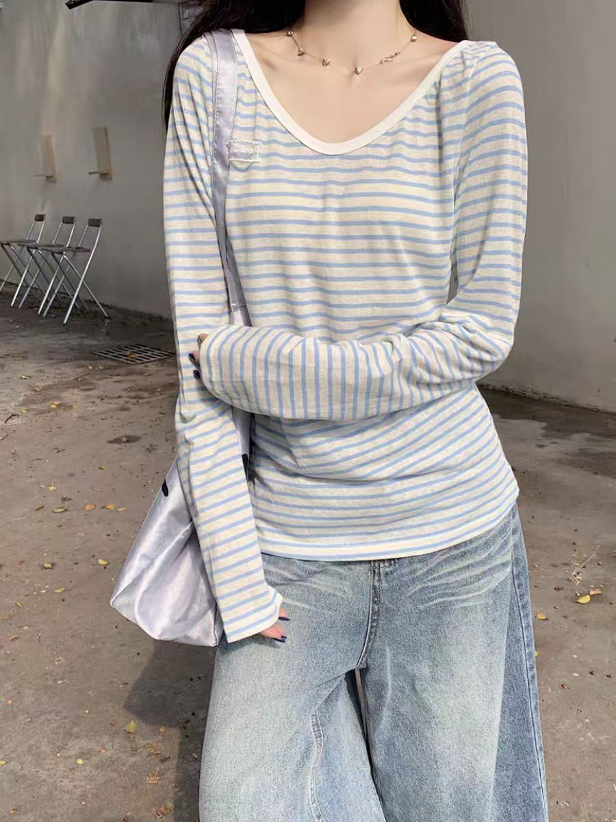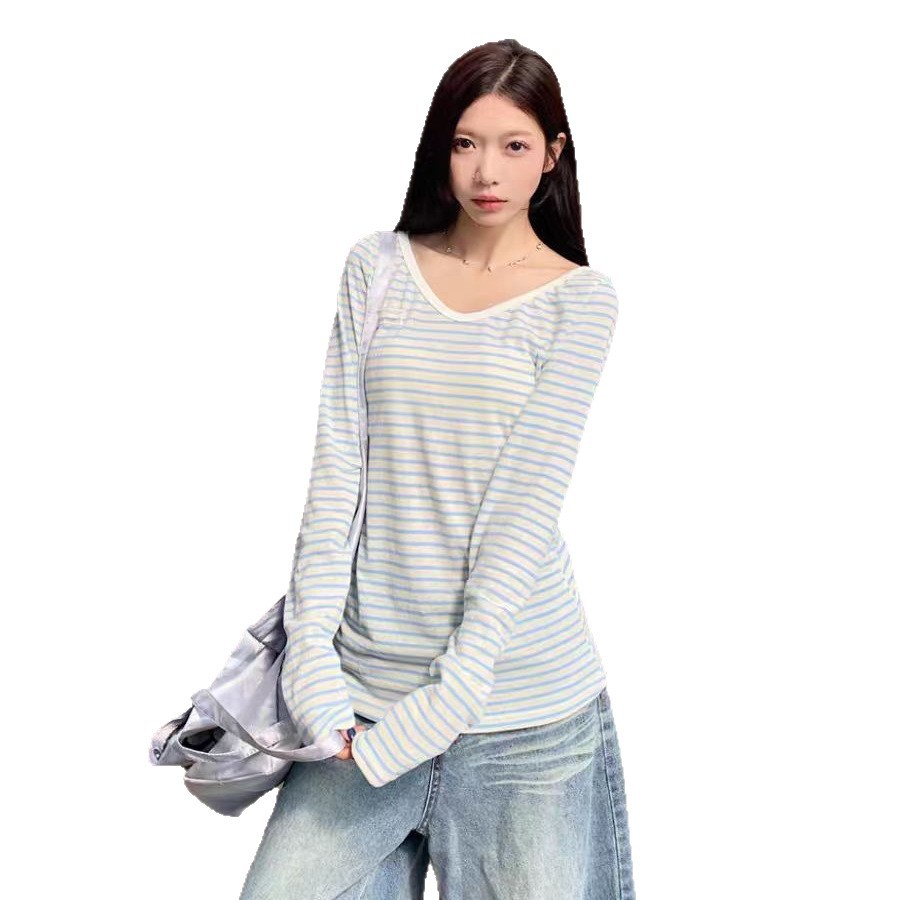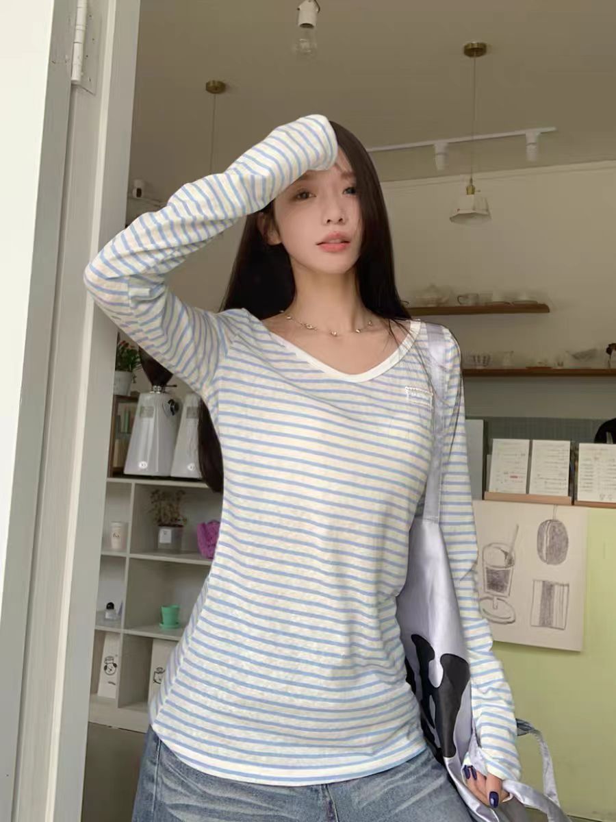 野媛复古条纹v领防晒罩衫女夏季小众学生修身百搭潮流防晒服上衣