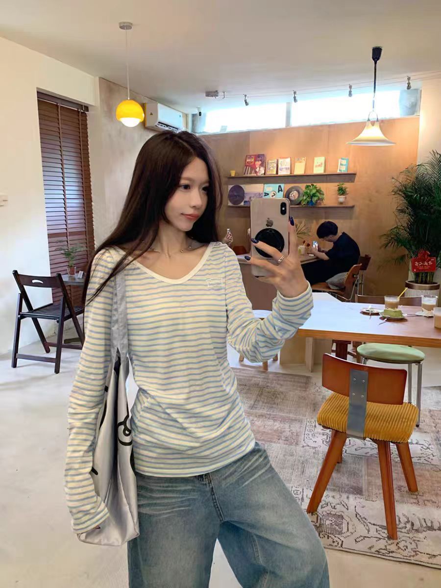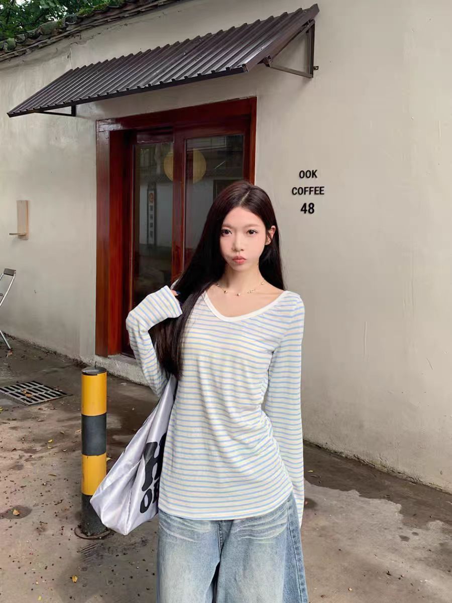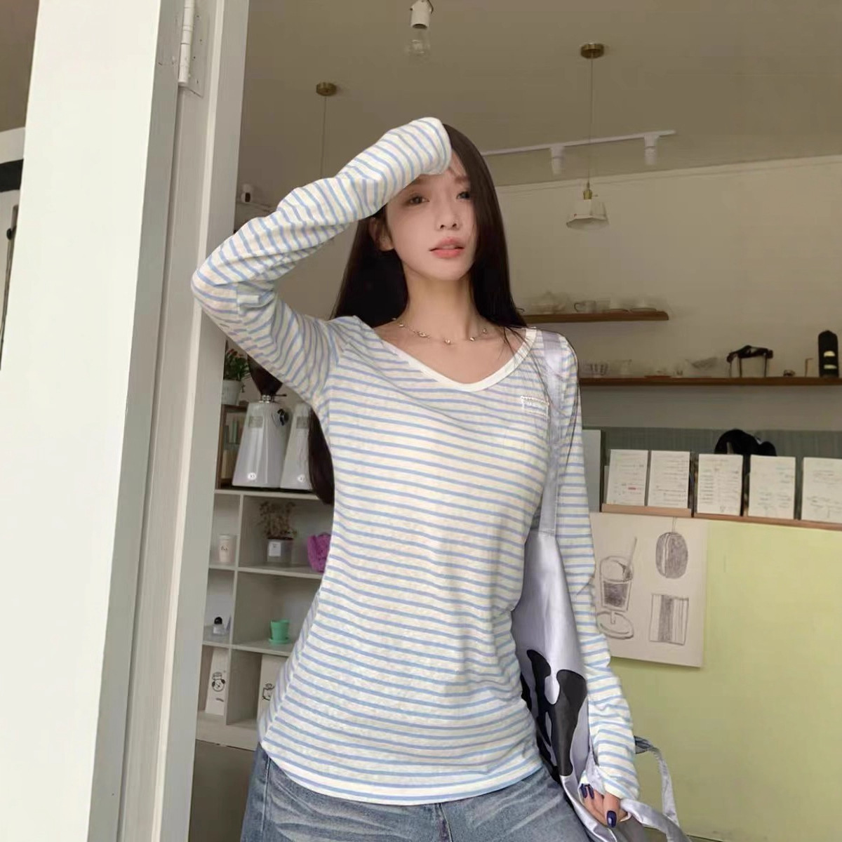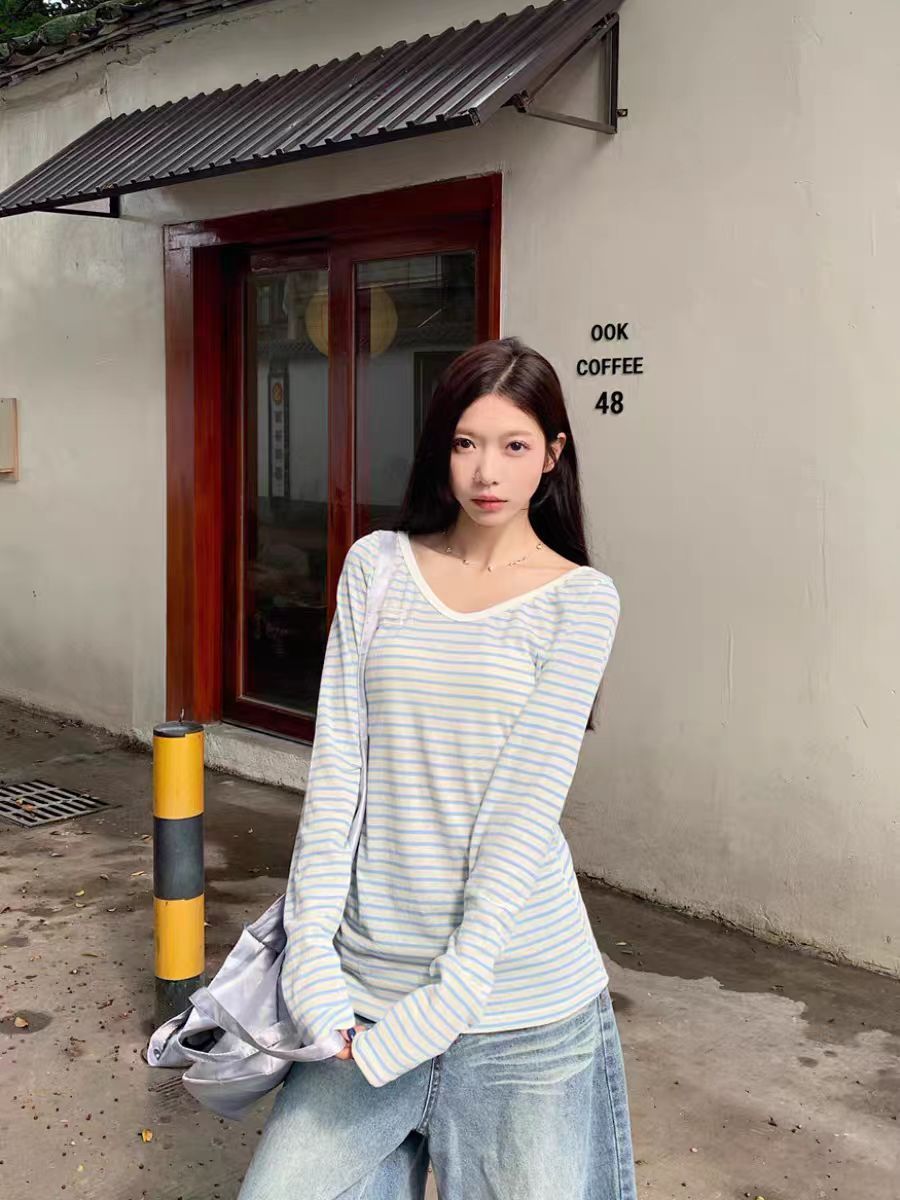 野媛复古条纹v领防晒罩衫女夏季小众学生修身百搭潮流防晒服上衣