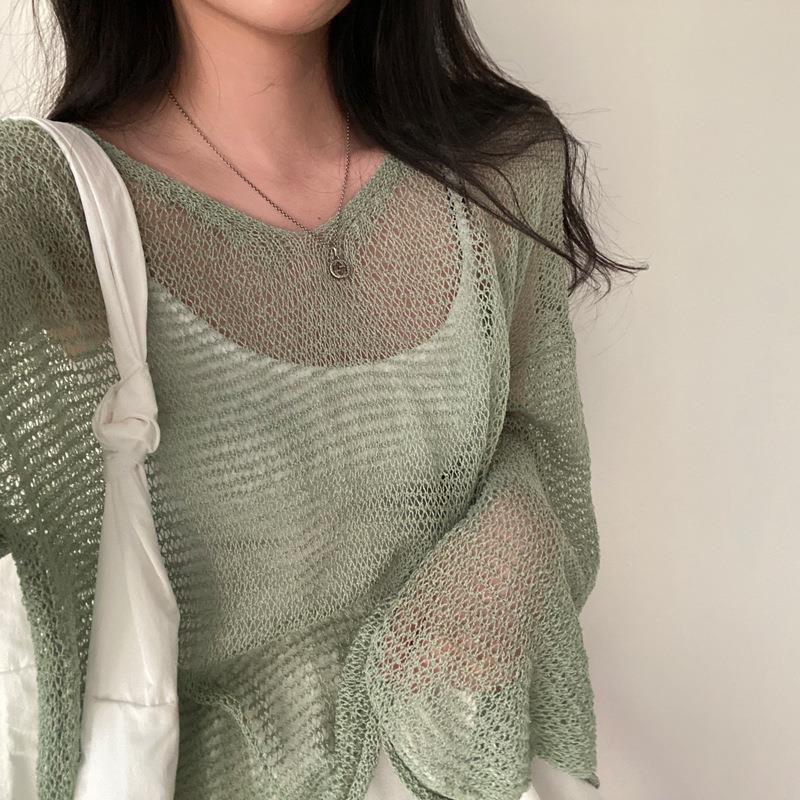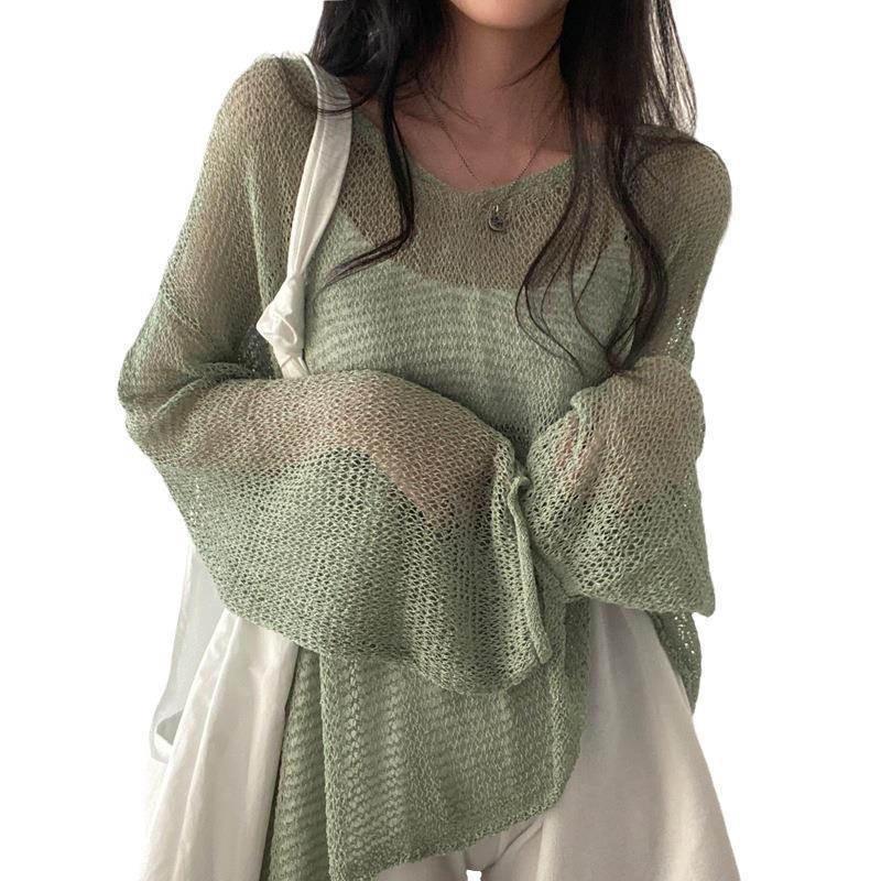 韩国chic夏季法式复古慵懒风宽松长袖镂空薄款针织防晒罩衫上衣女