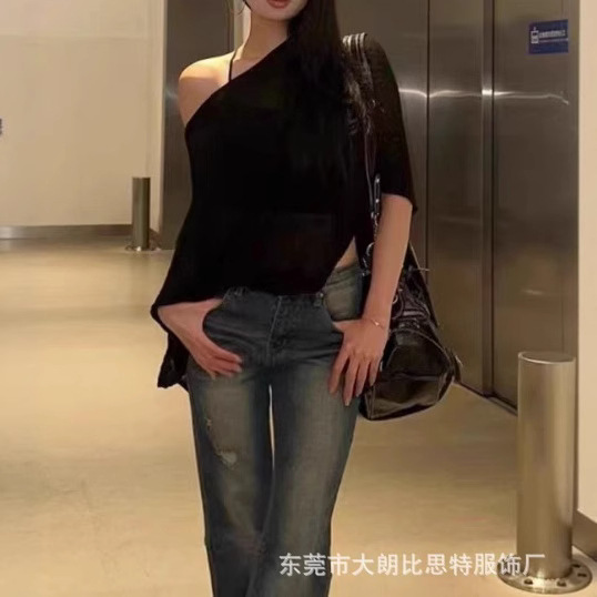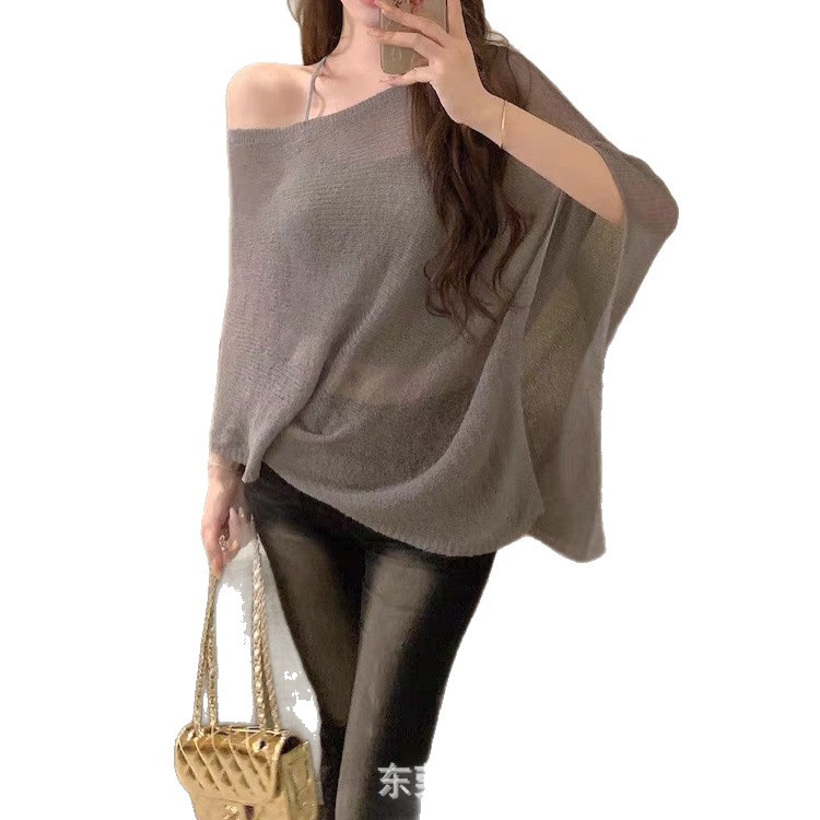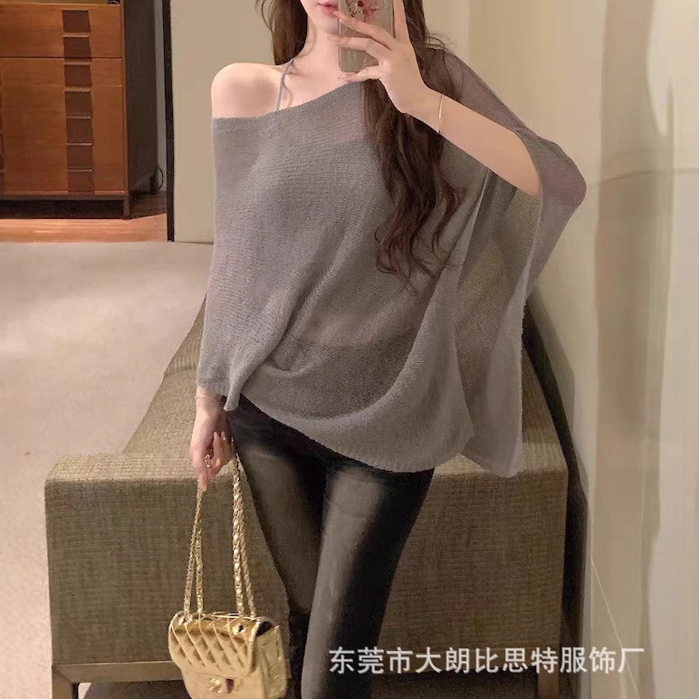 辣妹不规则冰丝薄款蝙蝠袖针织上衣女慵懒设计感一字肩镂空防晒衫