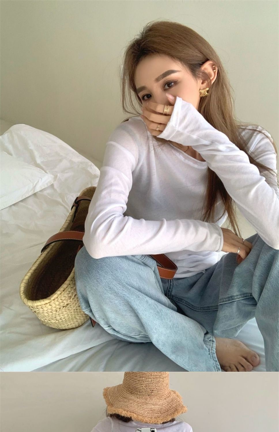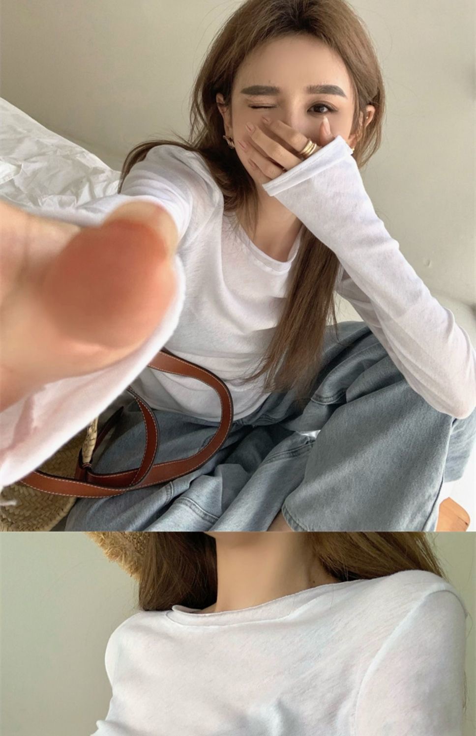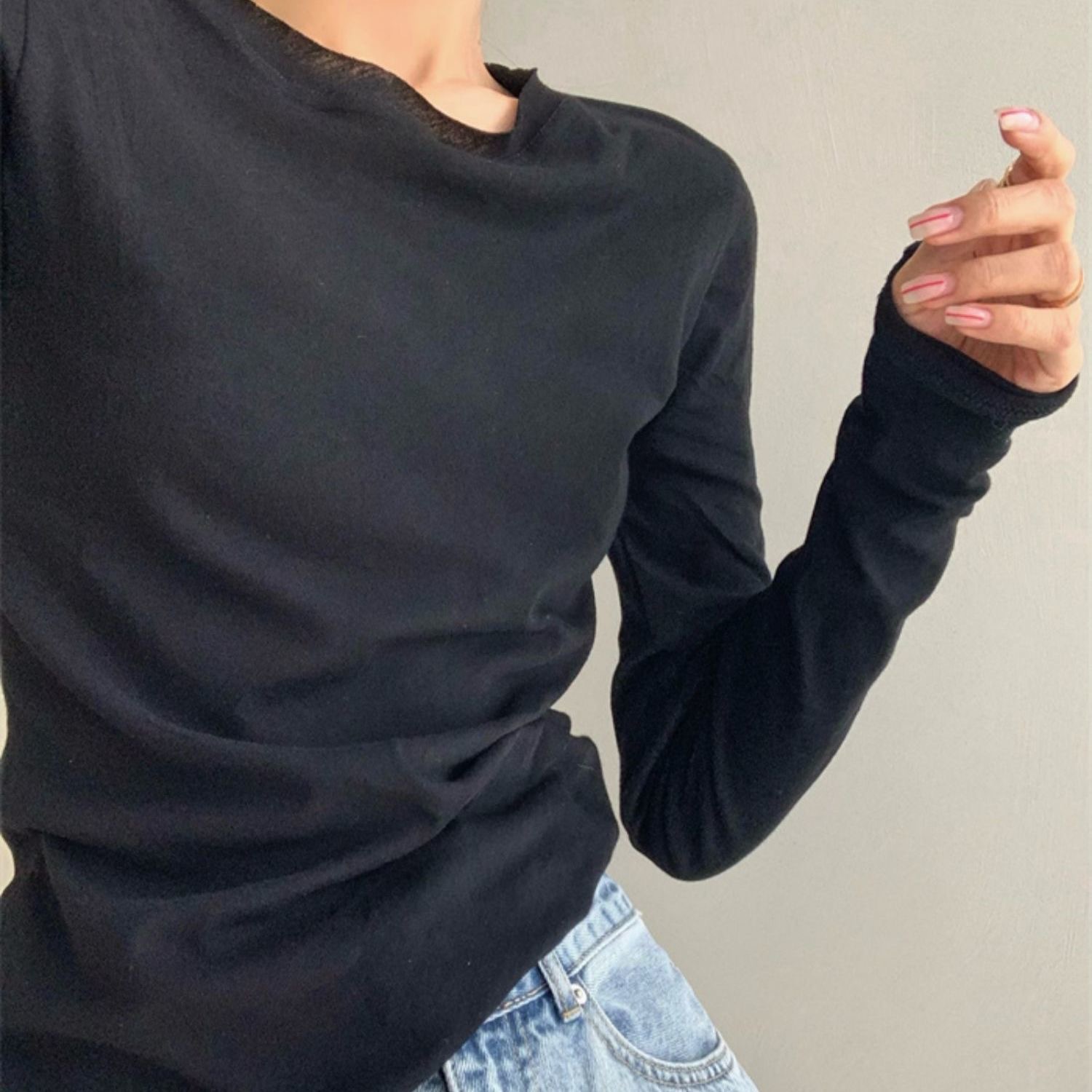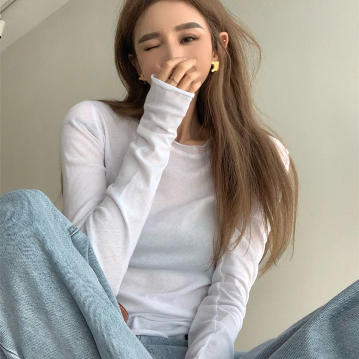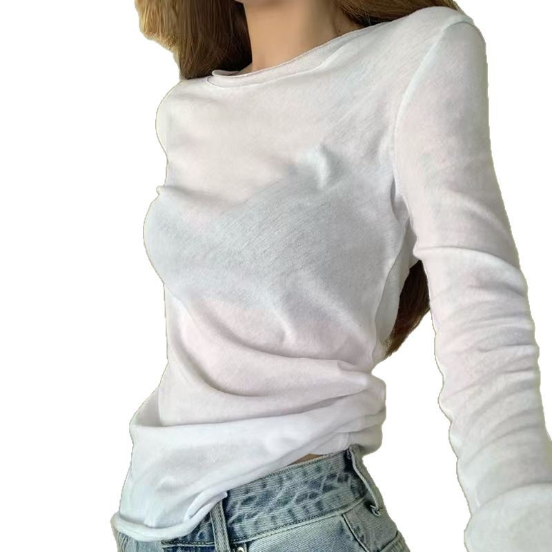 夏季新款百搭纯色宽松圆领长袖冰丝防晒T恤打底衫女韩版修身上衣